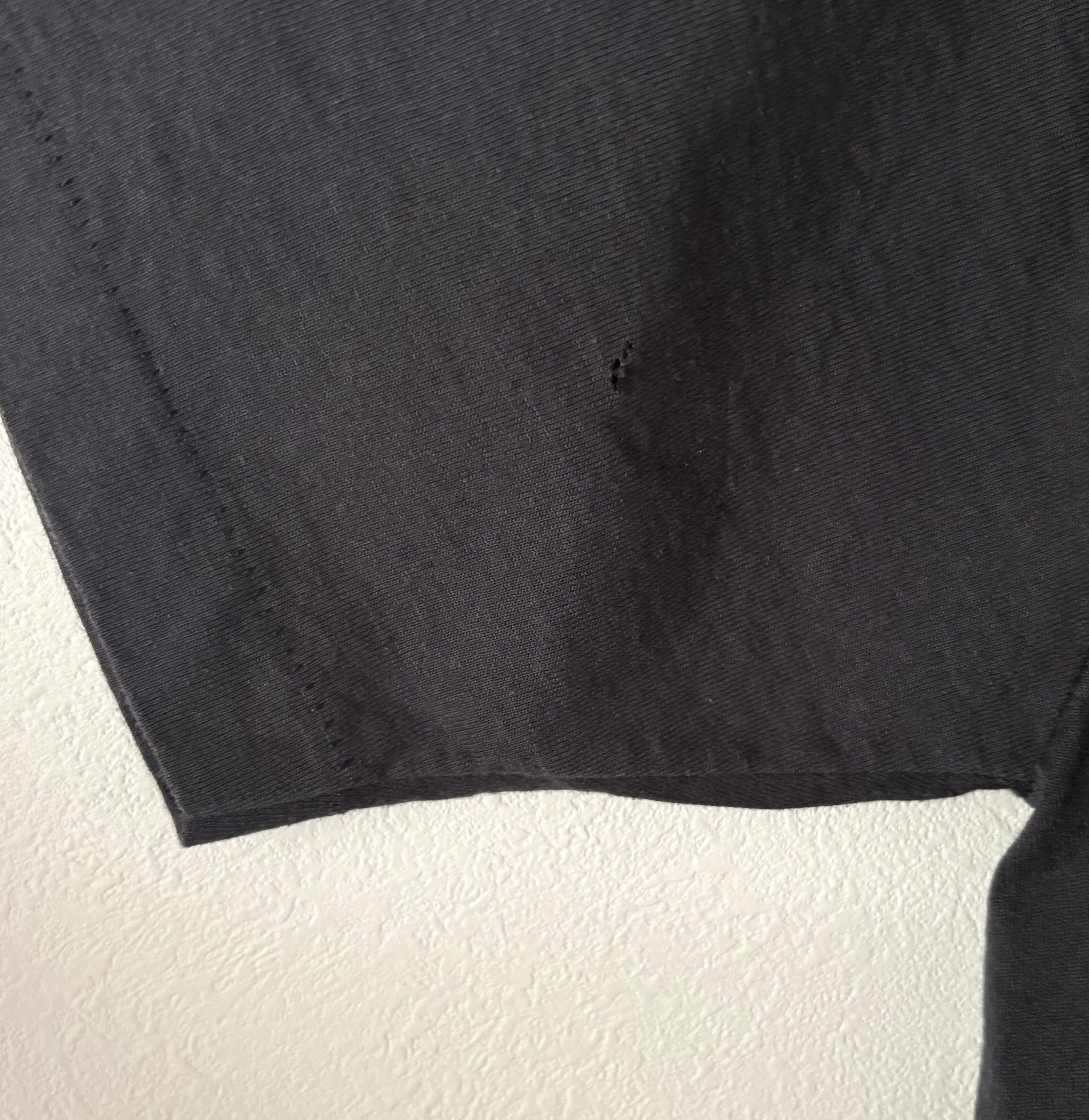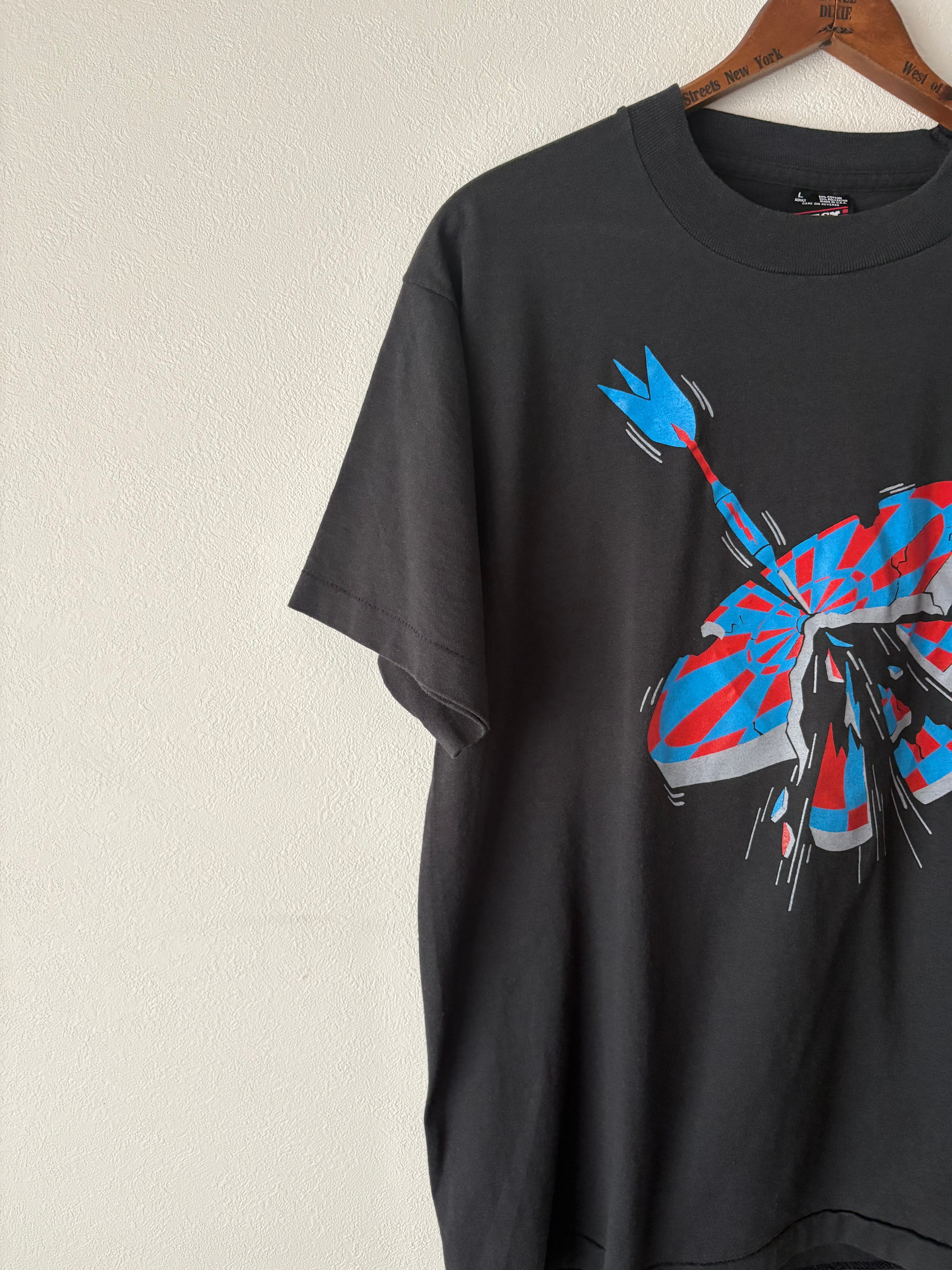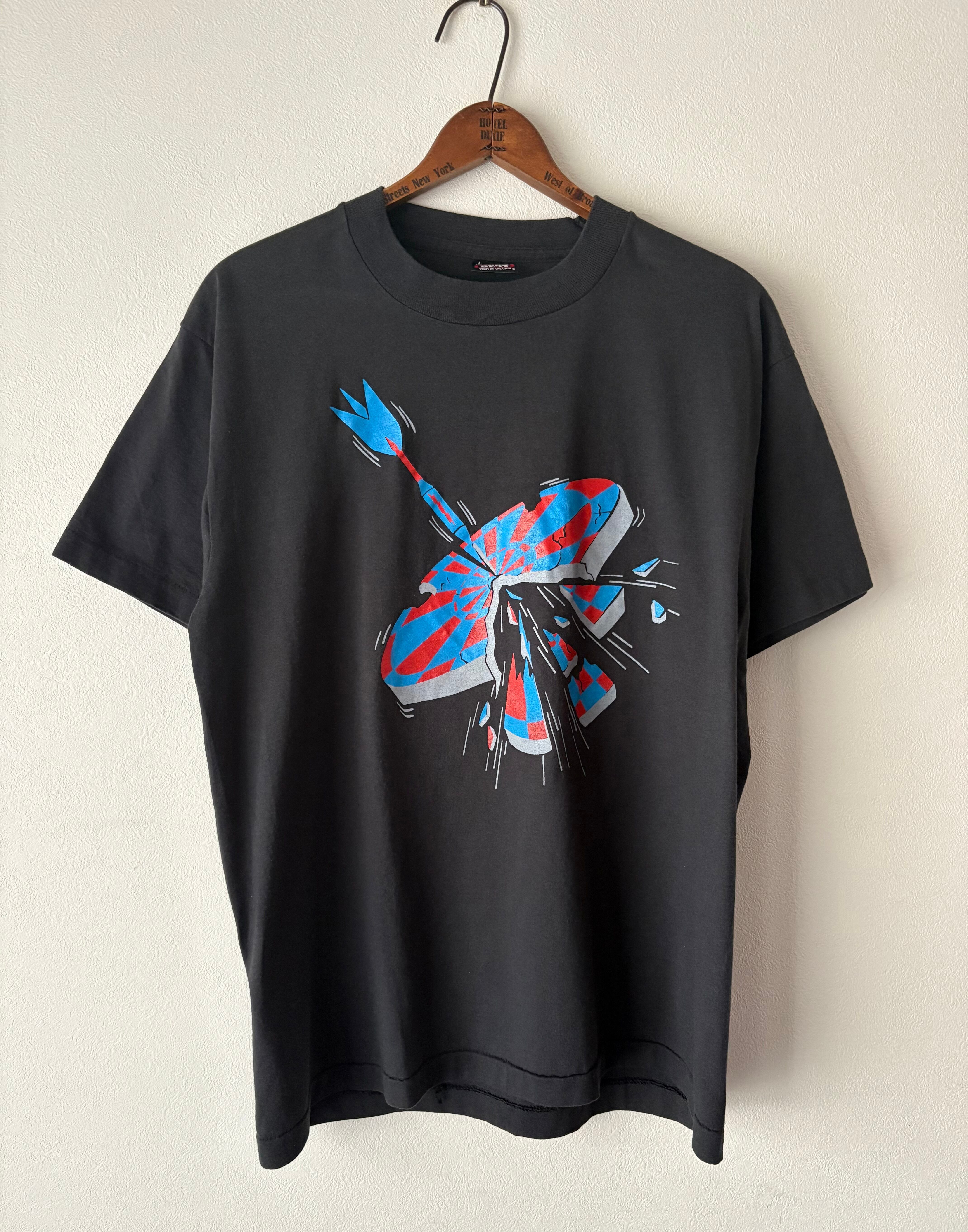 ダーツの弓が刺さってボードが飛び散ってるユニークなプリント。配色も良いです。右袖に穴があるので、少しお買い求めやすいお値段で出させていただいてます。