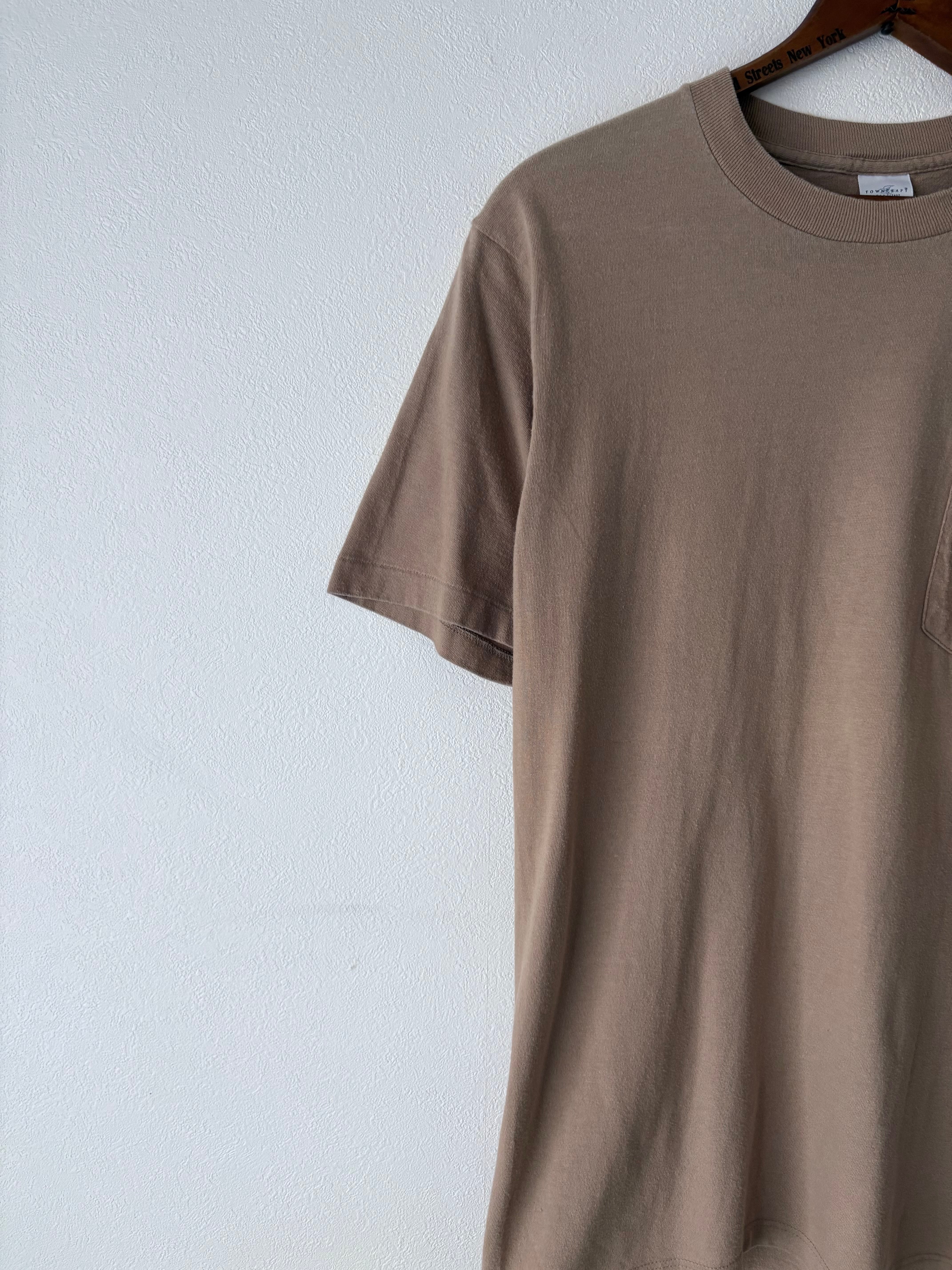 ライトブラウンの色味が大人っぽいポケTです。優しい肌触りの生地感。サイズは小さめでアームホールも広くないので、少しキレイめな印象になるTシャツです。