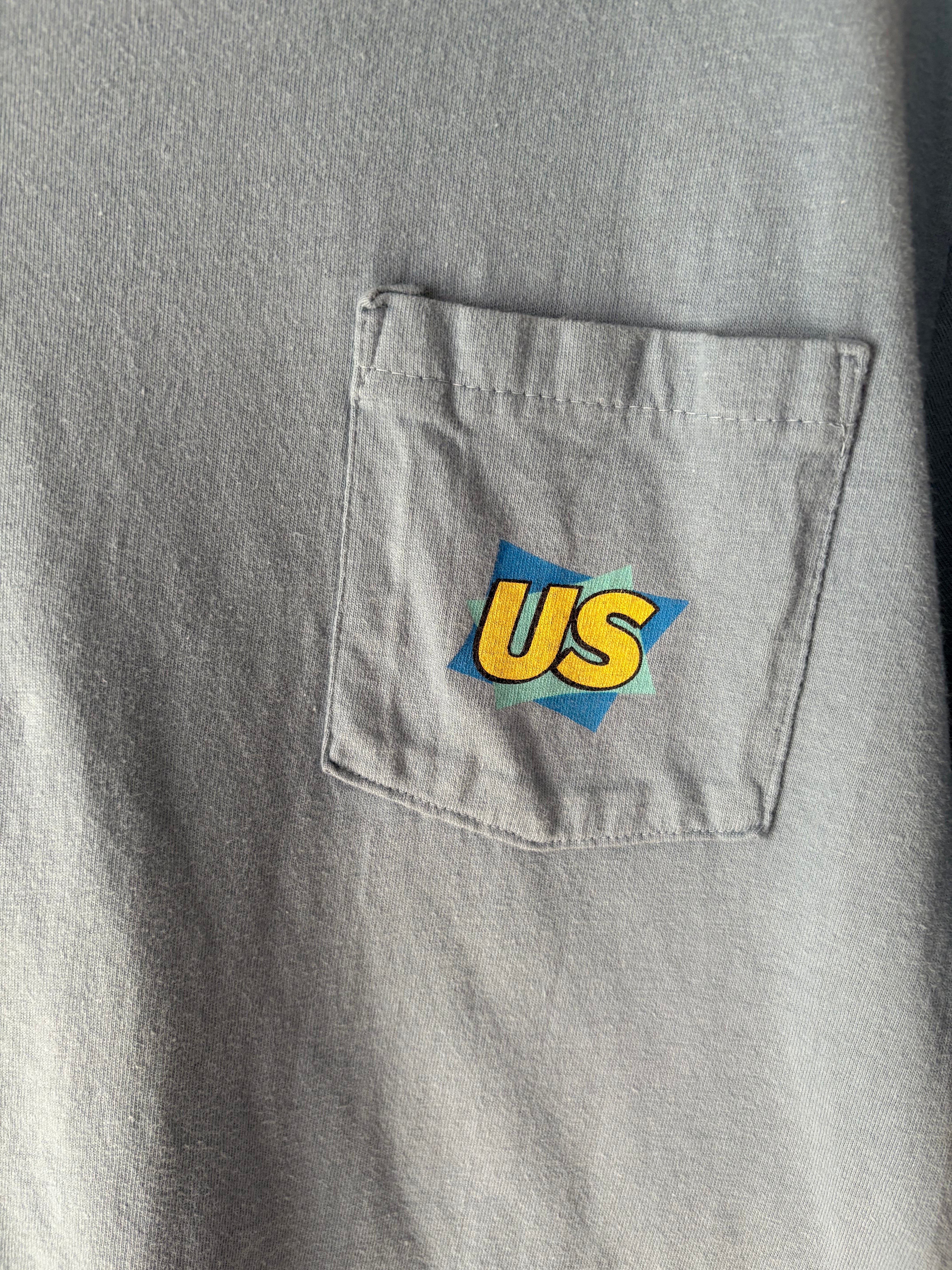アメリカのエンターテイメント雑誌US Magazineのプリントです。バックプリントに胸ポケットもあり、デザイン性の高いアイテムです。ボディもスモークブルーでオシャレ感のある色味になってます。