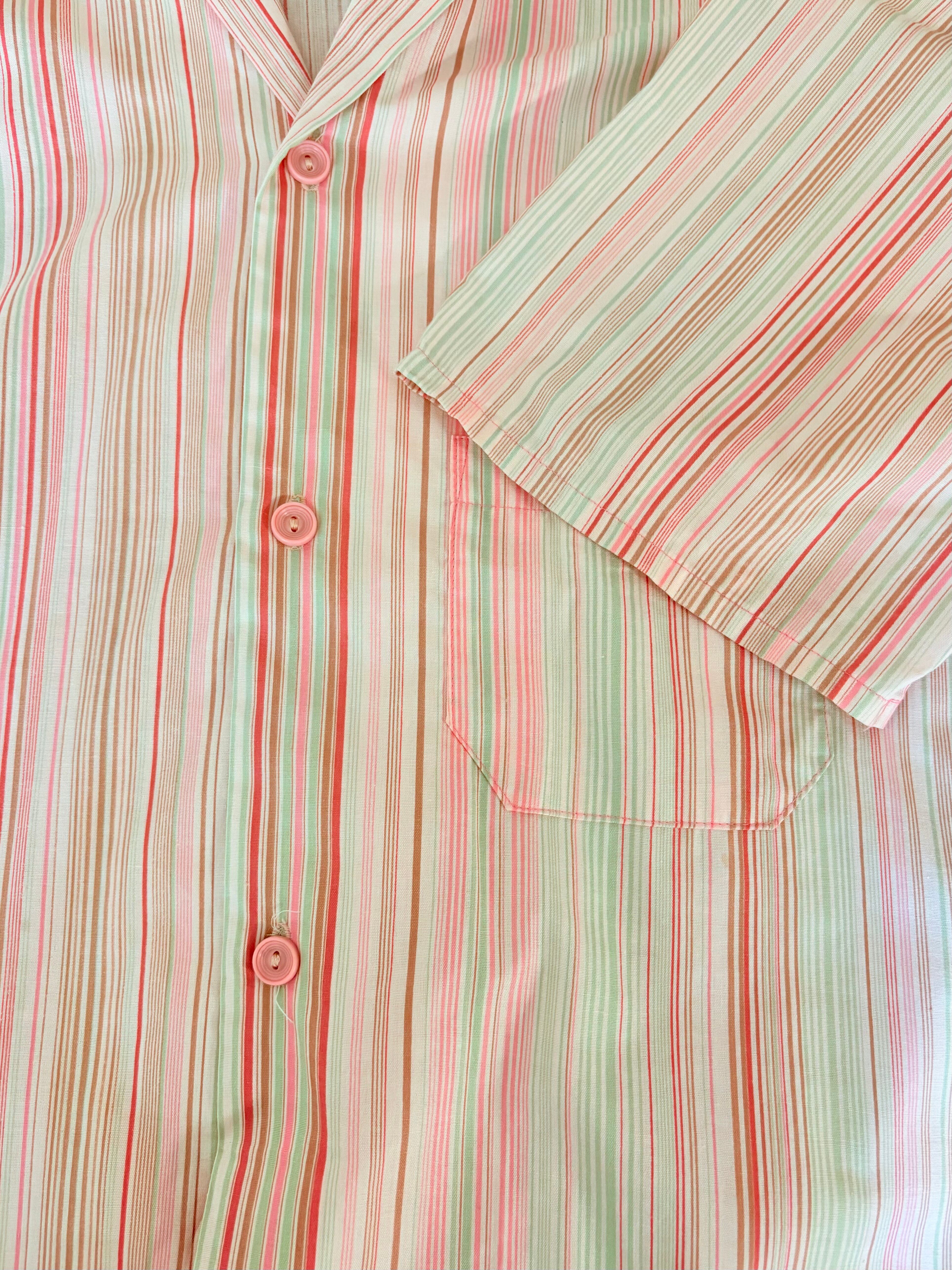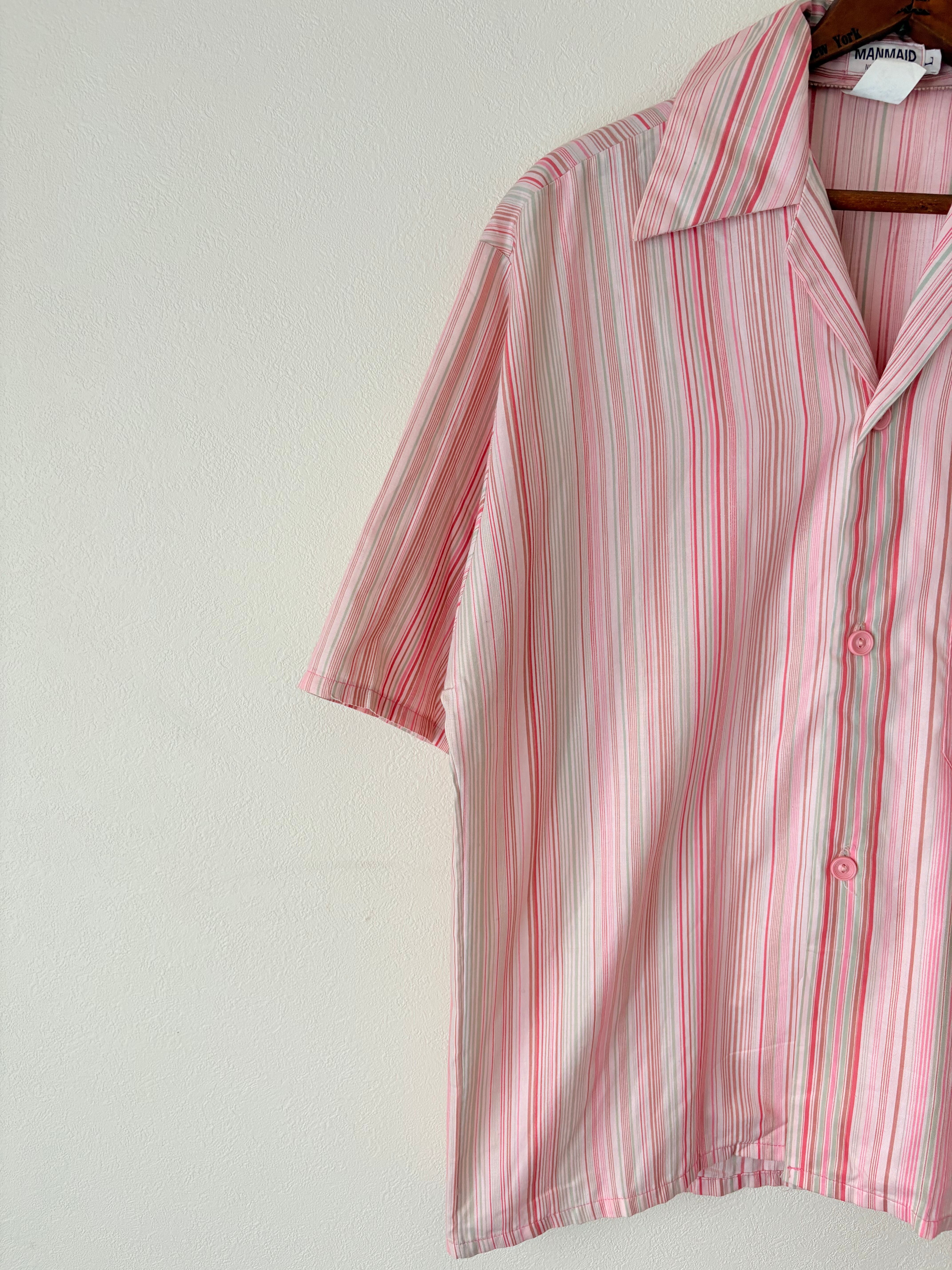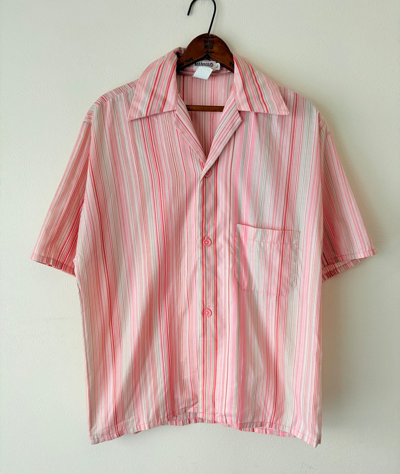 70sの風合いが感じられる色使いが魅力的なシャツです。リゾートっぽいデザインとシルエットですが、ボタンの色やベース生地の色味もピンクを使い分けておりディテールも凝っているアイテムです。