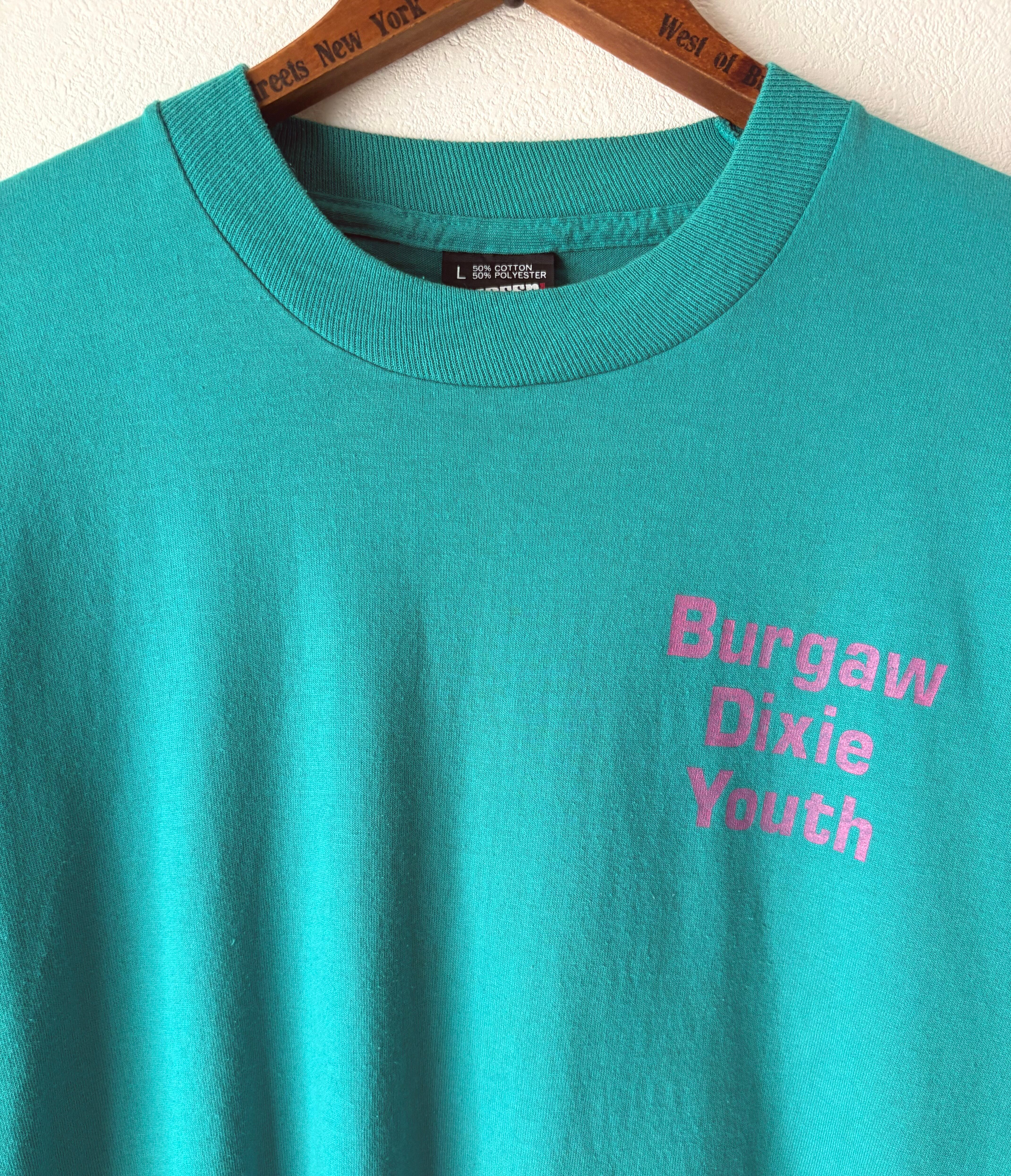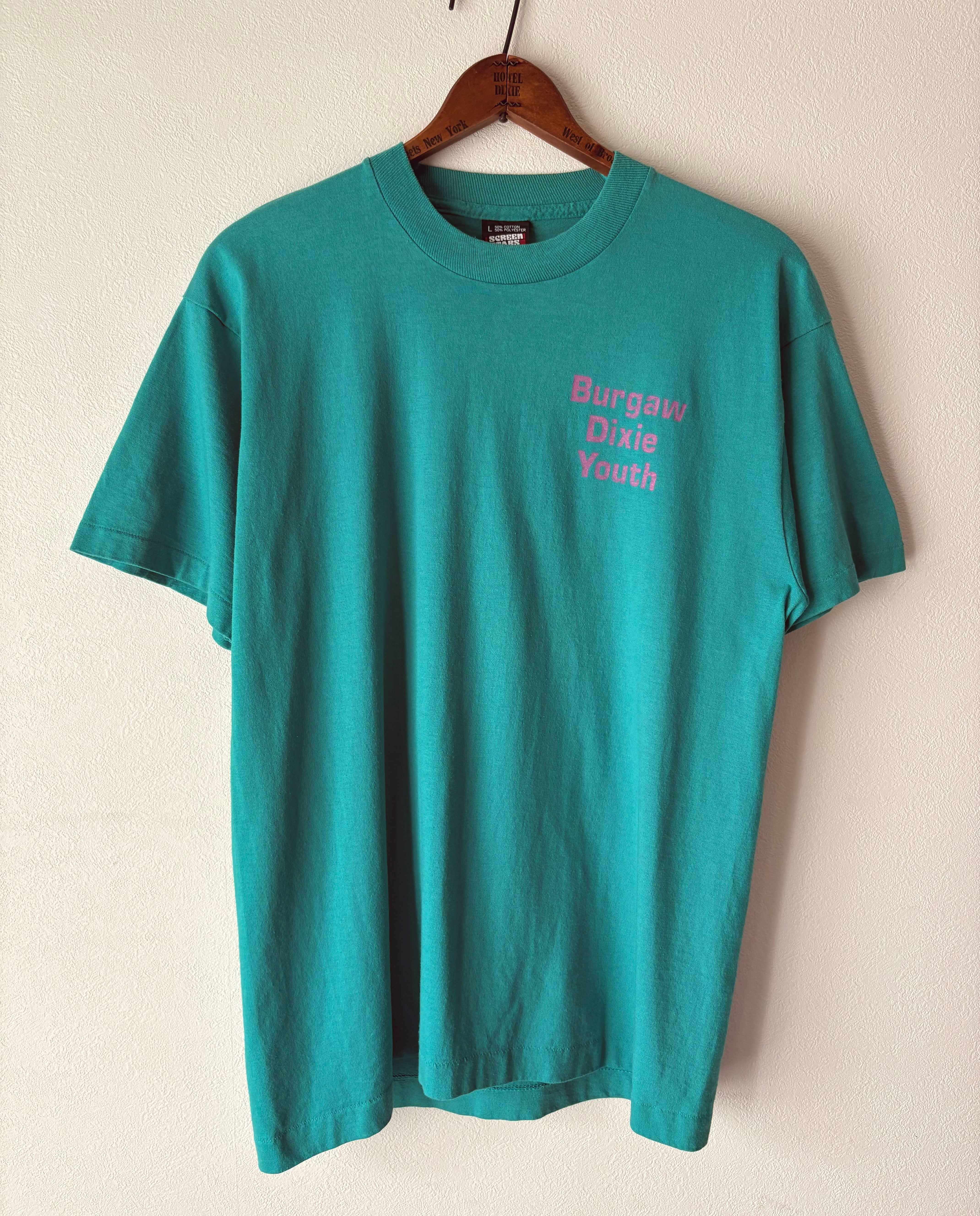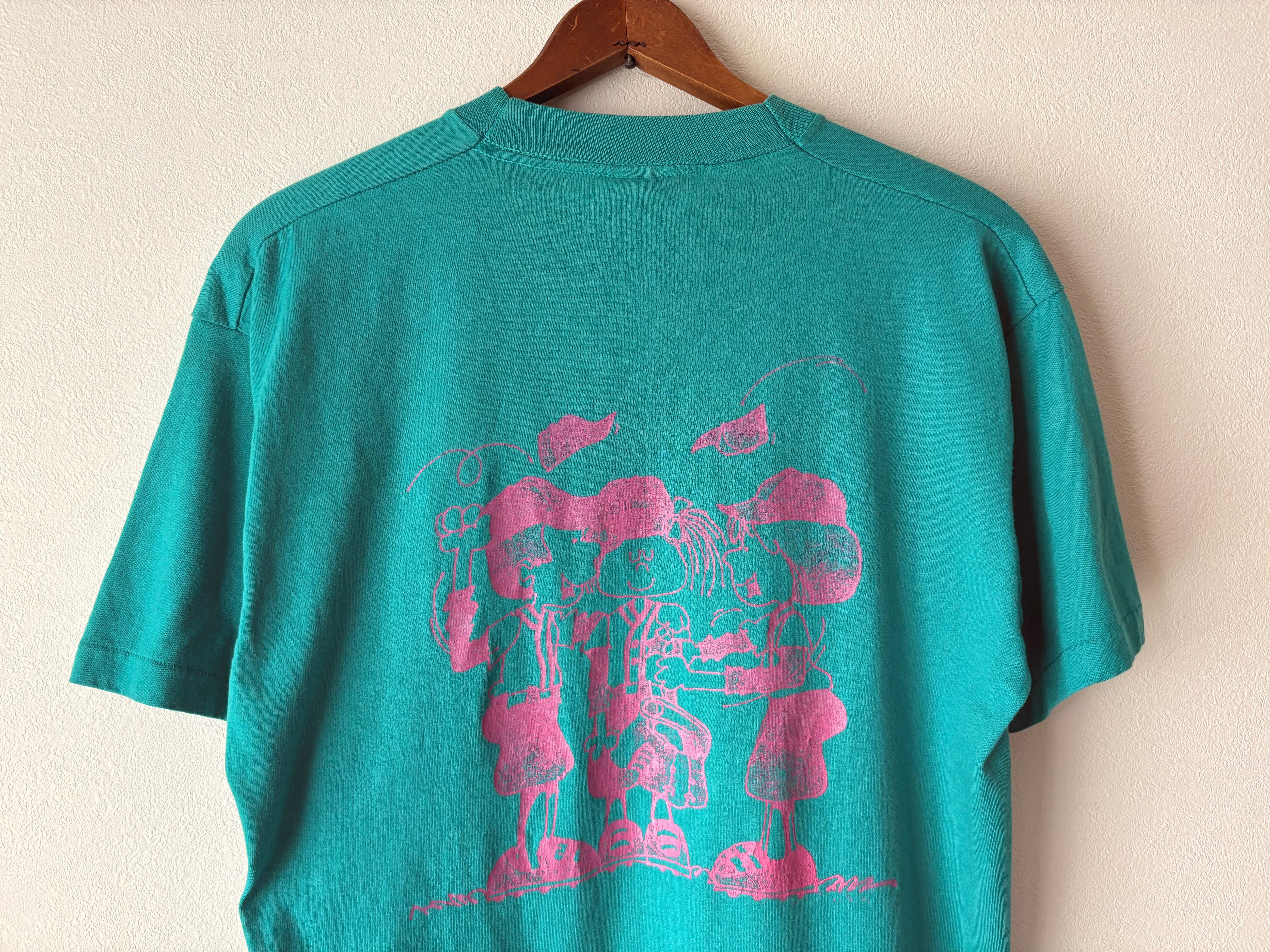 アメリカ南部のリトルリーグ関連のTシャツです。ブルーグリーンのボディにピンクのプリントの色合わせがオシャレです。絵柄も80年代くらいのタッチでプリントのかすれ具合と相まってレトロ感があるかわいいアイテムです。サイズ感もLくらいの合わせやすい大きさです。