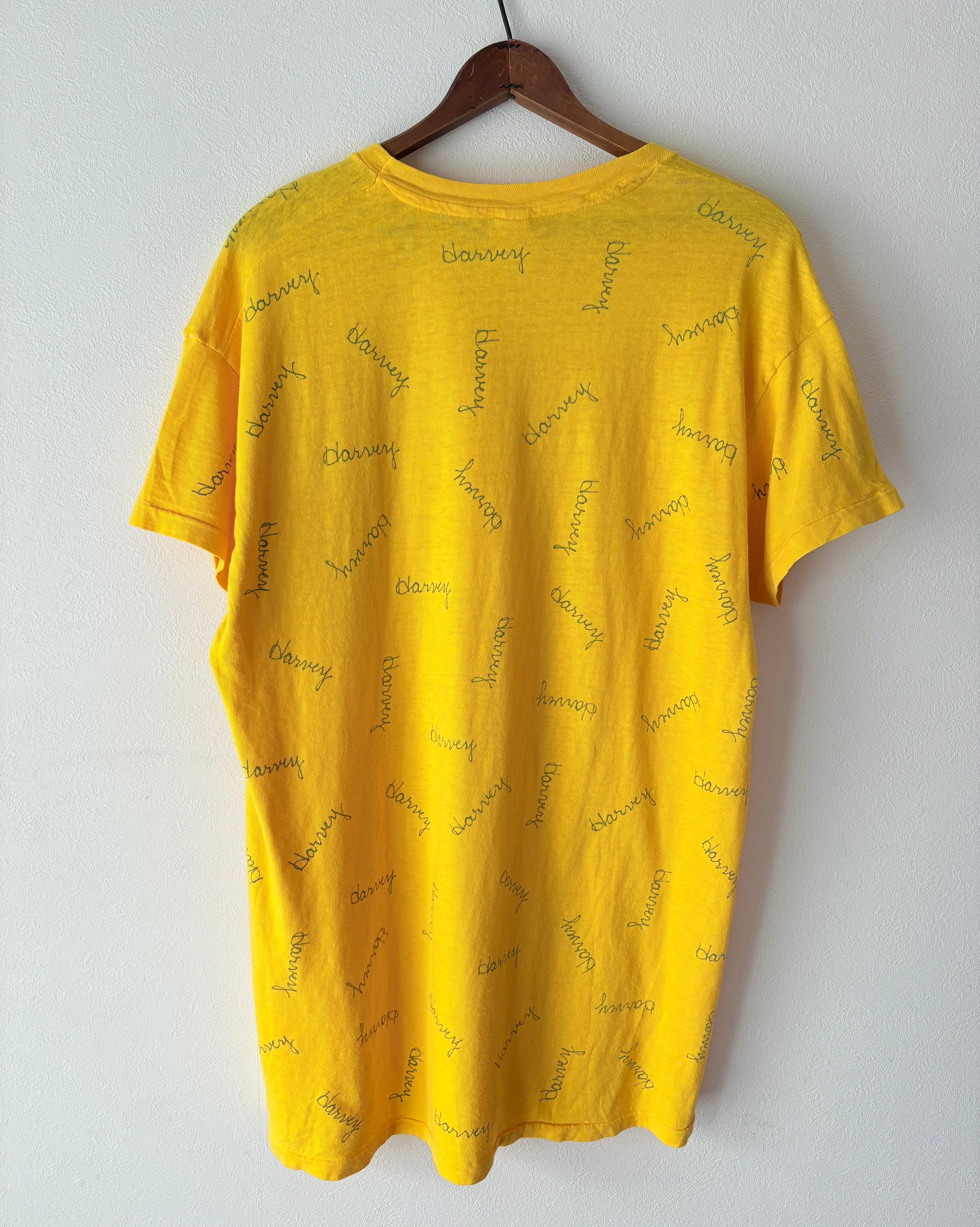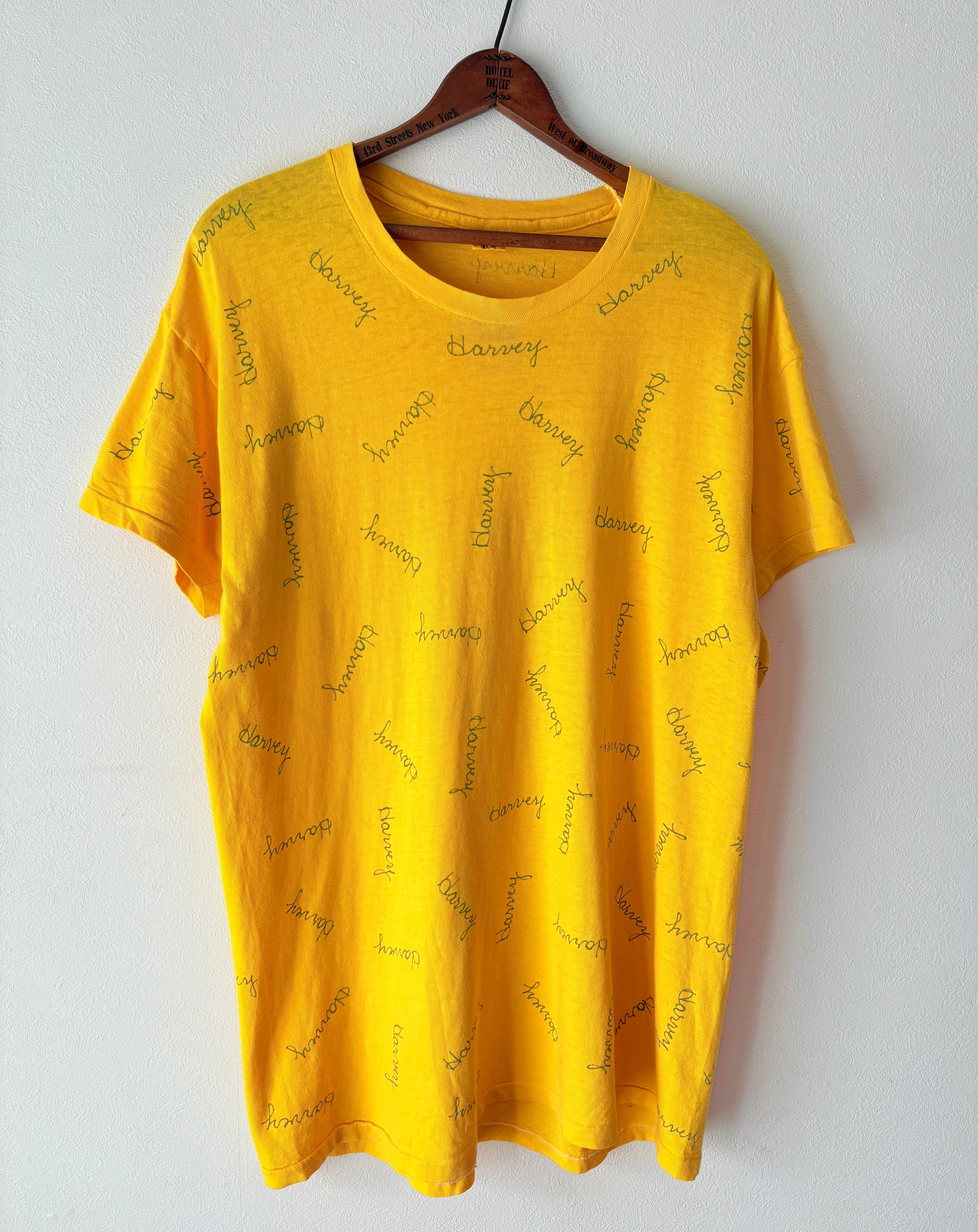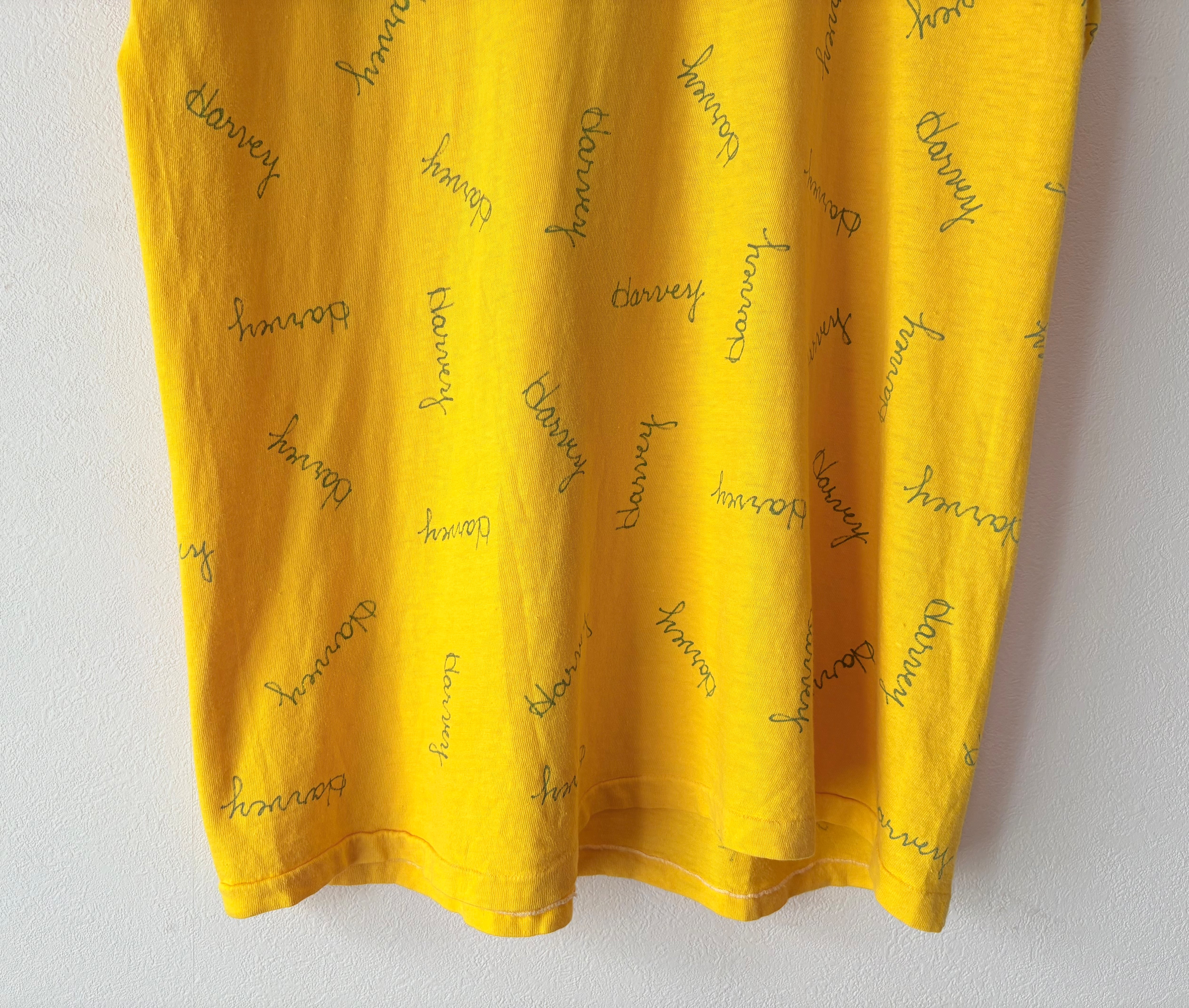 後染めされたボディに“Harvey“とハンドペイントで総柄になるように描かれています。一点ものでデザインのバランスもいい魅力的なTシャツです。薄めの生地感で袖が少し短めのシルエットです。