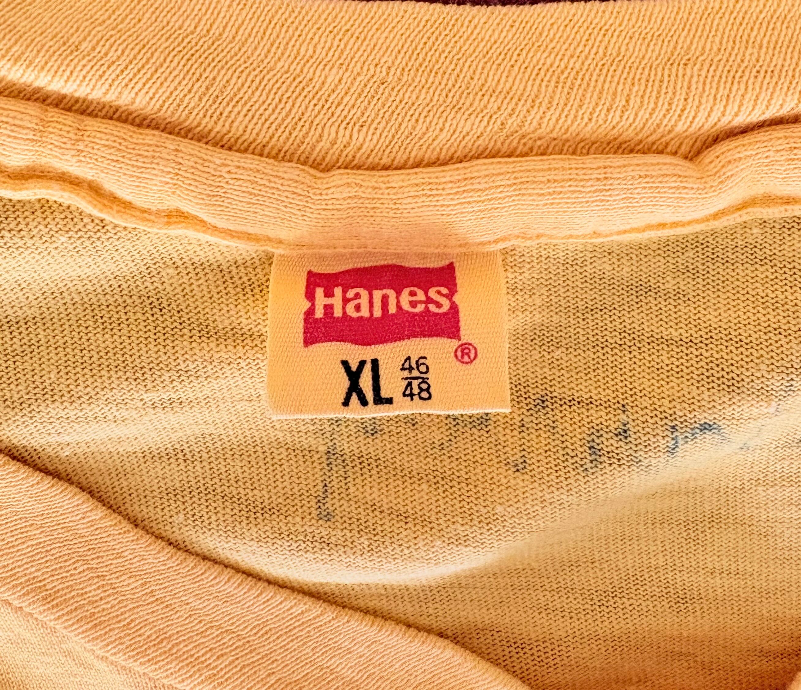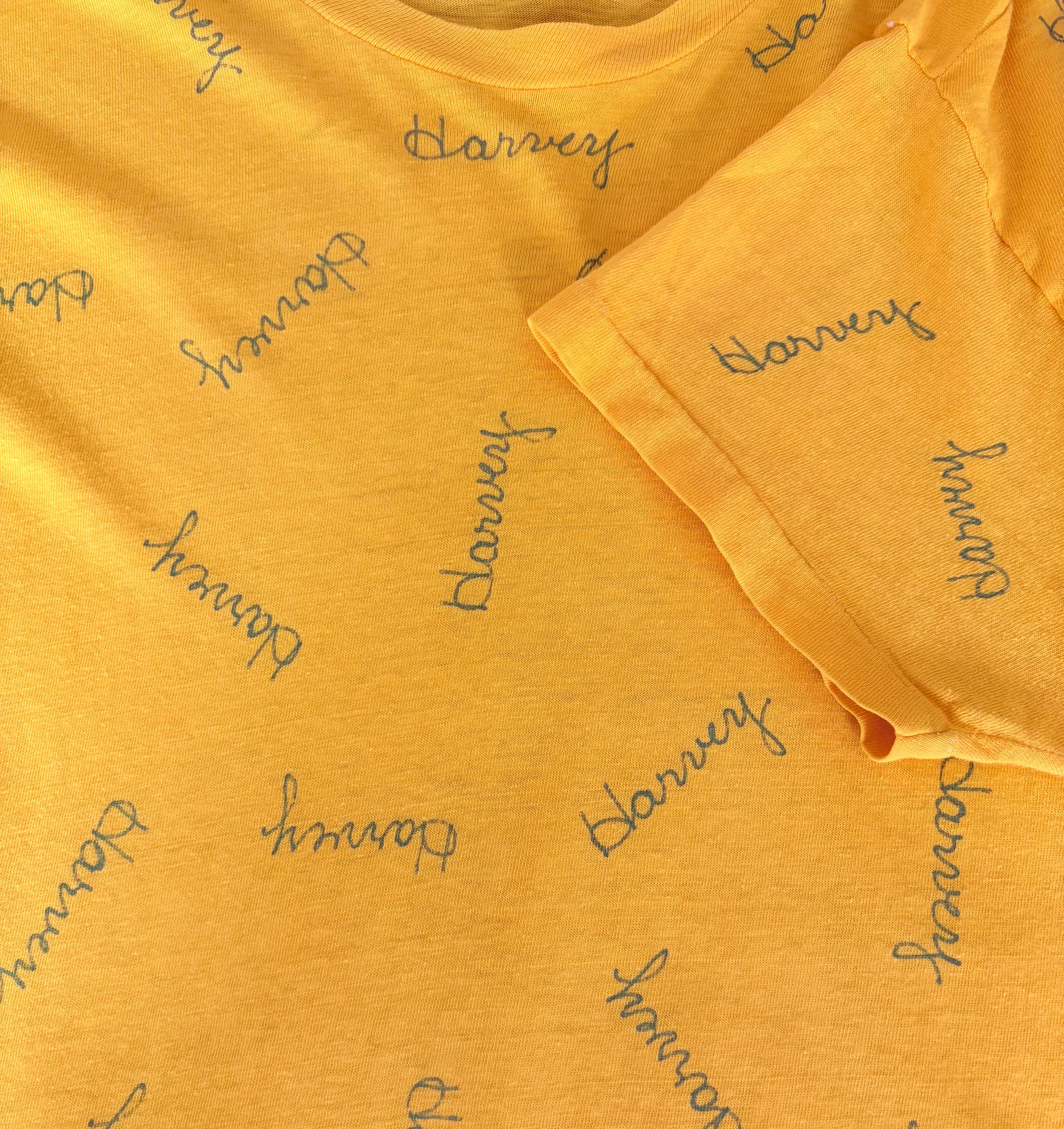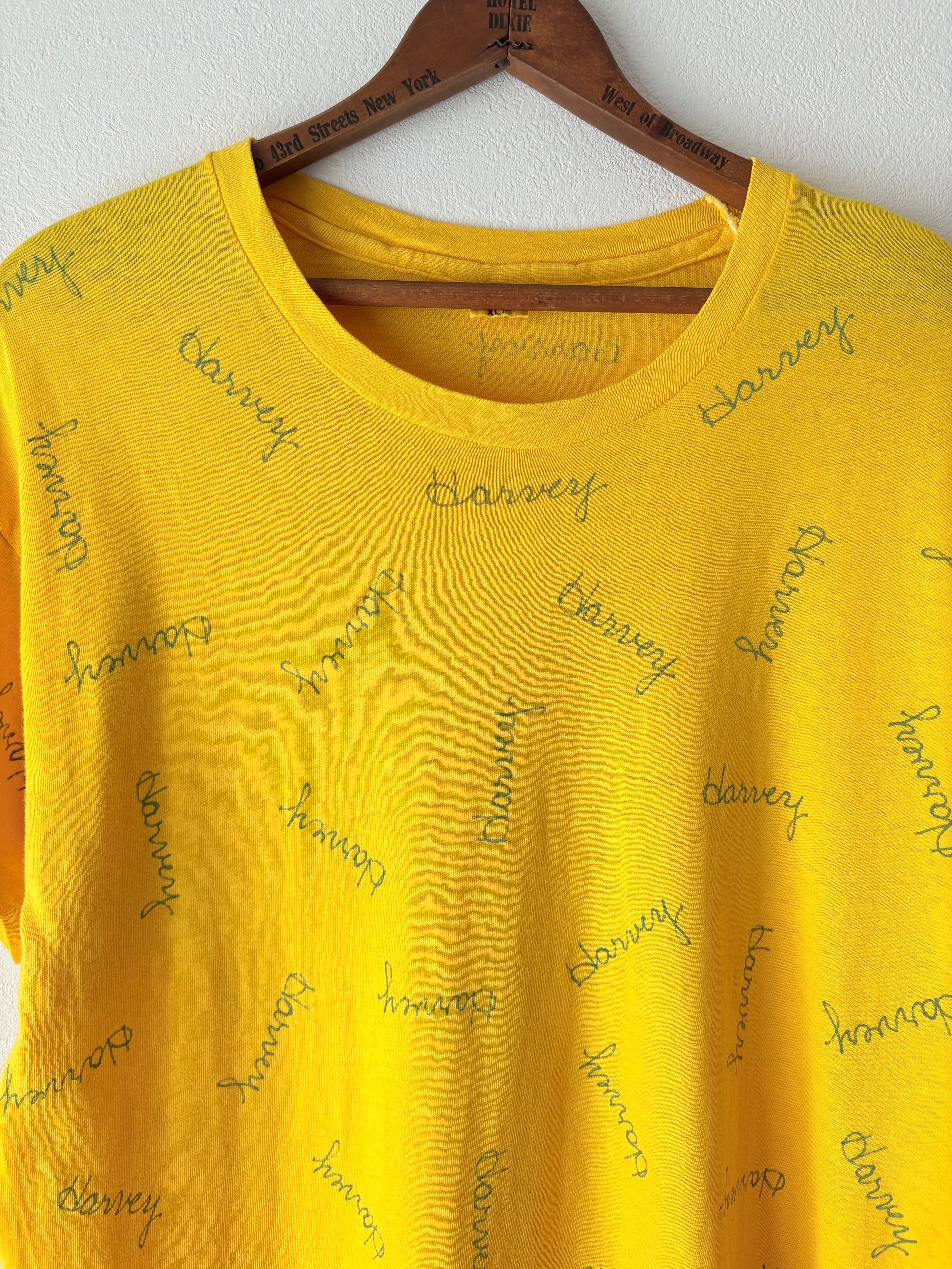 後染めされたボディに“Harvey“とハンドペイントで総柄になるように描かれています。一点ものでデザインのバランスもいい魅力的なTシャツです。薄めの生地感で袖が少し短めのシルエットです。