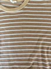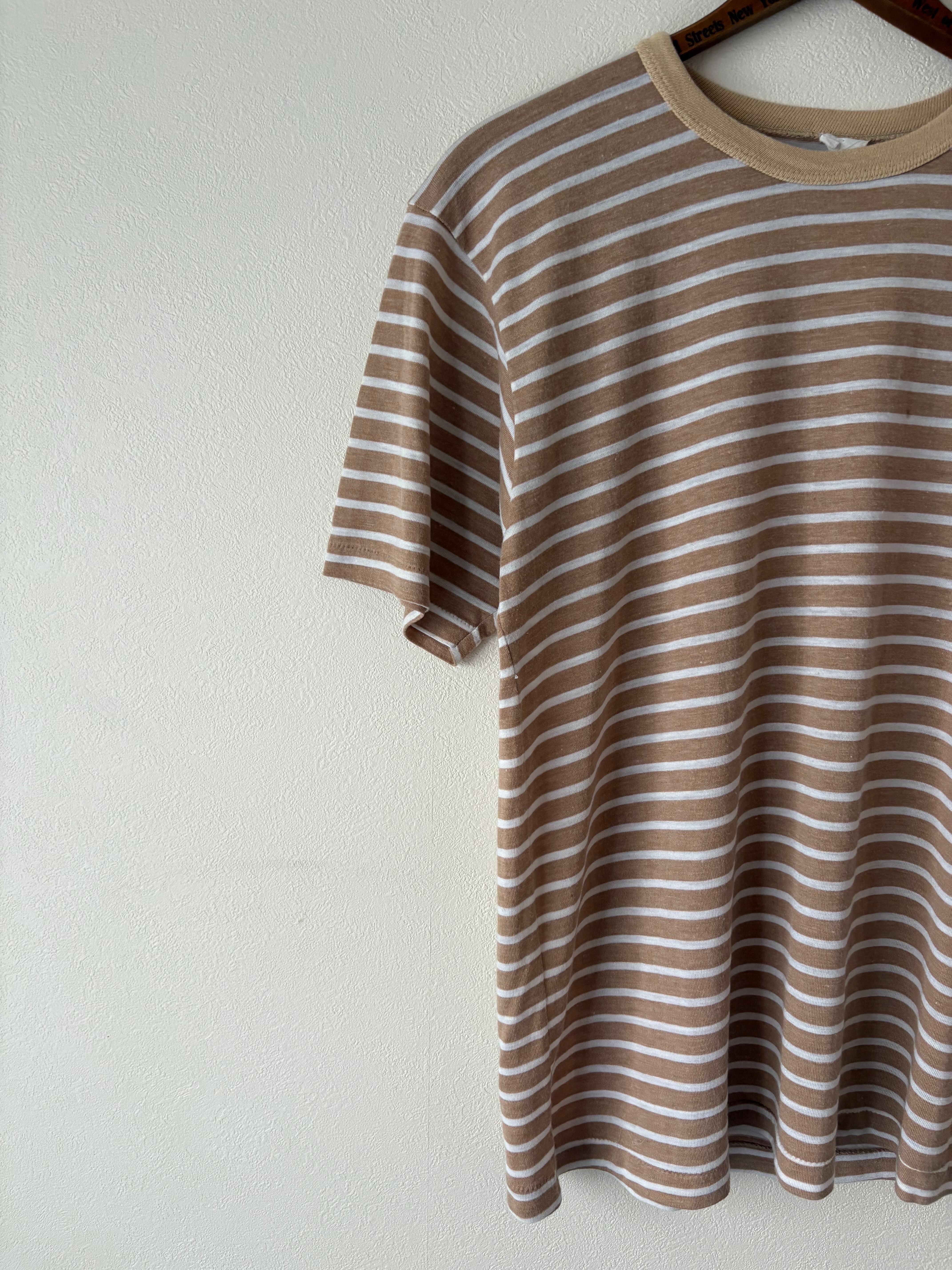 ベージュとブラウンと白がかわいいボーダーTシャツです。シンプルなパンツやデニムと合わせるだけでコーディネートがきまります。マリンルックやアイビースタイルでも合わせて貰いやすいです。生地感は薄めでさらっとしており。おそらく70sくらいのものと思われます。サイズがあまり大きくないのでユニセックスで着ていただけます。