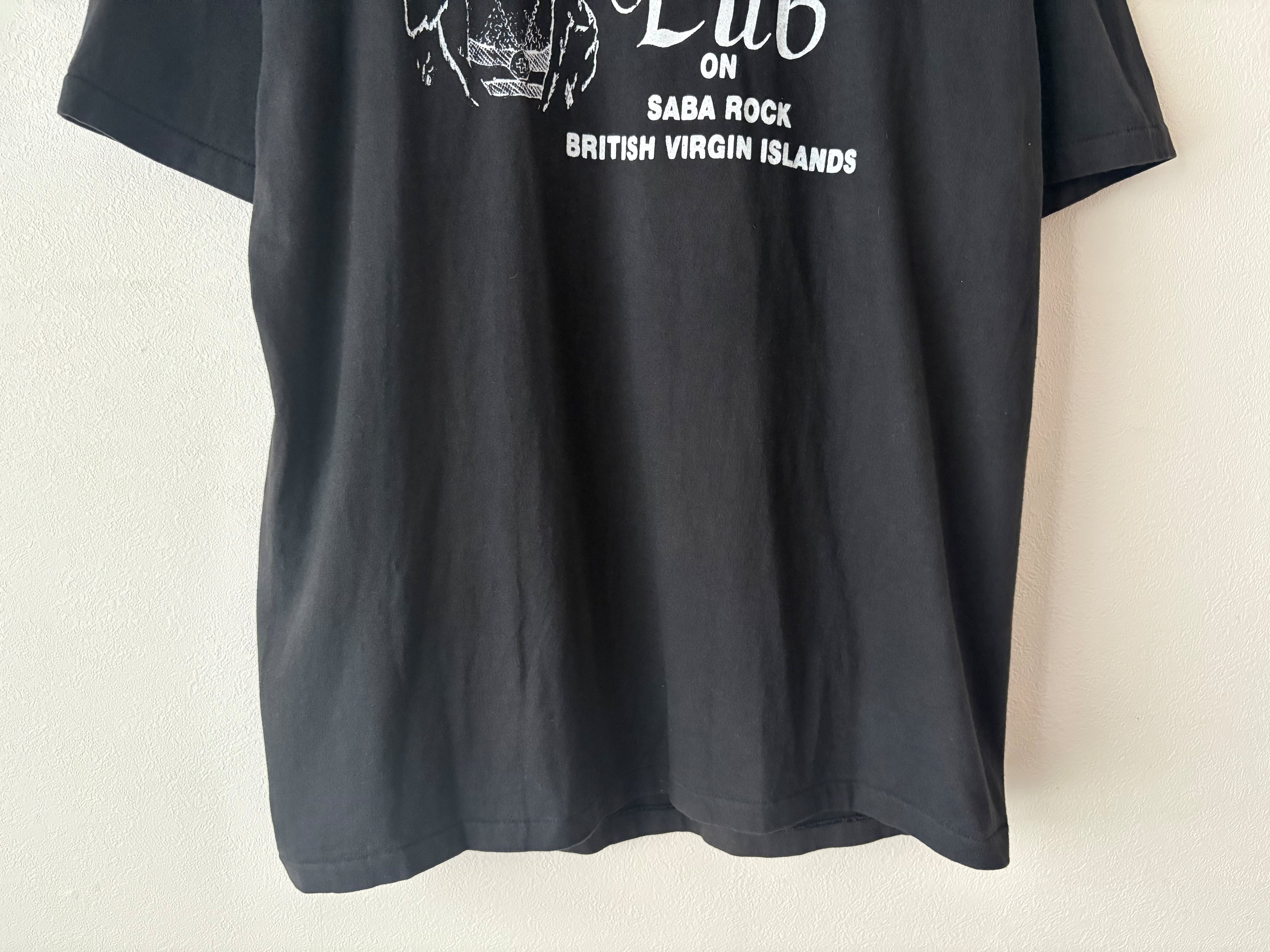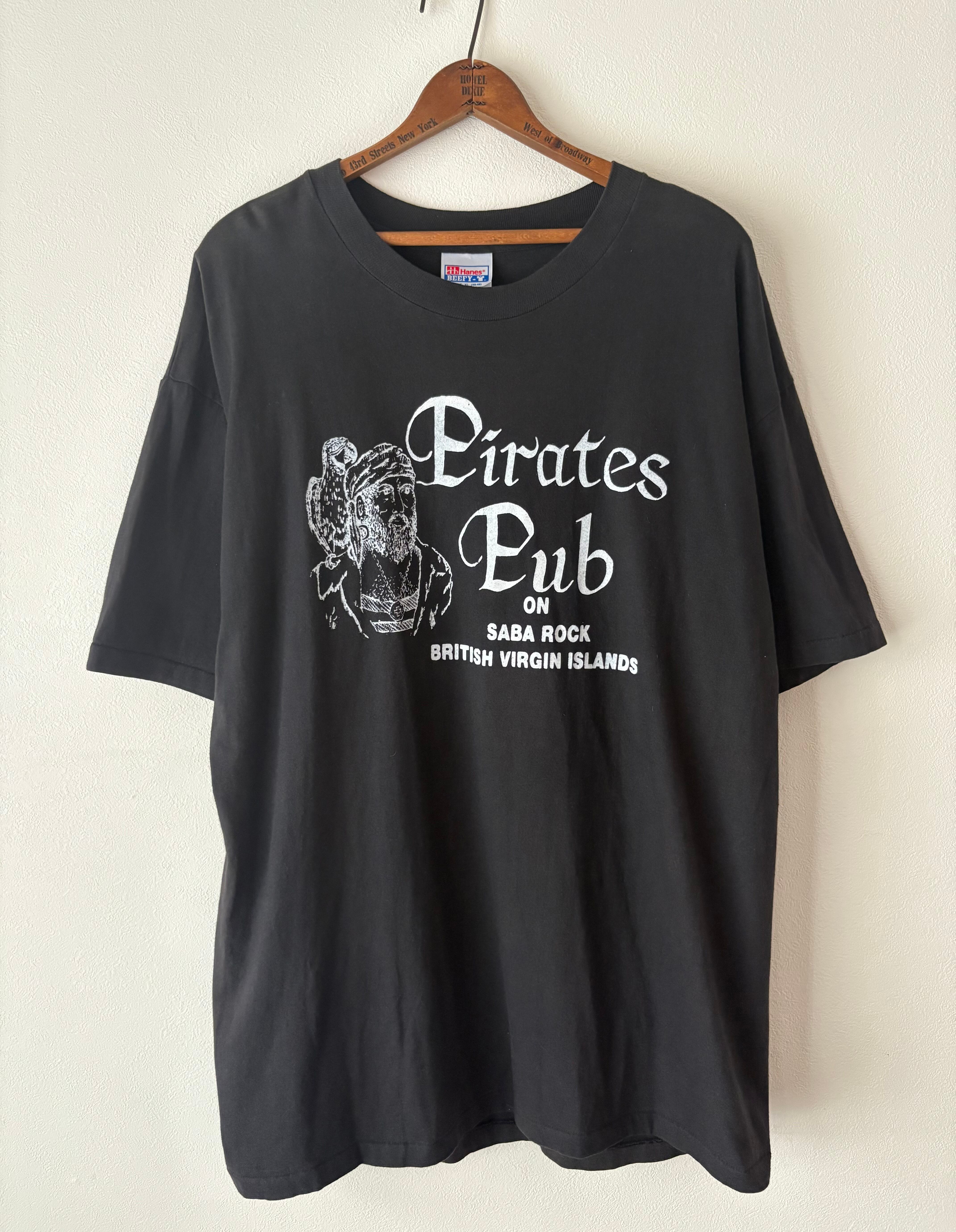 カリブ海にある島の観光BarのTシャツでわかりやすい海賊がプリントされています。版画のような絵のタッチがカッコよくもあり、少し武骨な雰囲気も醸し出しています。アイテム自体はモノトーンのみの色合いなので、コーディネートしやすく着回しやすいです。XLの中でもしっかり大きめなので、ゆったりシルエットで着ていただけます。