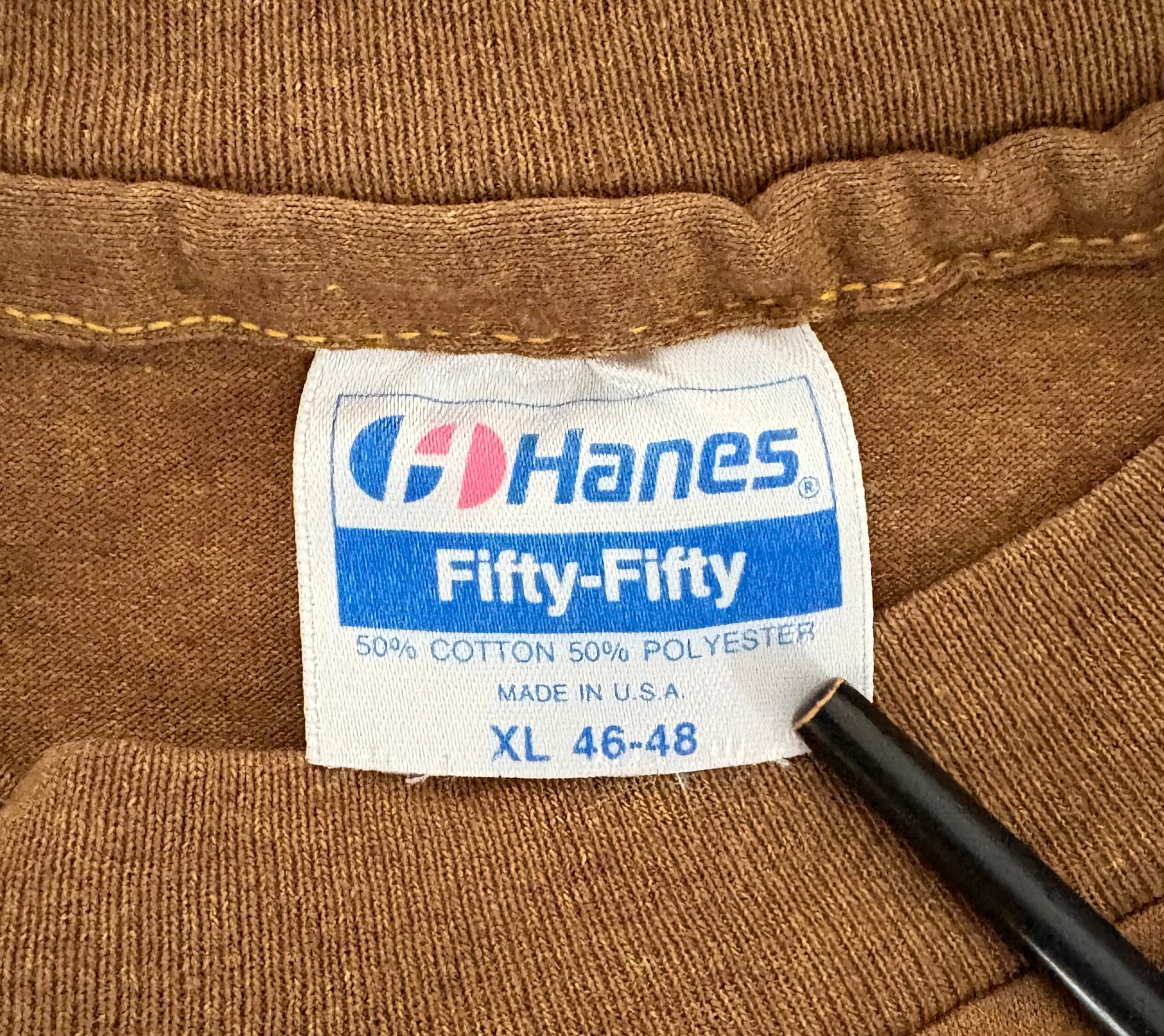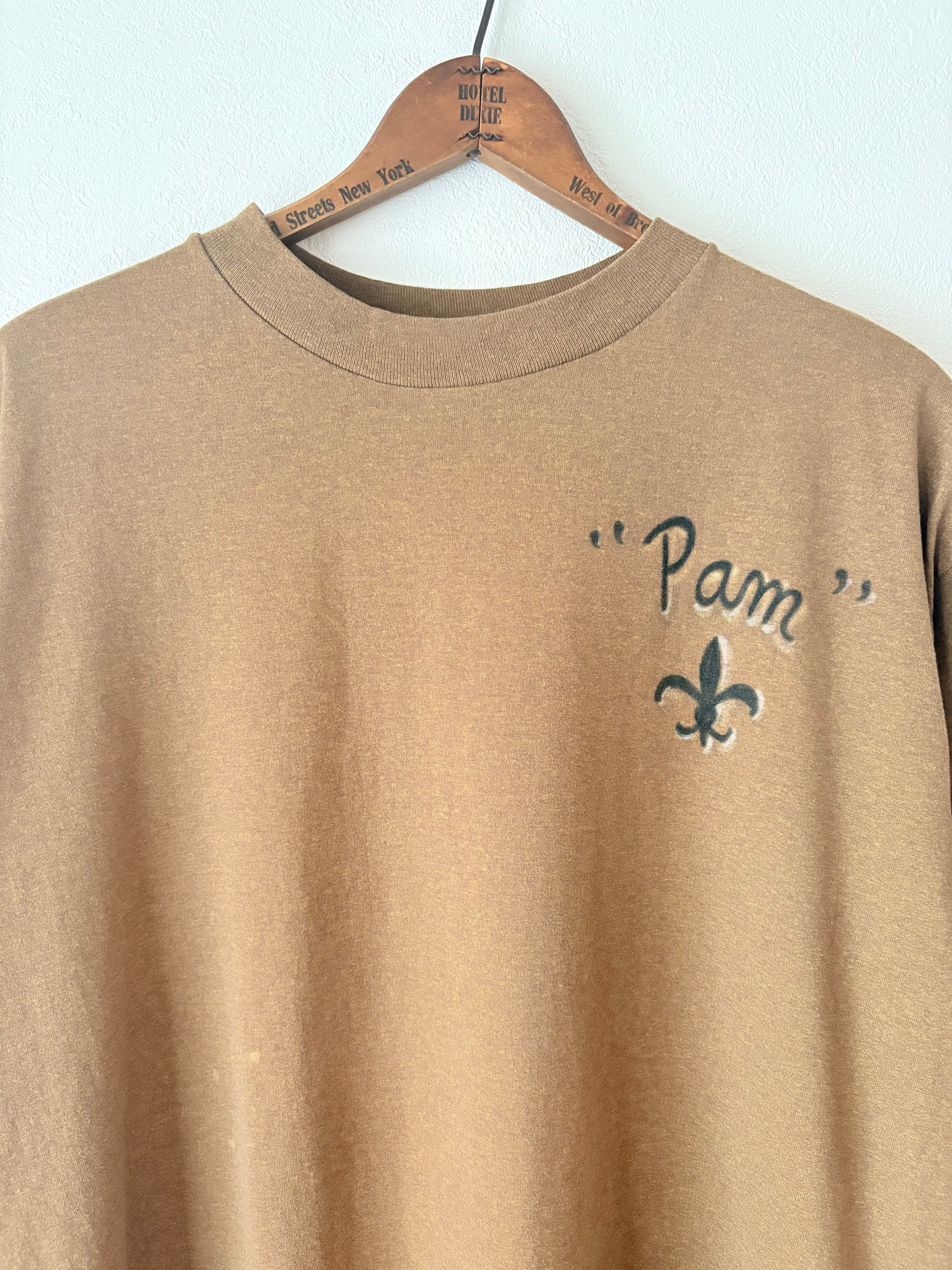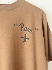 ハンドペイントでフルール・ド・リス(百合の花)が描かれています。おそらく人の名前の“Pam”と描かれているので、なんらかの意味合いがあるかもしれません。ゴールドやシルバーで陰影がつけられており、ディテールも凝っています。ボディ自体は茶とイエロー系の糸で織られているのでスパイスの色味でありそうな独特の風合いとなっています。