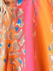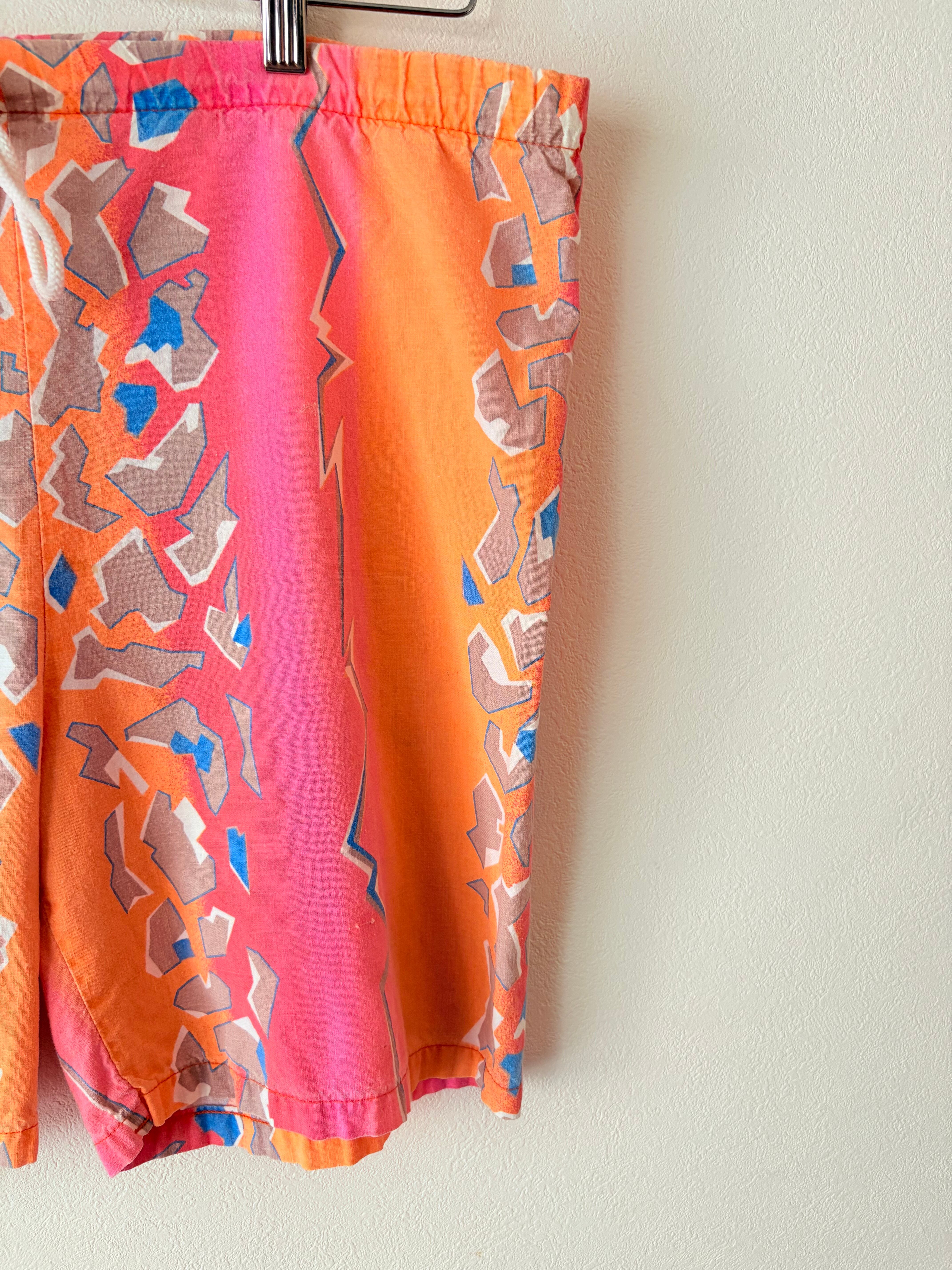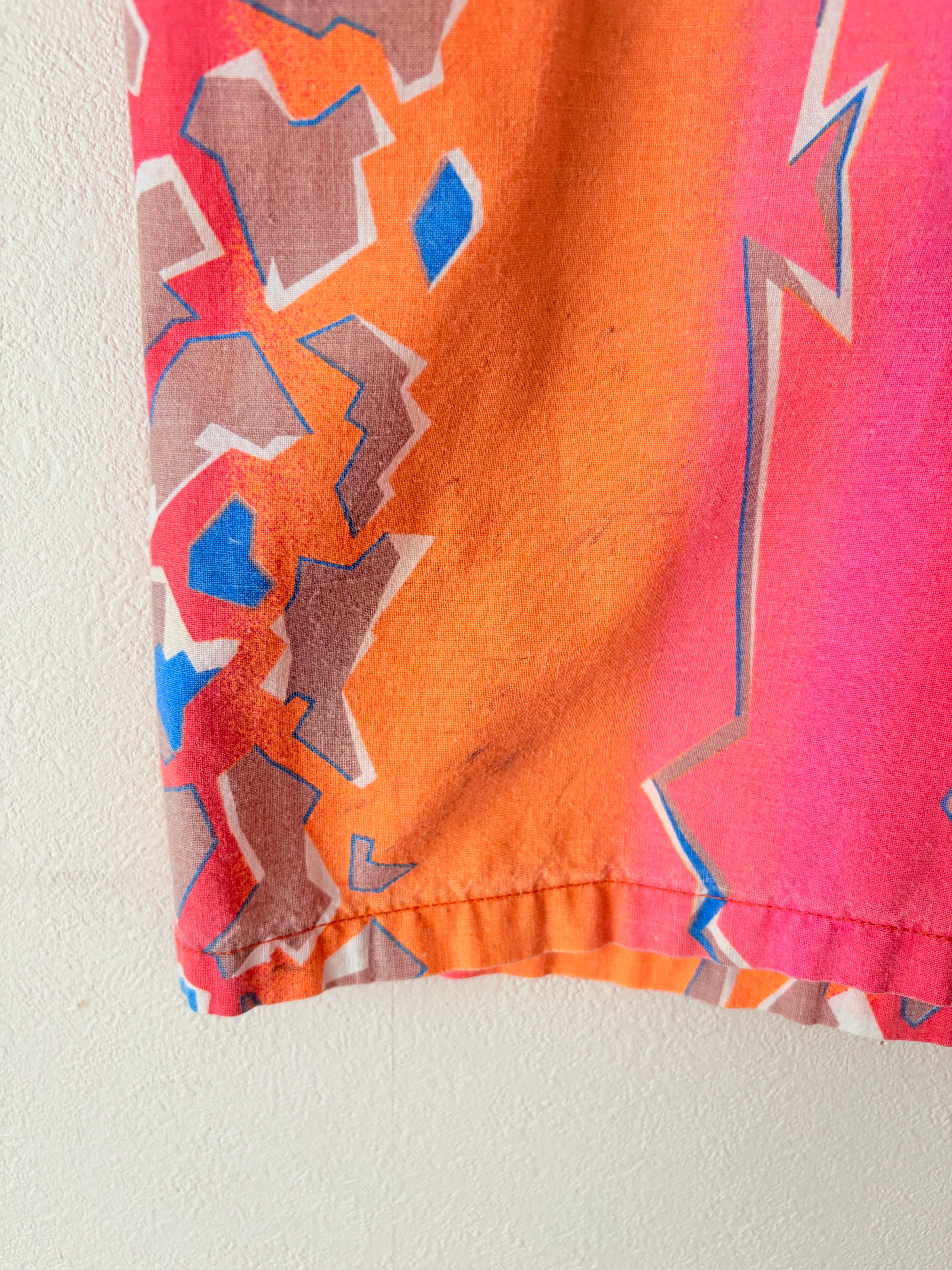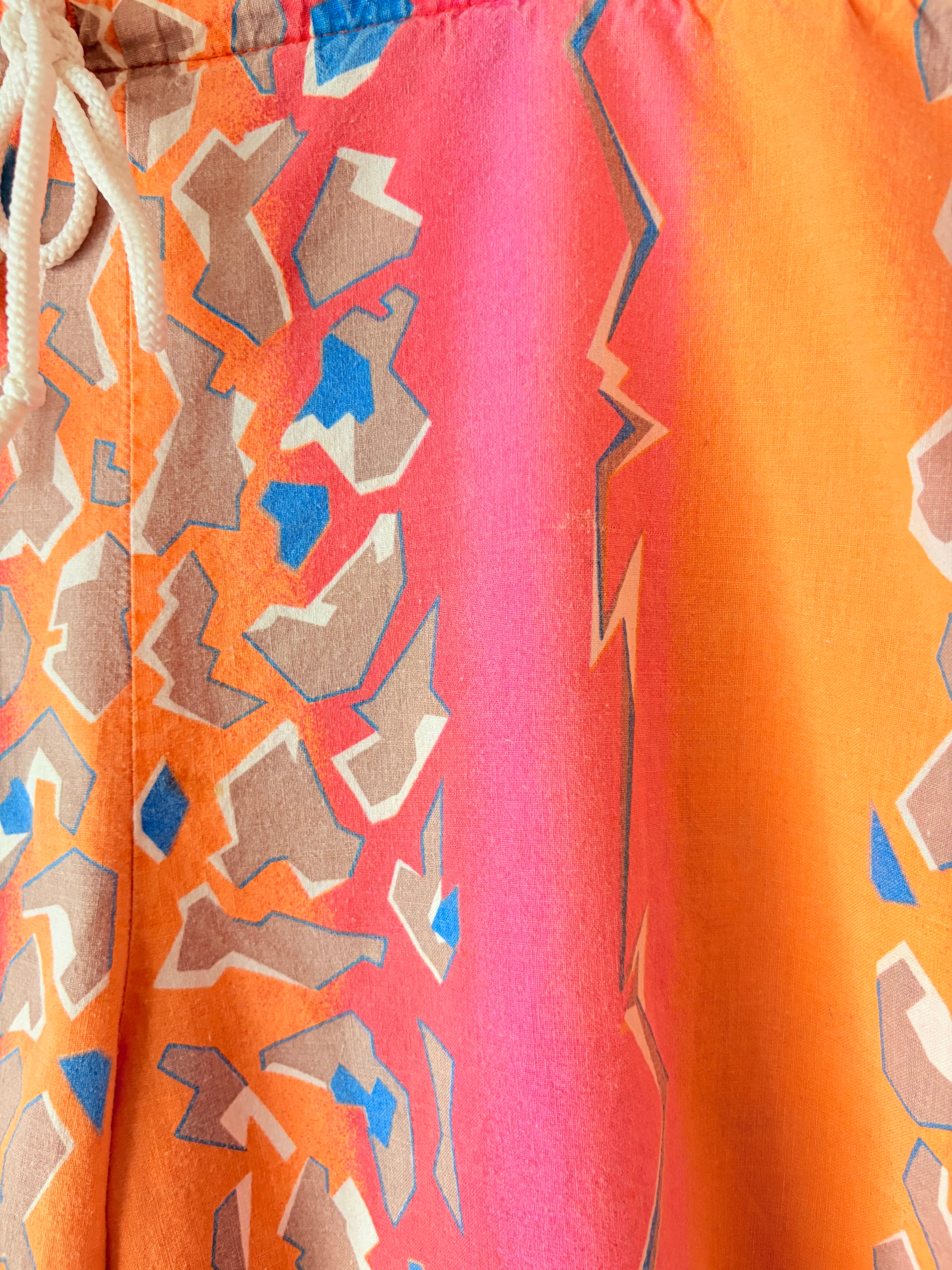 おそらく70〜80sくらいのものと思われます。ビビッドな色合わせが目を惹きますが、派手な割にしつこさがないので、コーディネートのポイントに使いやすいです。遊び心があるデザインと色合わせが魅力的なアイテムです。ドローコードがついているので、ウエストの調整が可能です。