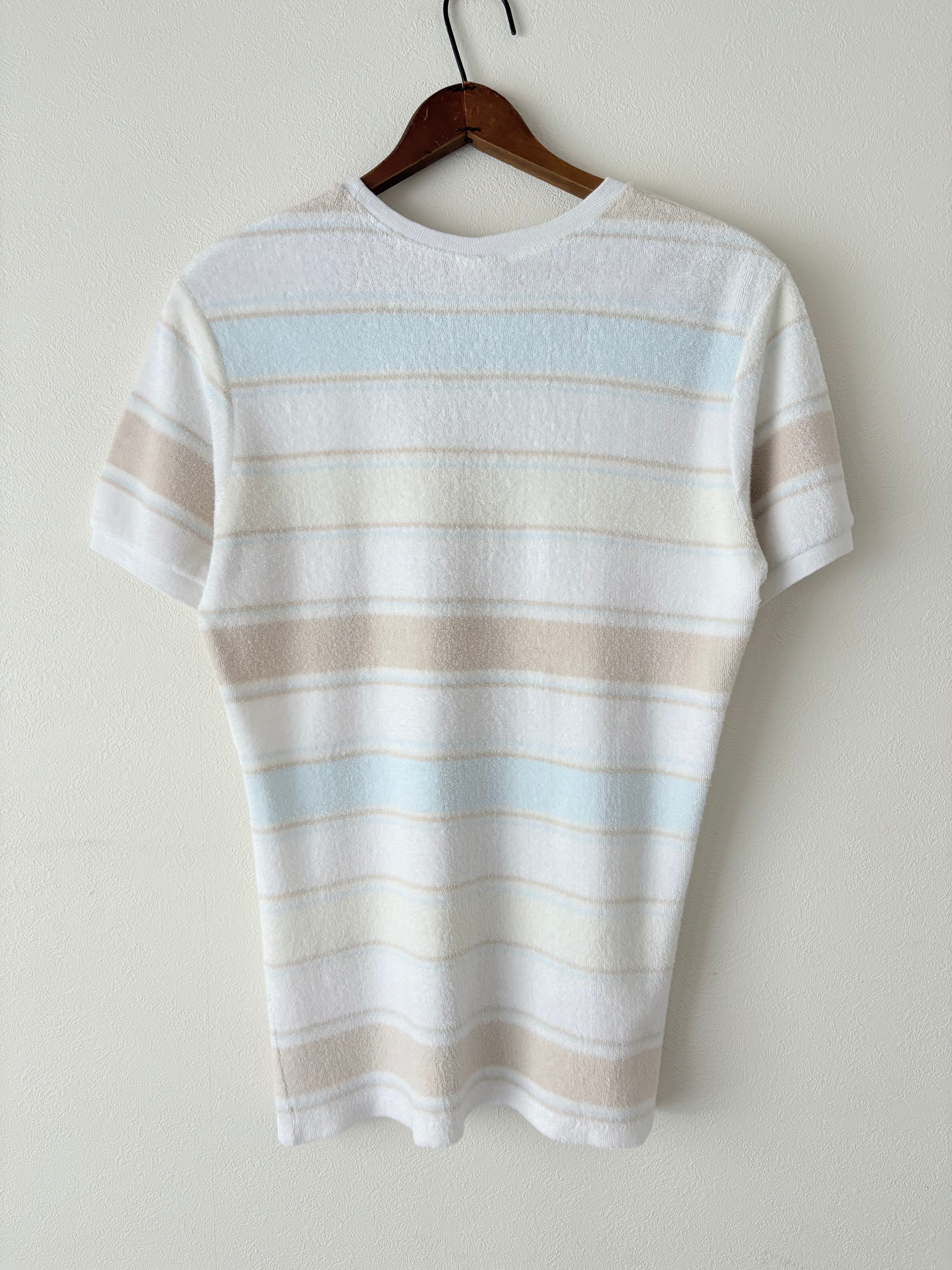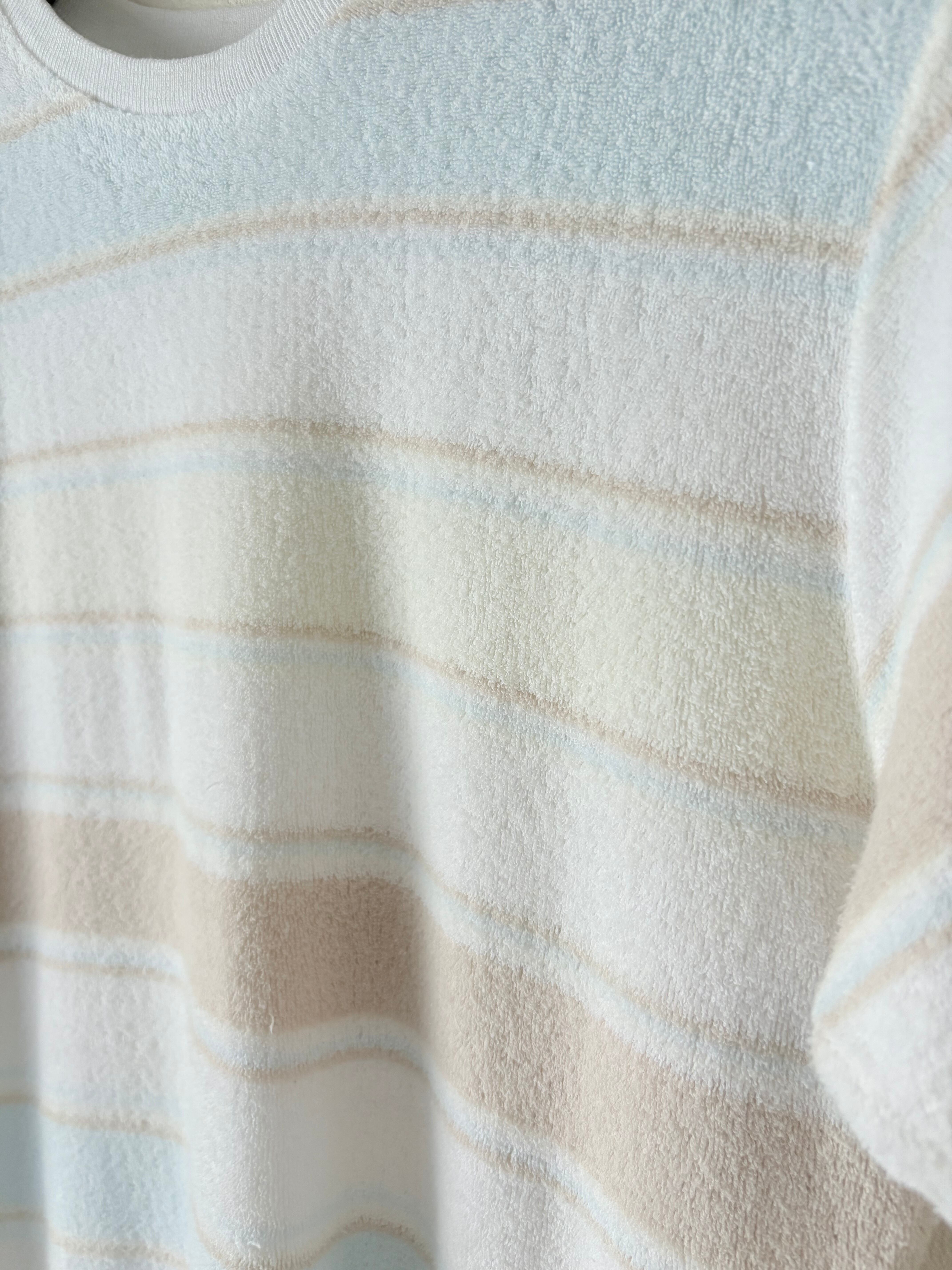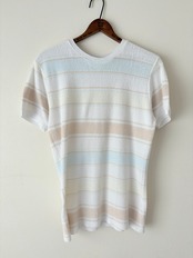 マシュマロのような柔らかい色合いと生地感が素敵なアイテムです。細身で伸縮性があるので、シルエットが出やすいです。バギーなどの太めのパンツと合わせて流行りのAラインシルエットのコーディネートにぴったりです。またストレートやテーパードデニムとも相性◎です。ユニセックスでも着用できるので、タックインできるボトムスと合わせて楽しんでいただけます。