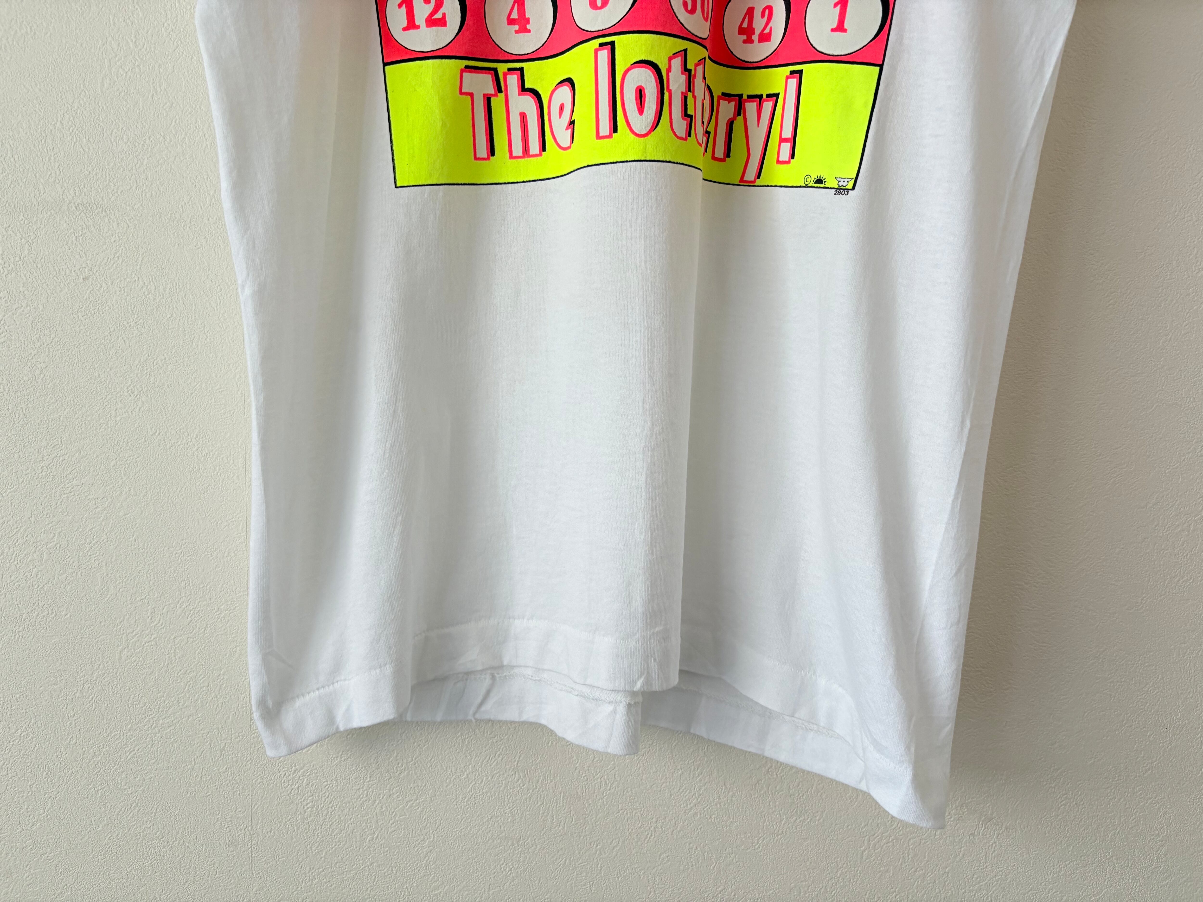 発色のいい蛍光色のプリントが目を惹くTシャツです。宝くじの楽しさを全面に打ち出しているプリント内容で、着た時に気持ちを上げてくれるアイテムです。少し長めの着丈とワイド気味な身幅のバランスがいいシルエットです。