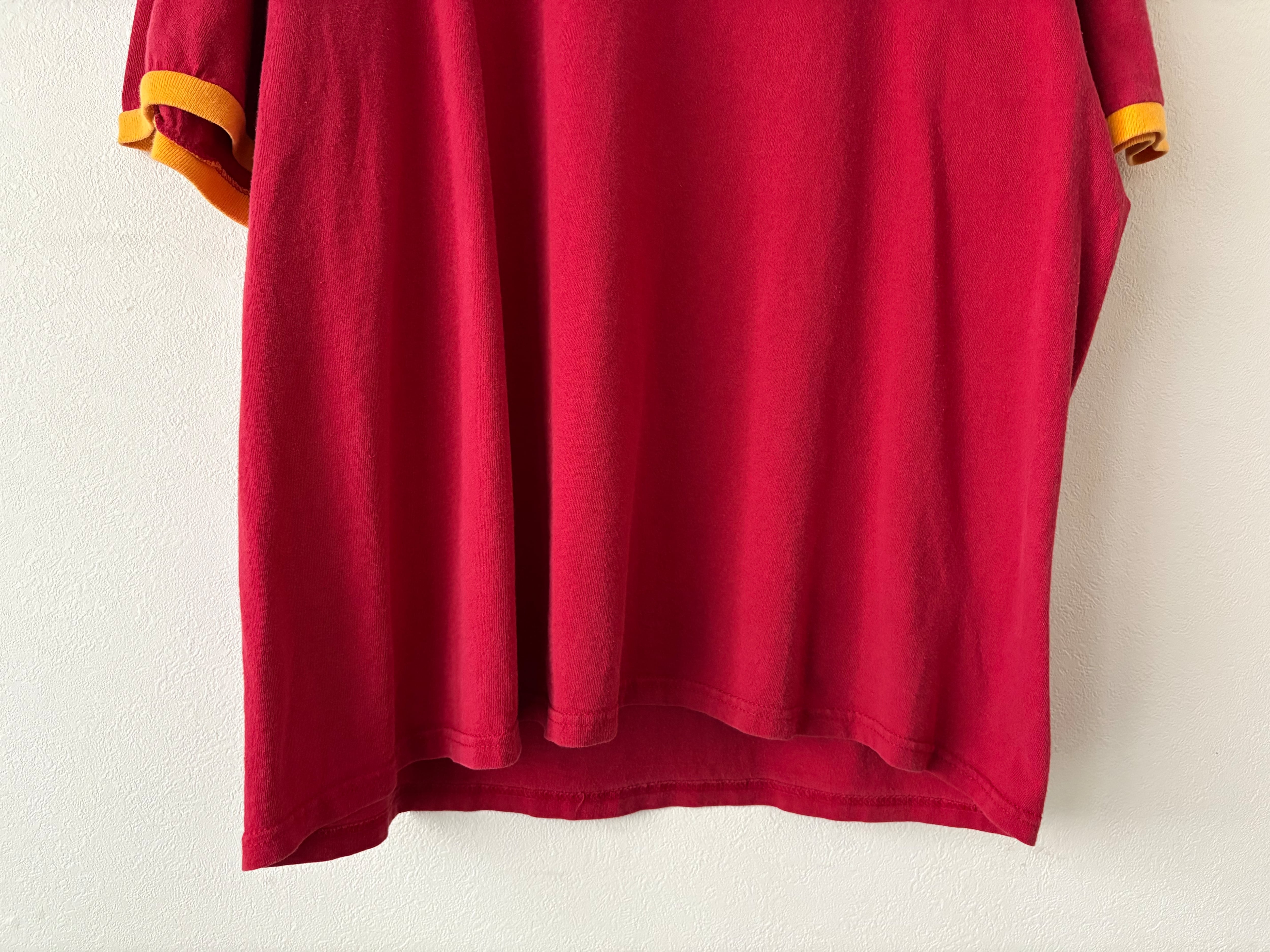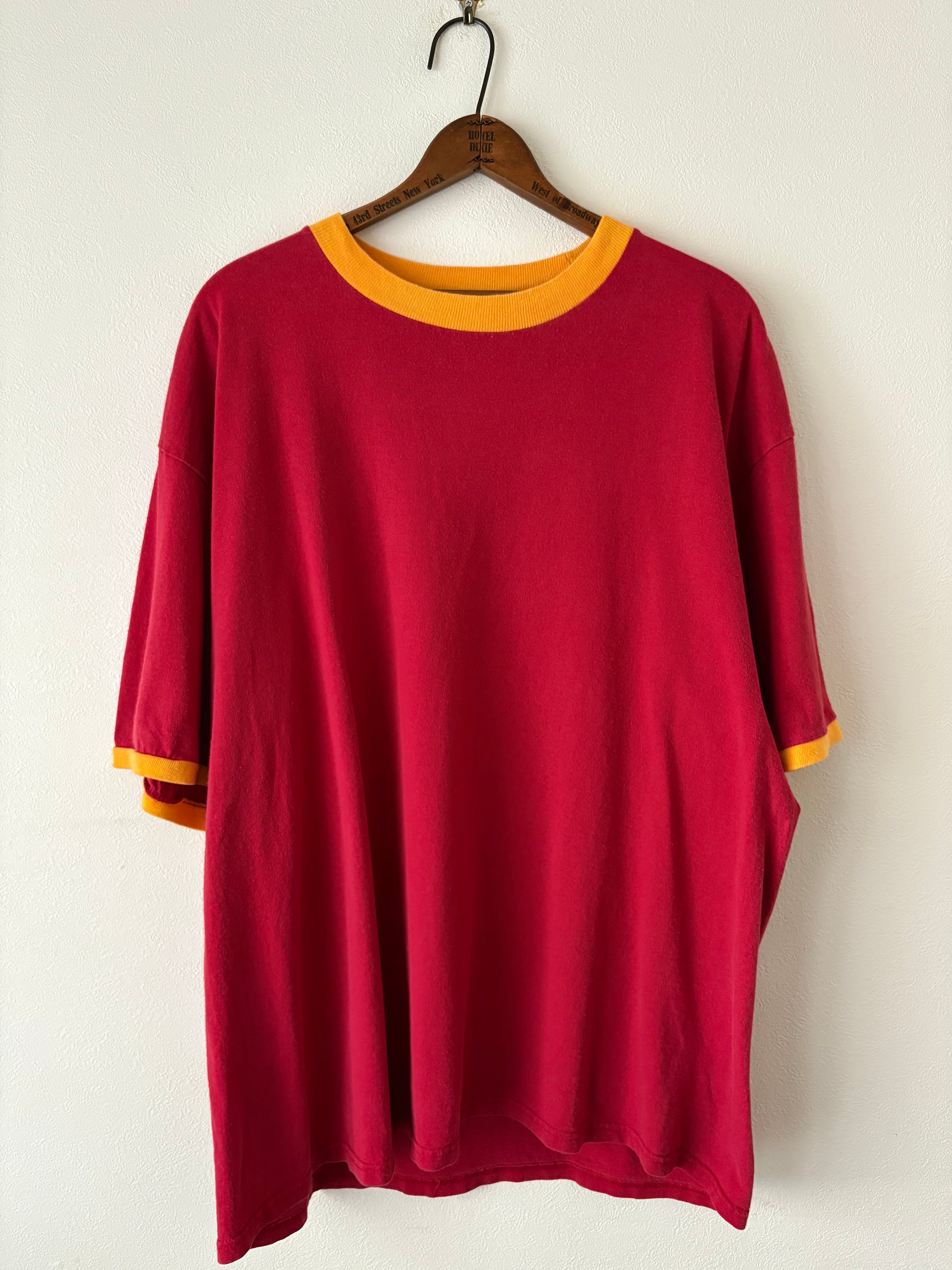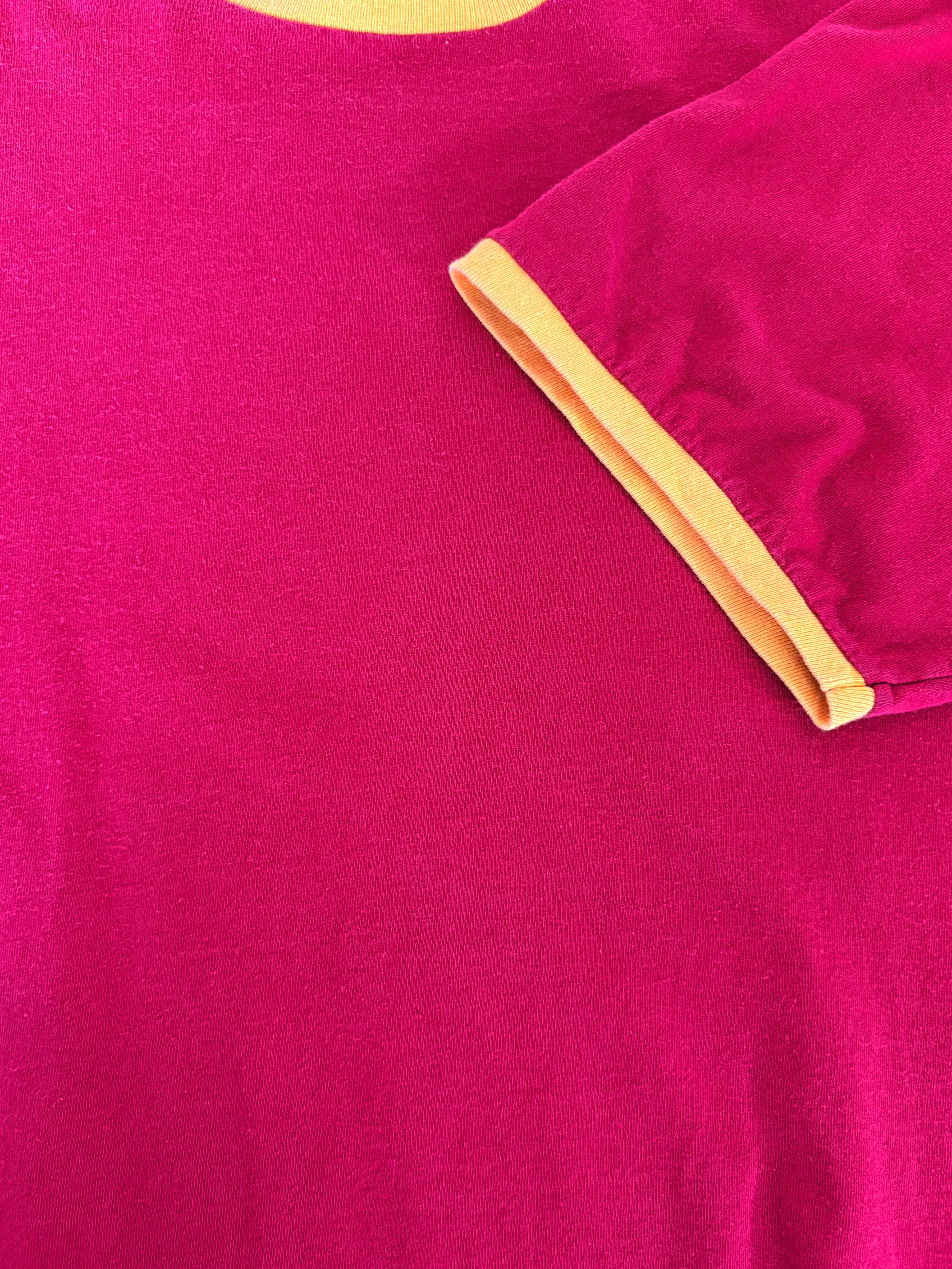 暗めの赤とマスタードイエローで組み合わされたレトロな色味のリンガーTです。プリントはなくシンプルなデザインですが、反対色に近いカラーの組み合わせなので、アイテム自体の存在感があり、シンプルなボトムスと合わせてもらうだけで、スタイリングが決まりやすいです。ボディがワイドなのでゆったり着ていただけるアイテムです。