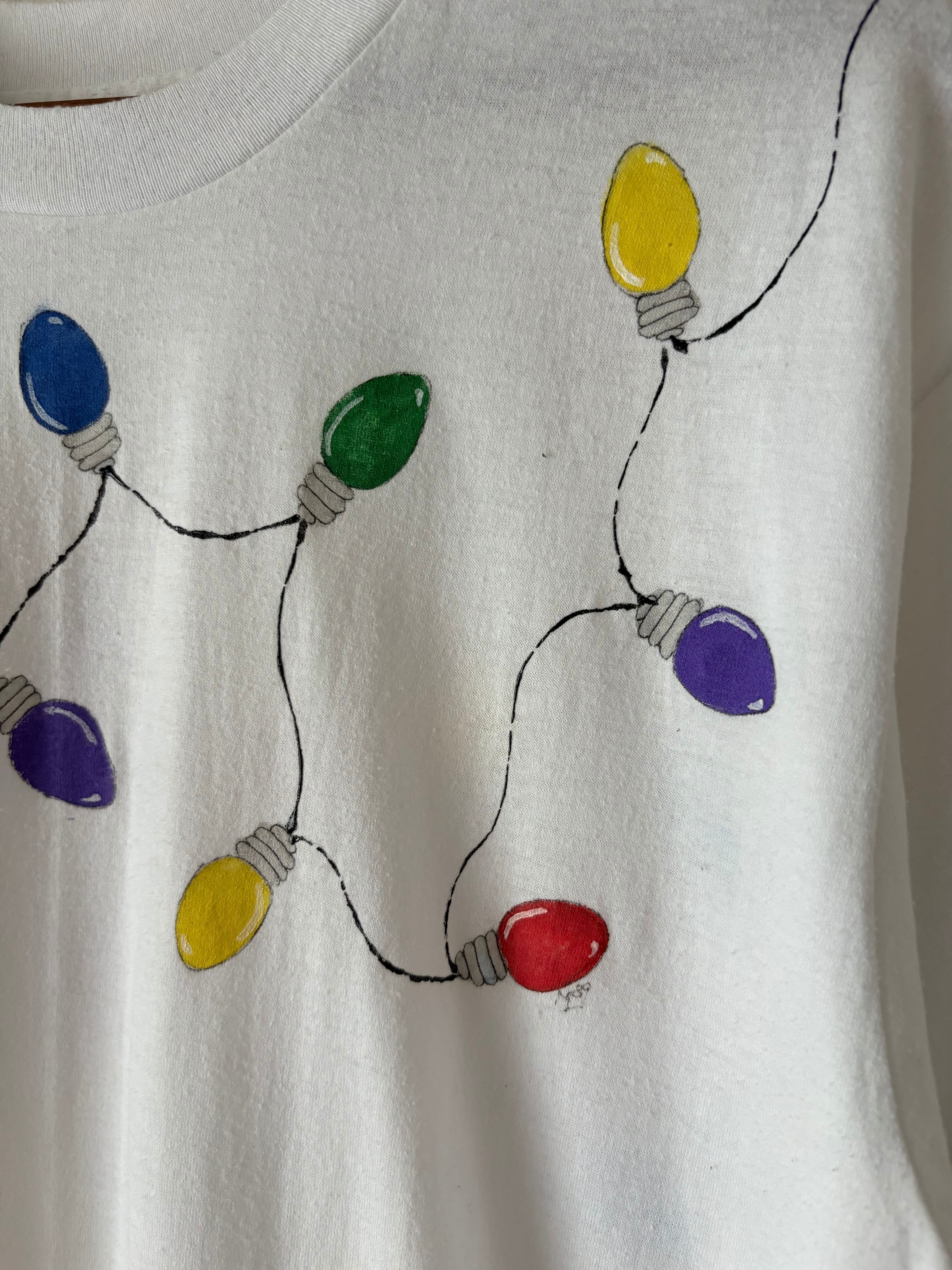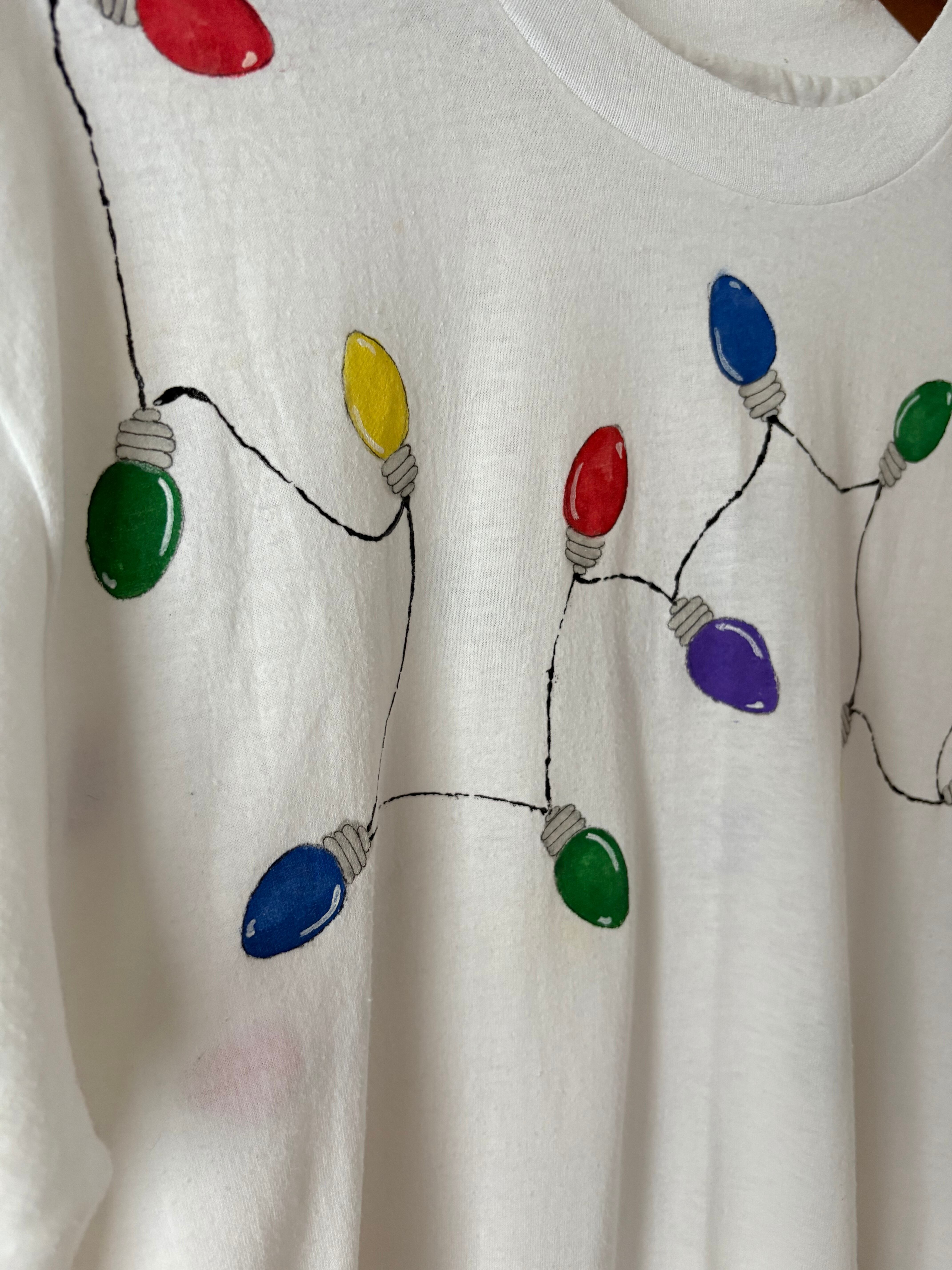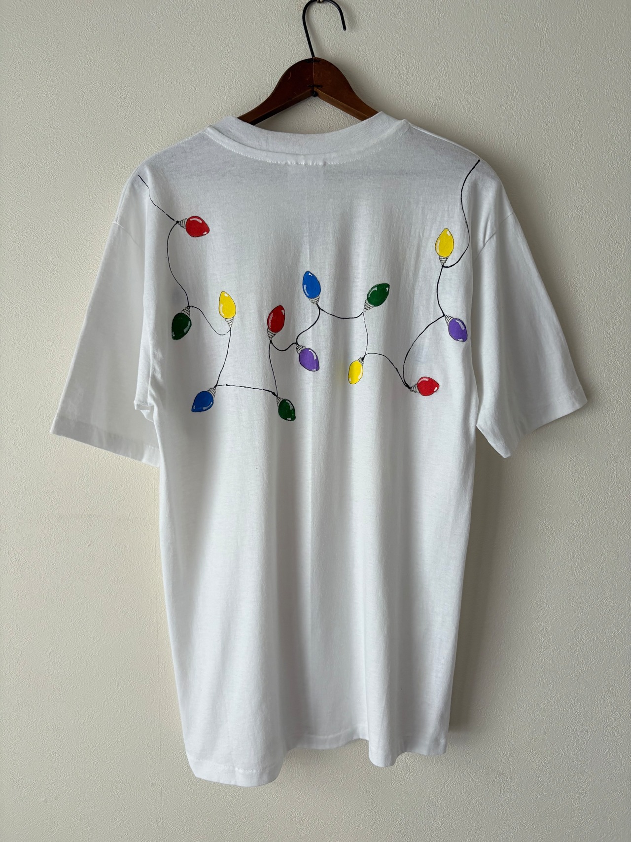 襟元からバストまでをぐるっと電飾用のライトが一周しているかわいいTシャツです。繊細なタッチの絵柄とカラフルな色使いが男女問わず合わせやすいデザインとなっております。ハンドペイントならではの一枚だけのデザインを楽しめます。