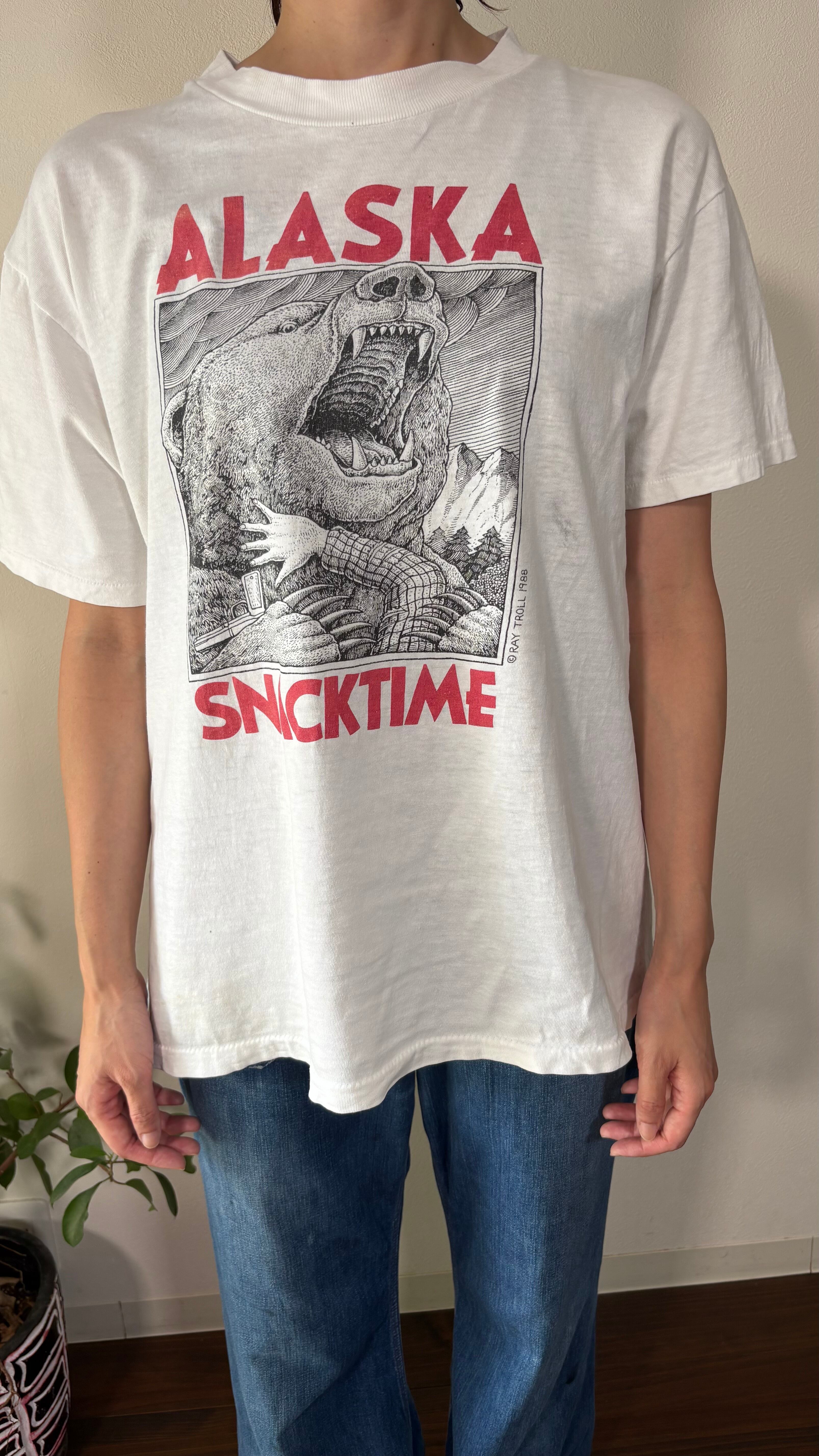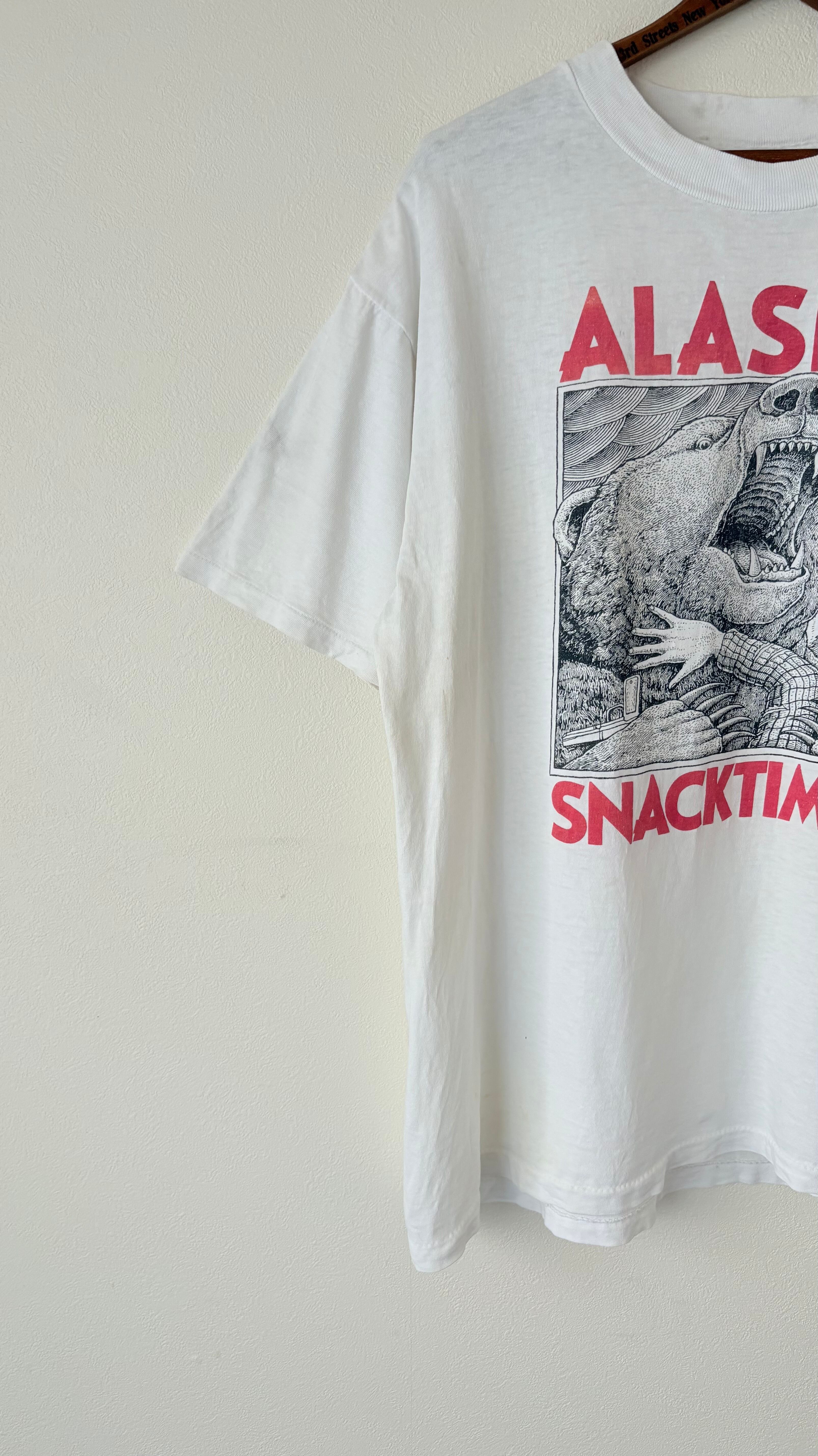 グッドプリントのおすすめアイテムです。人が襲われているのが読み取れる手と熊の下に“SNACK TIME“。シャレが効いてるとはまさにこの事と言いたくなるようなデザインです。