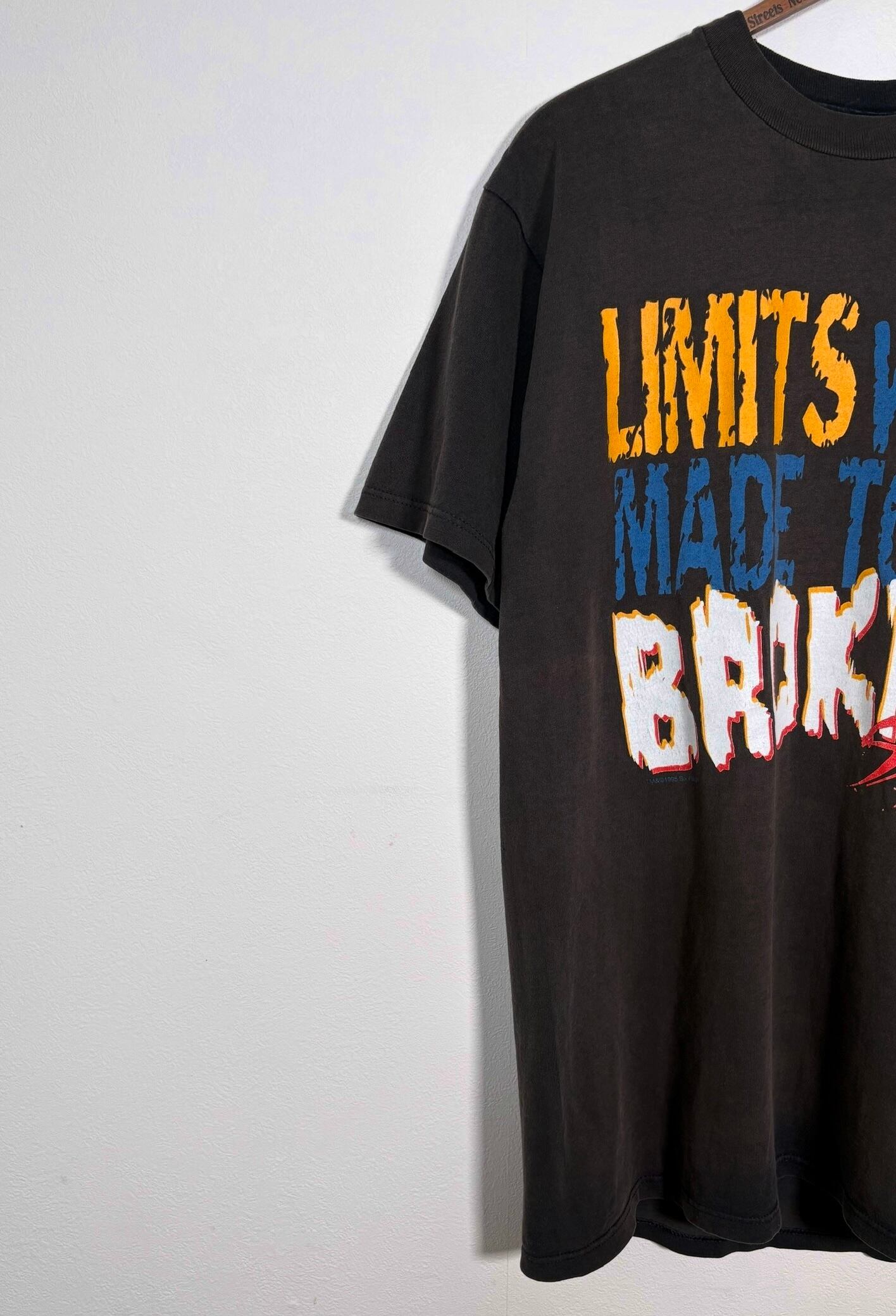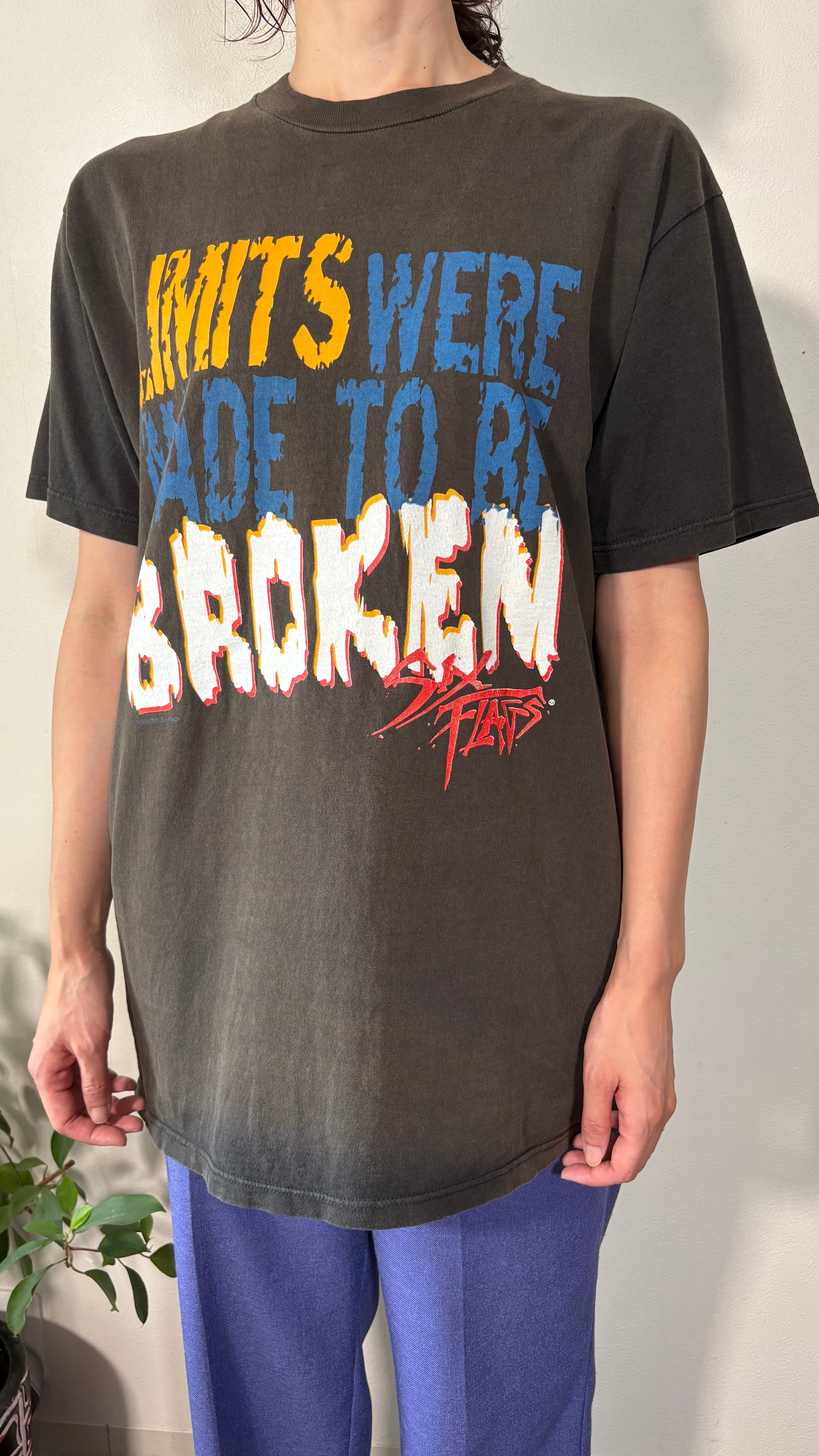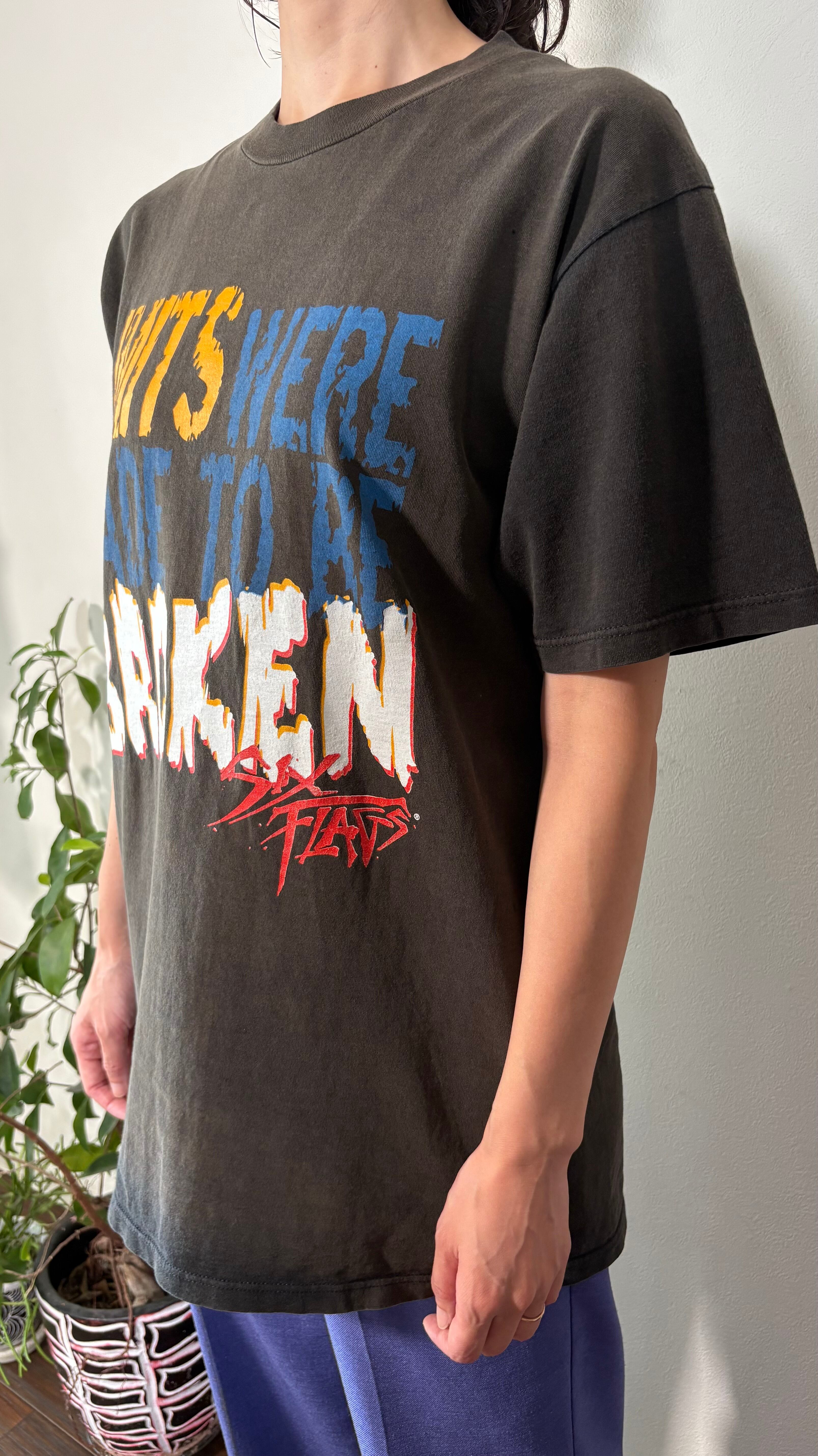アメリカ各地にある有名な遊園地のTシャツです。絶叫系コースターなどを連想させるようなフォントがかっこいいです。バックの首元にだけあるプリントもポイントになっています。色の組み合わせも良く全体的にバランスのいいプリントです。シルエットも細すぎず太すぎず、着用時にボトムを選ばないシルエットです。