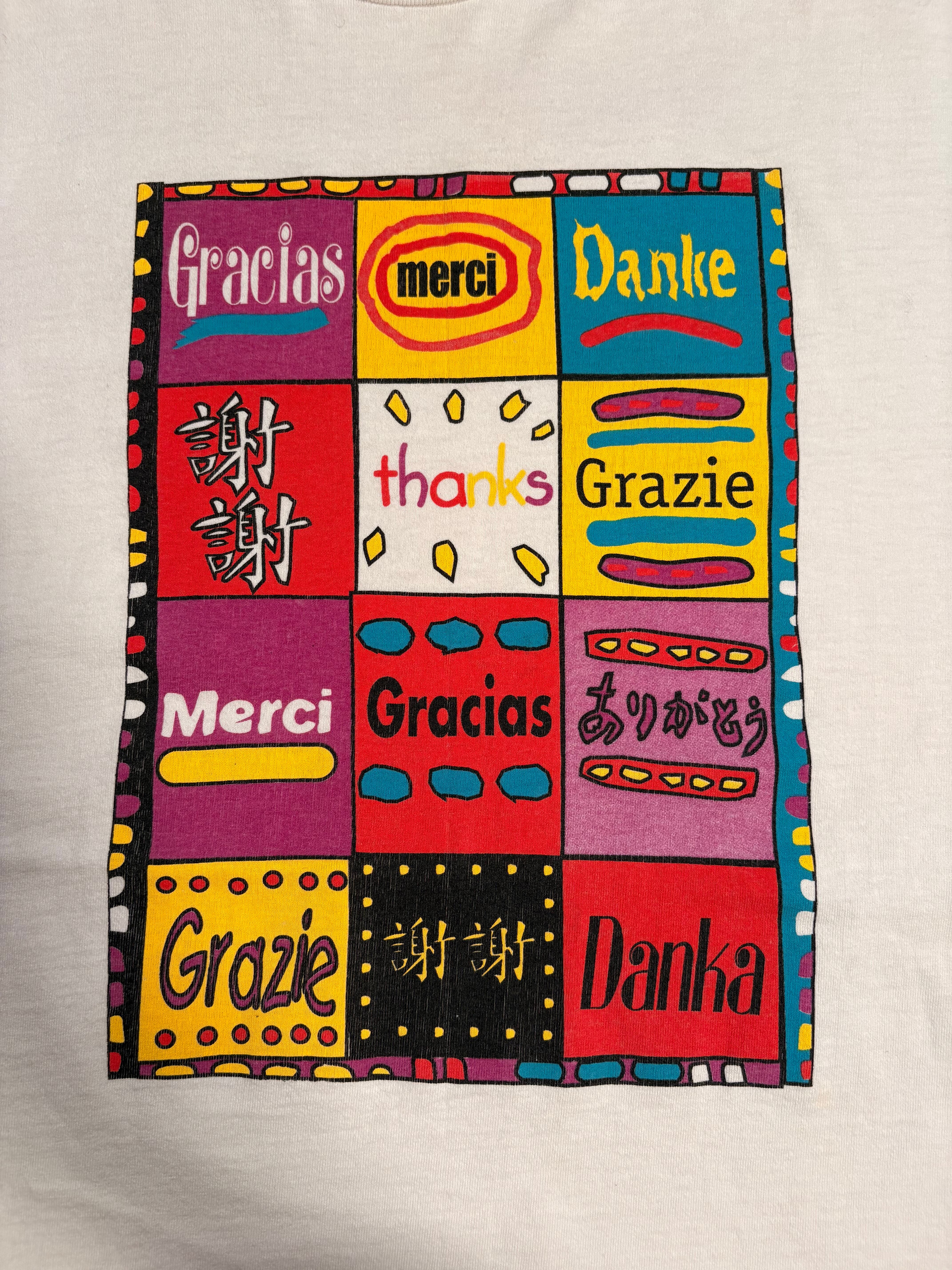色んな国の言葉で"ありがとう"がデザインされています。シンプルなメッセージにポップな色味が楽しいTシャツです。バックに色んな企業名がプリントされているところから、何らかのイベントに関係するTシャツと思われます。大きめのゆったりサイズでコットン100の薄過ぎず厚すぎずな丁度いい生地感です。