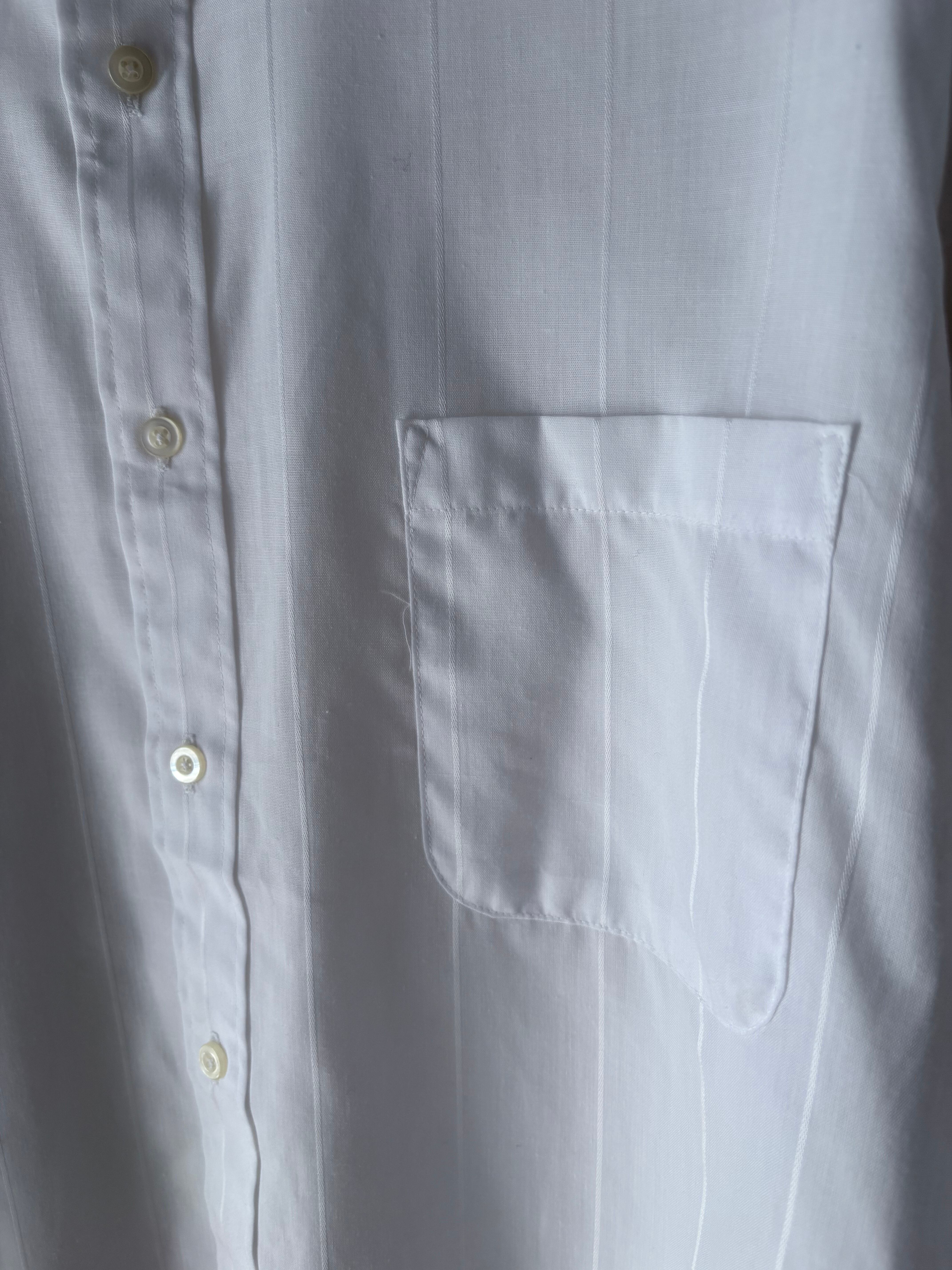 上品な風合いの白シャツです。透け感のあるベースの生地に幅が広いストライプがアクセントになっています。普段着としてラフなボトムスと合わせたり、フォーマルスタイルでのスラックスとも相性がいい品のあるアイテムです。襟が少し小さめなので、かっちりしすぎないところもポイントです。