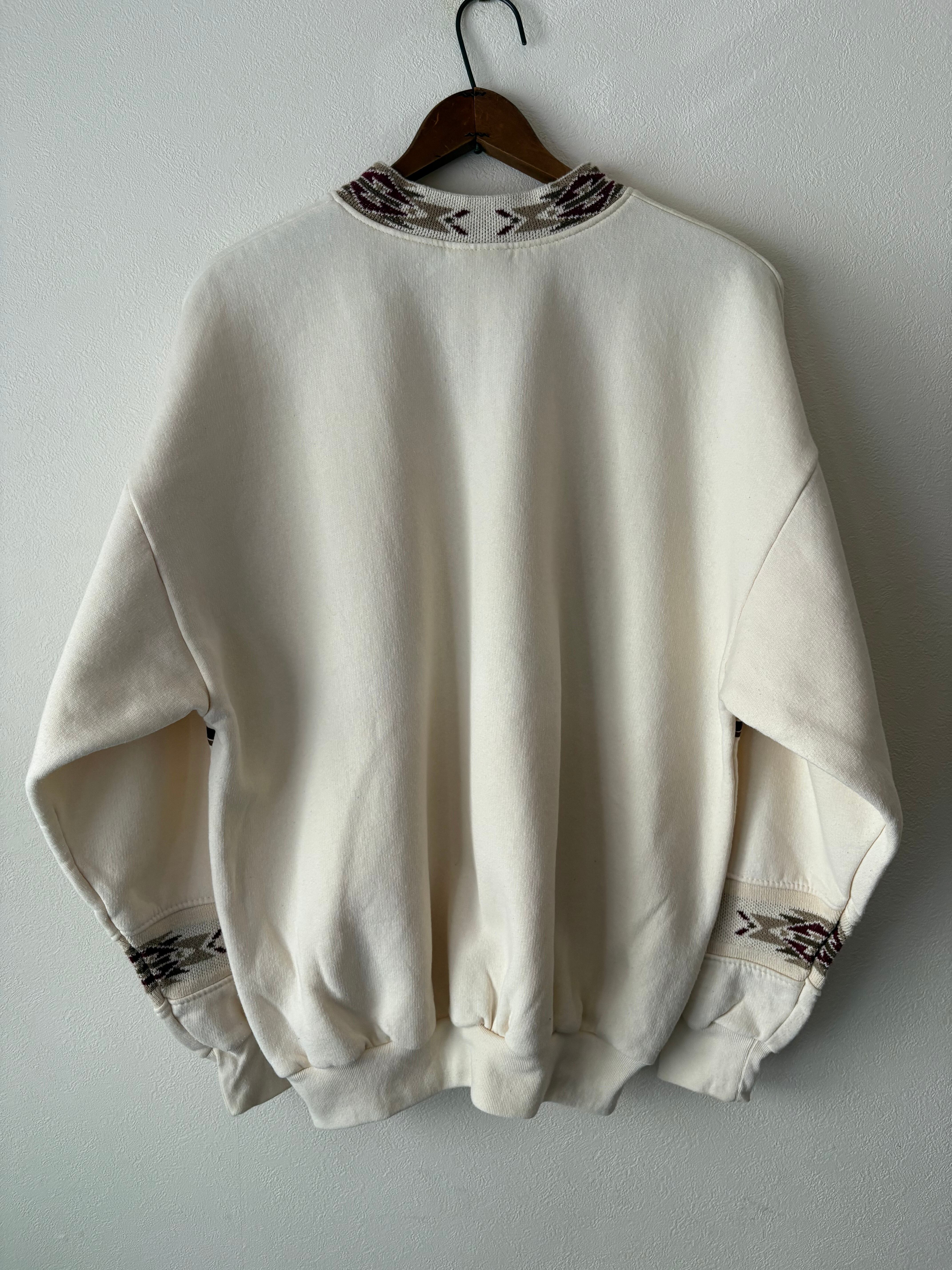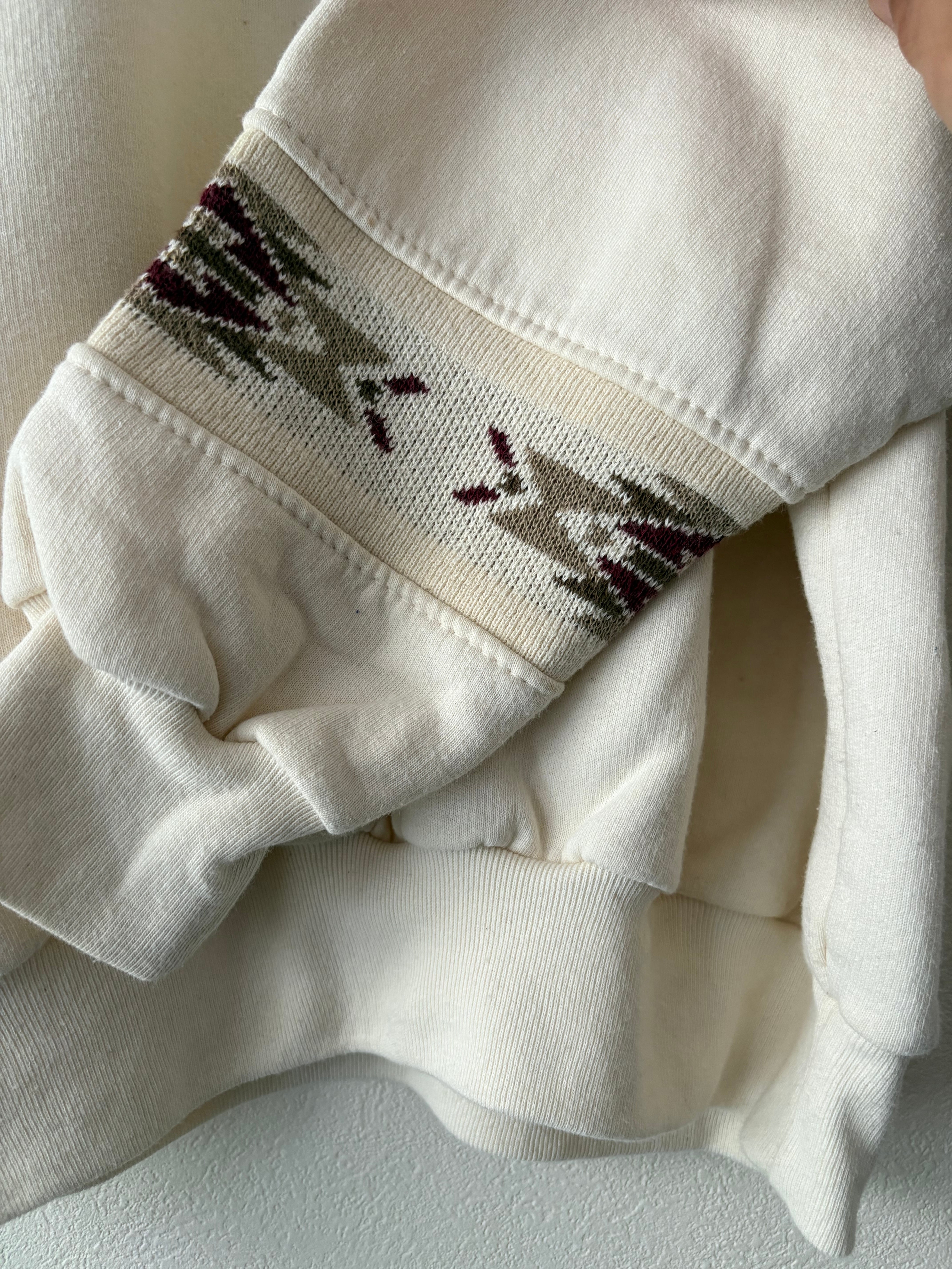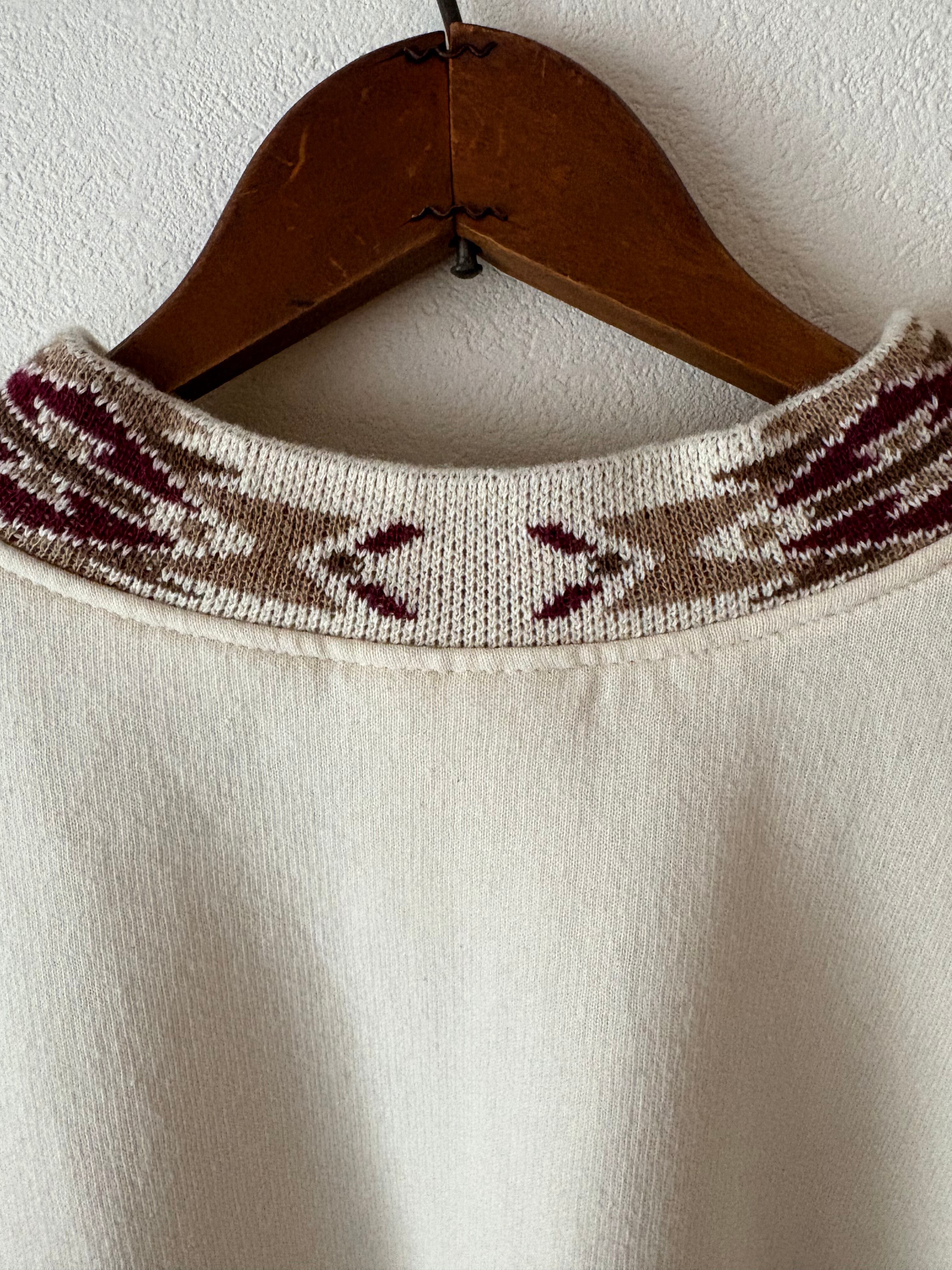 このブランドではオールオーバープリントや風景、動物をプリントしたアイテムをよく目にします。その中でもこちらのスウェットはヘンリーネックでネックと袖がネイティブ柄のジャガード織と手の込んだ作りのスウェットです。