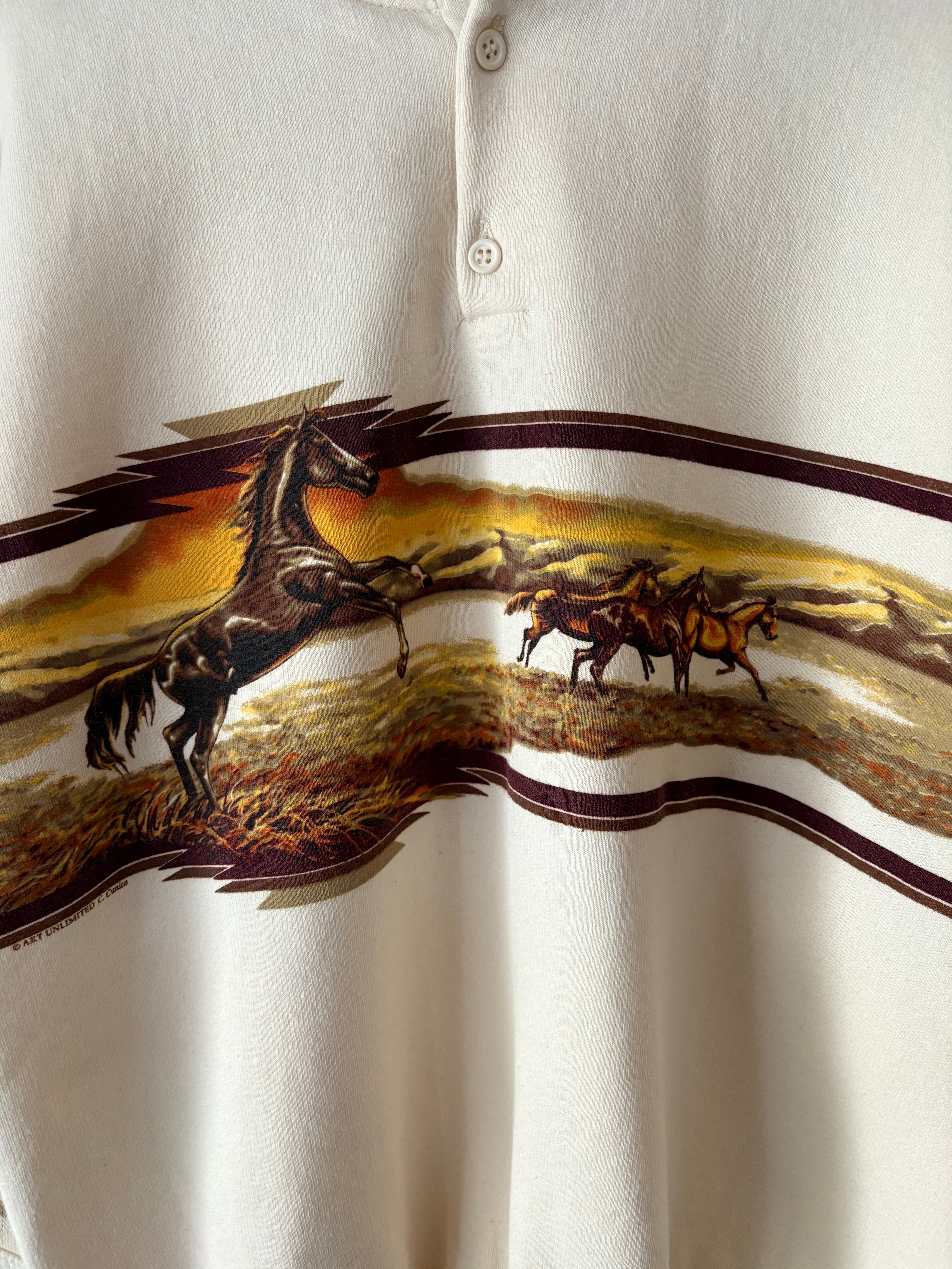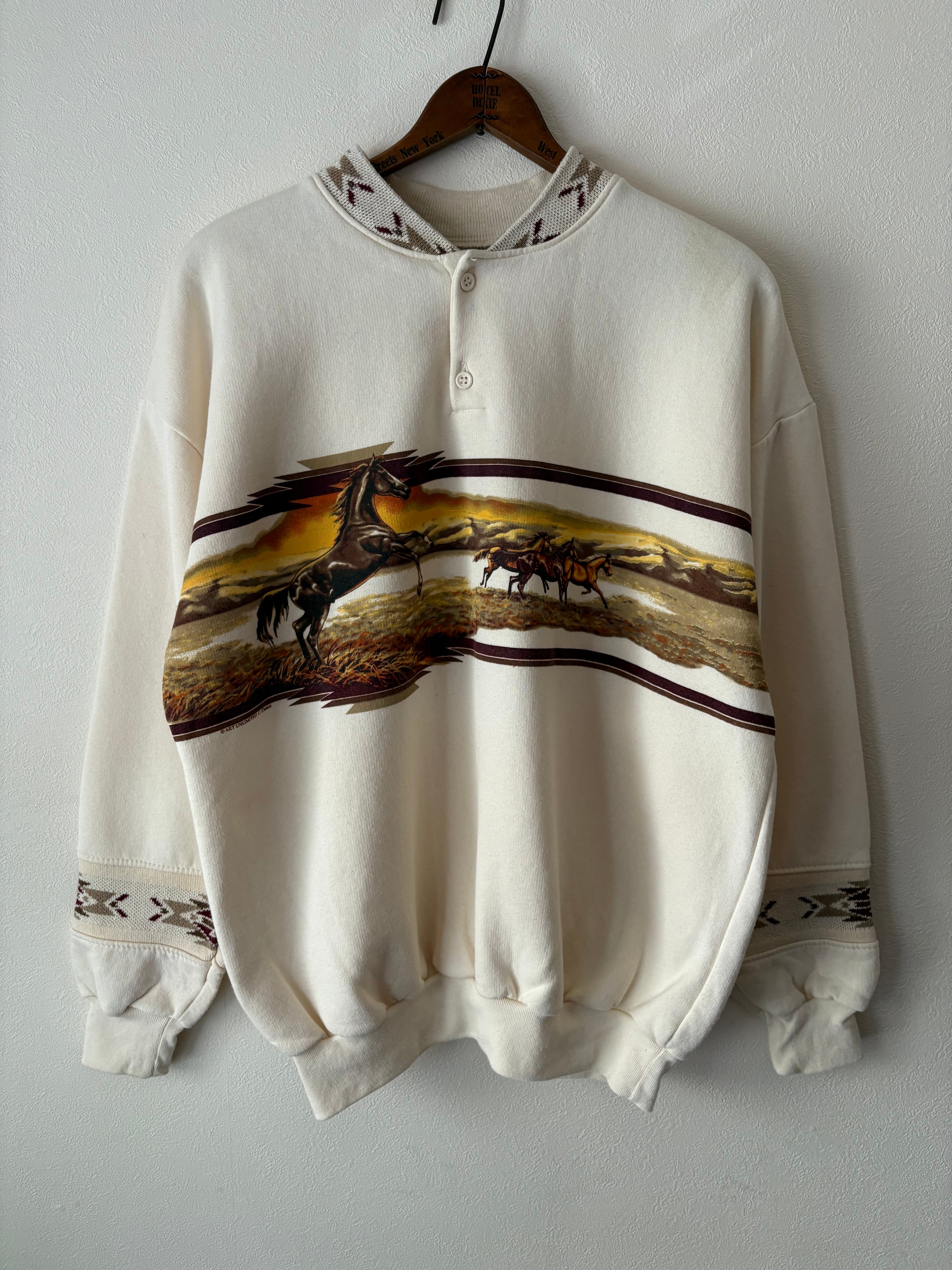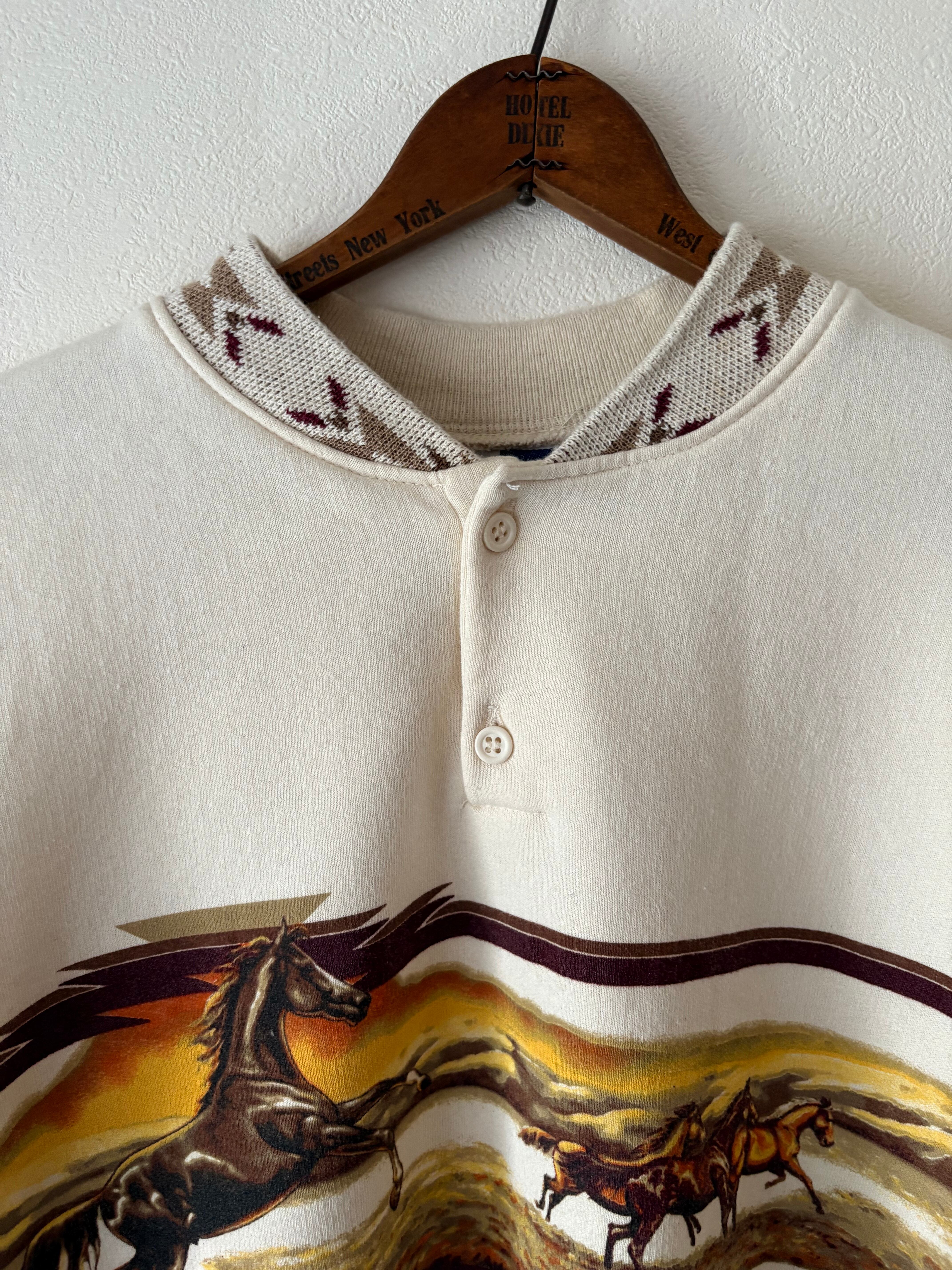 このブランドではオールオーバープリントや風景、動物をプリントしたアイテムをよく目にします。その中でもこちらのスウェットはヘンリーネックでネックと袖がネイティブ柄のジャガード織と手の込んだ作りのスウェットです。