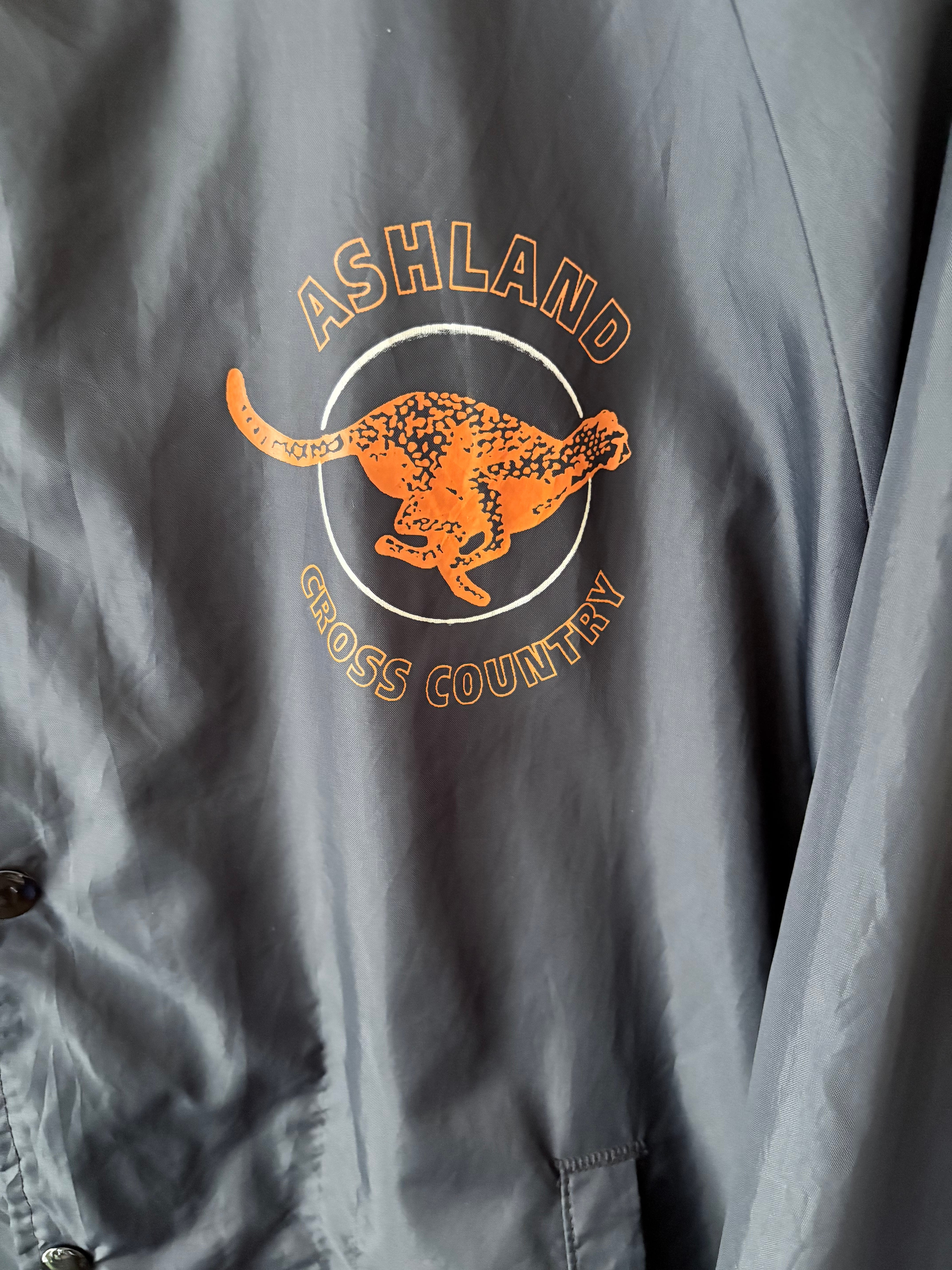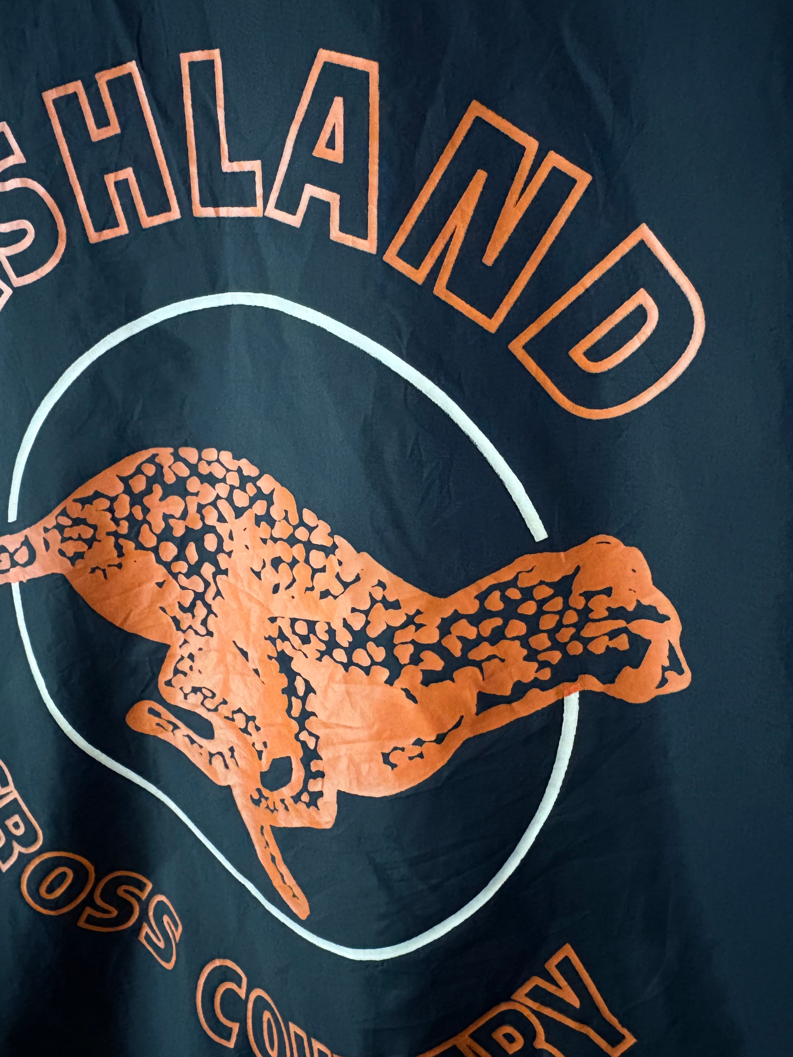 胸と背面にバランスよくチーターのプリントが入ったコーチジャケット。特に背面はインパクトが強いプリントでかっこいいです。ブラックとオレンジの配色も◎