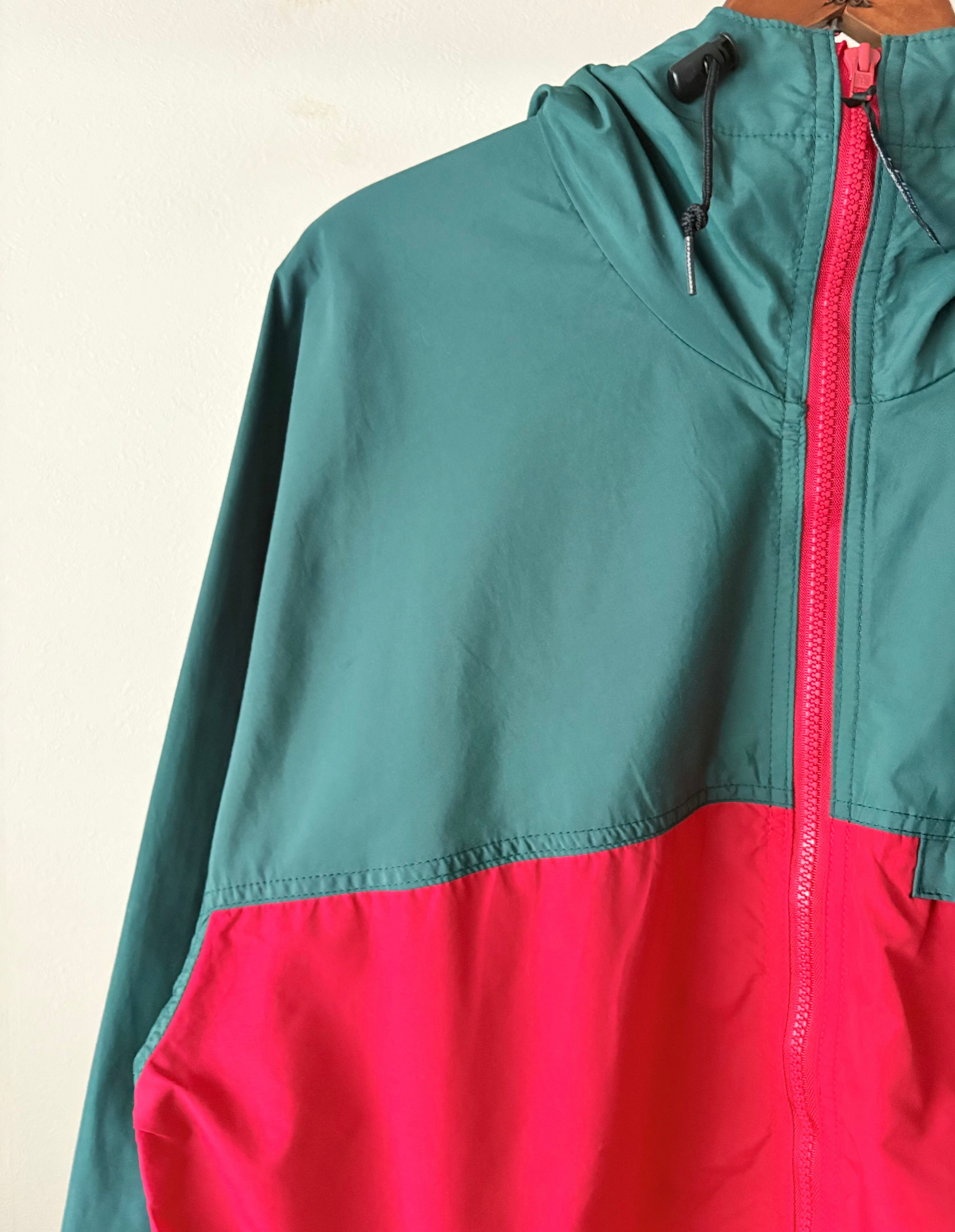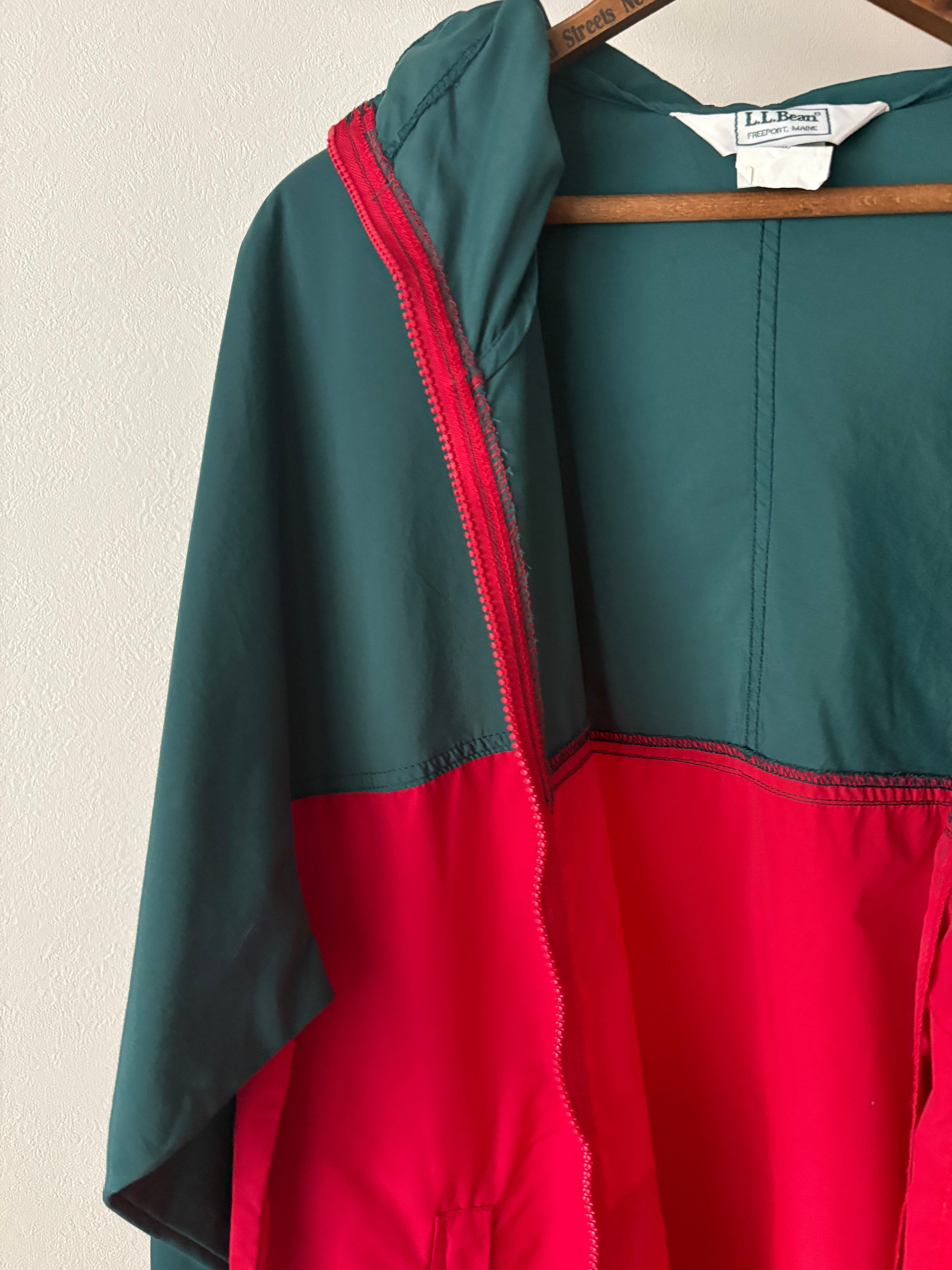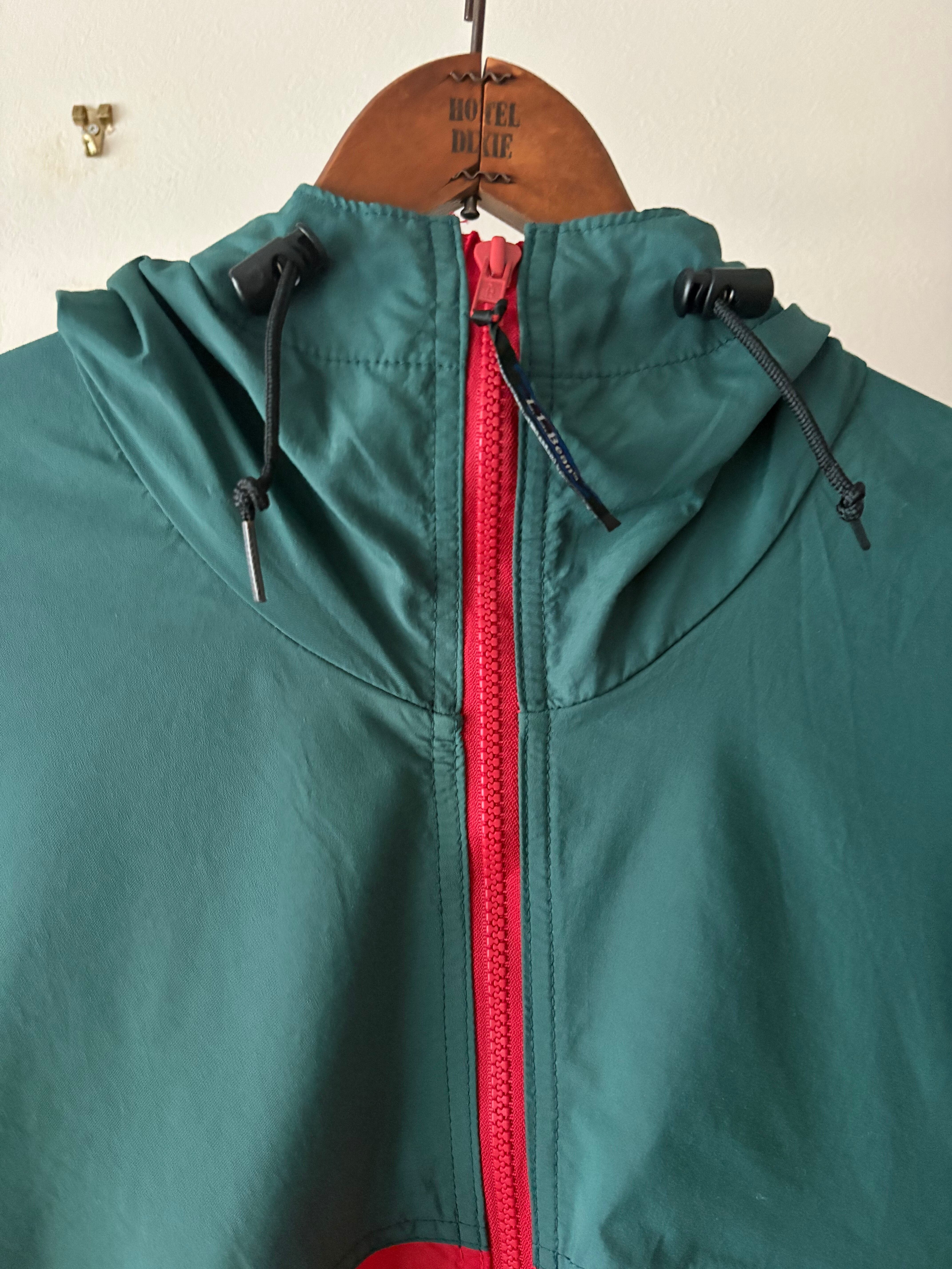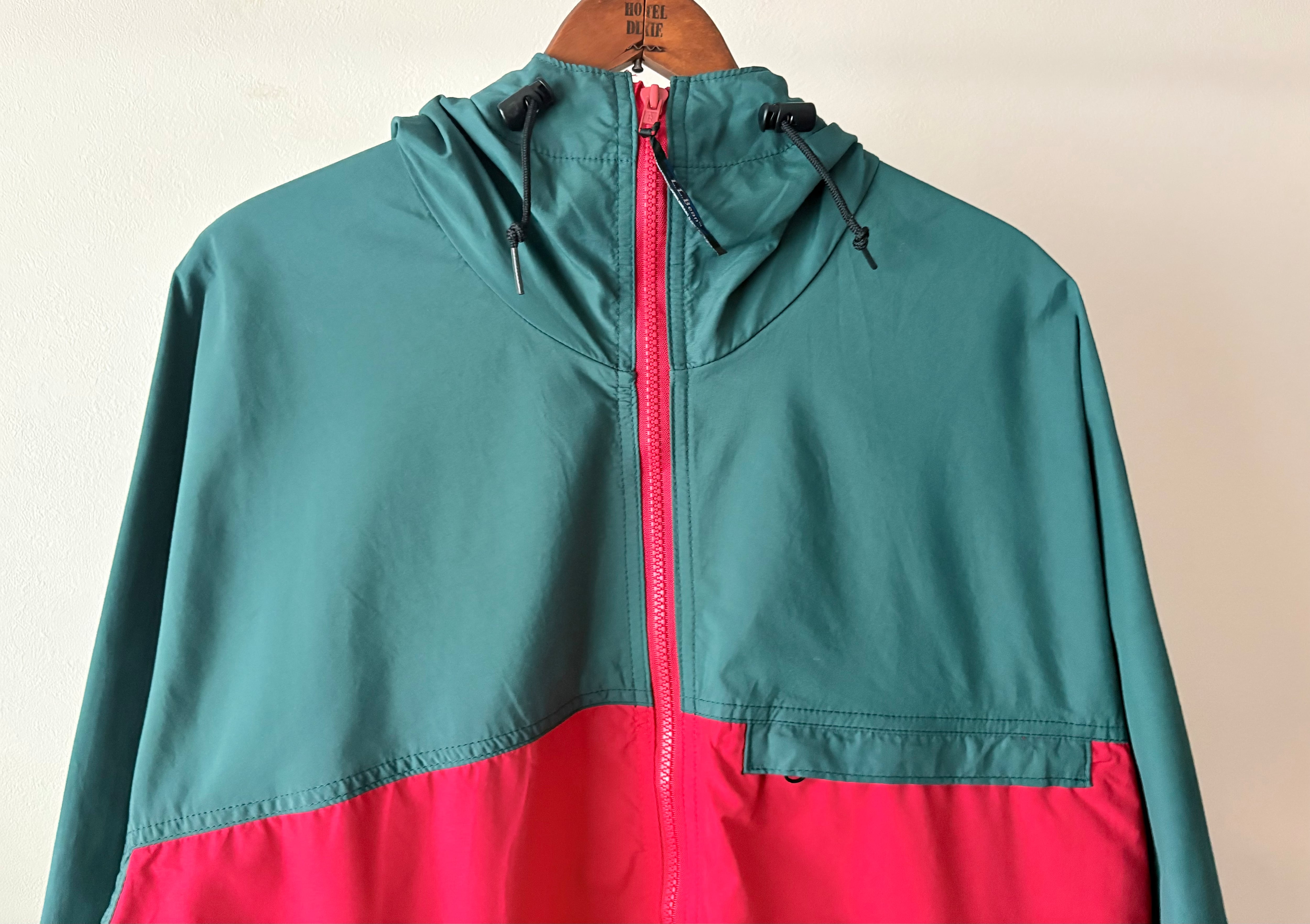 配色の良い薄手のナイロンパーカー。グリーン×レッドのカジュアルな組み合わせでデニムやワークパンツと相性良いかと思います。