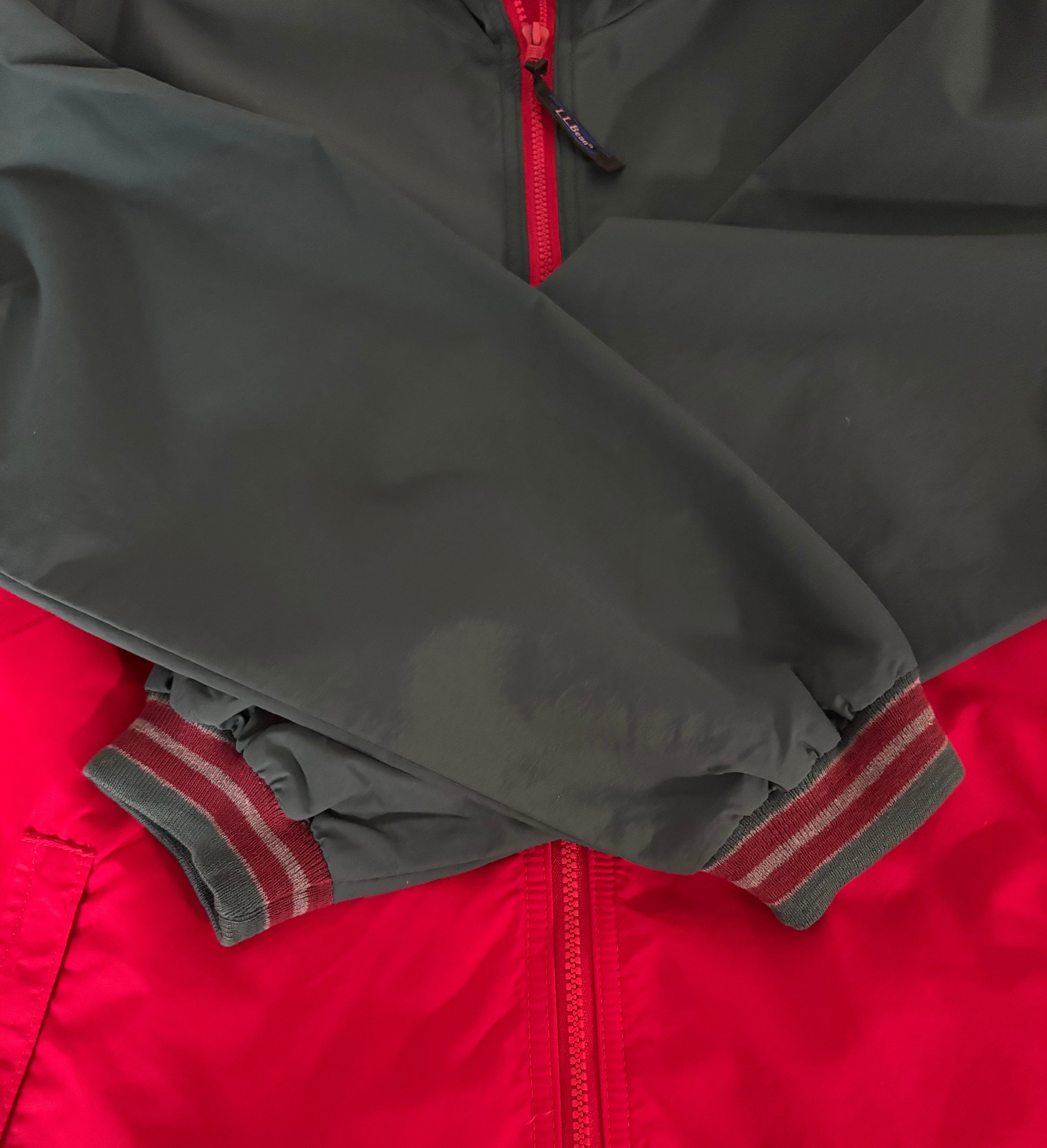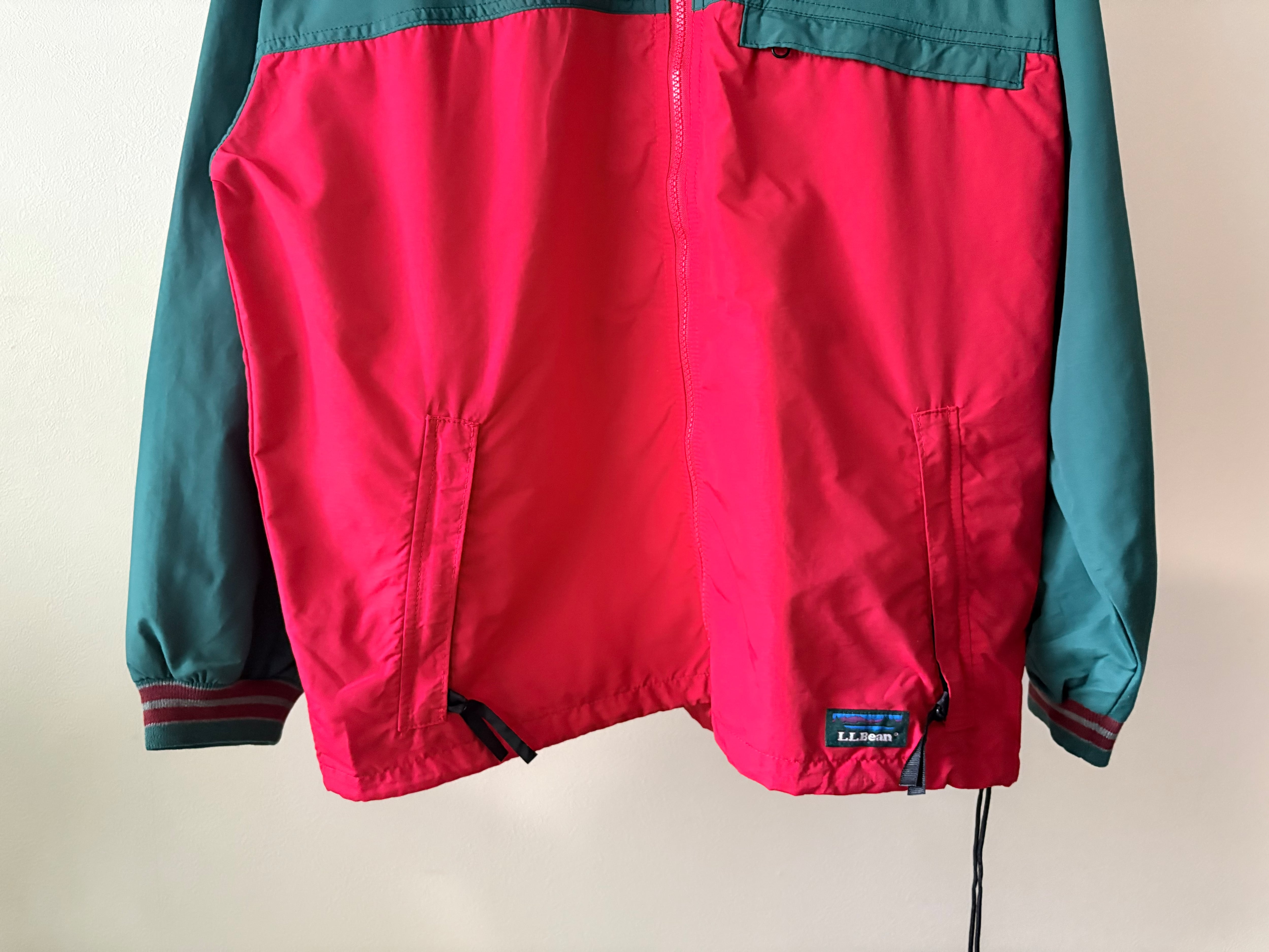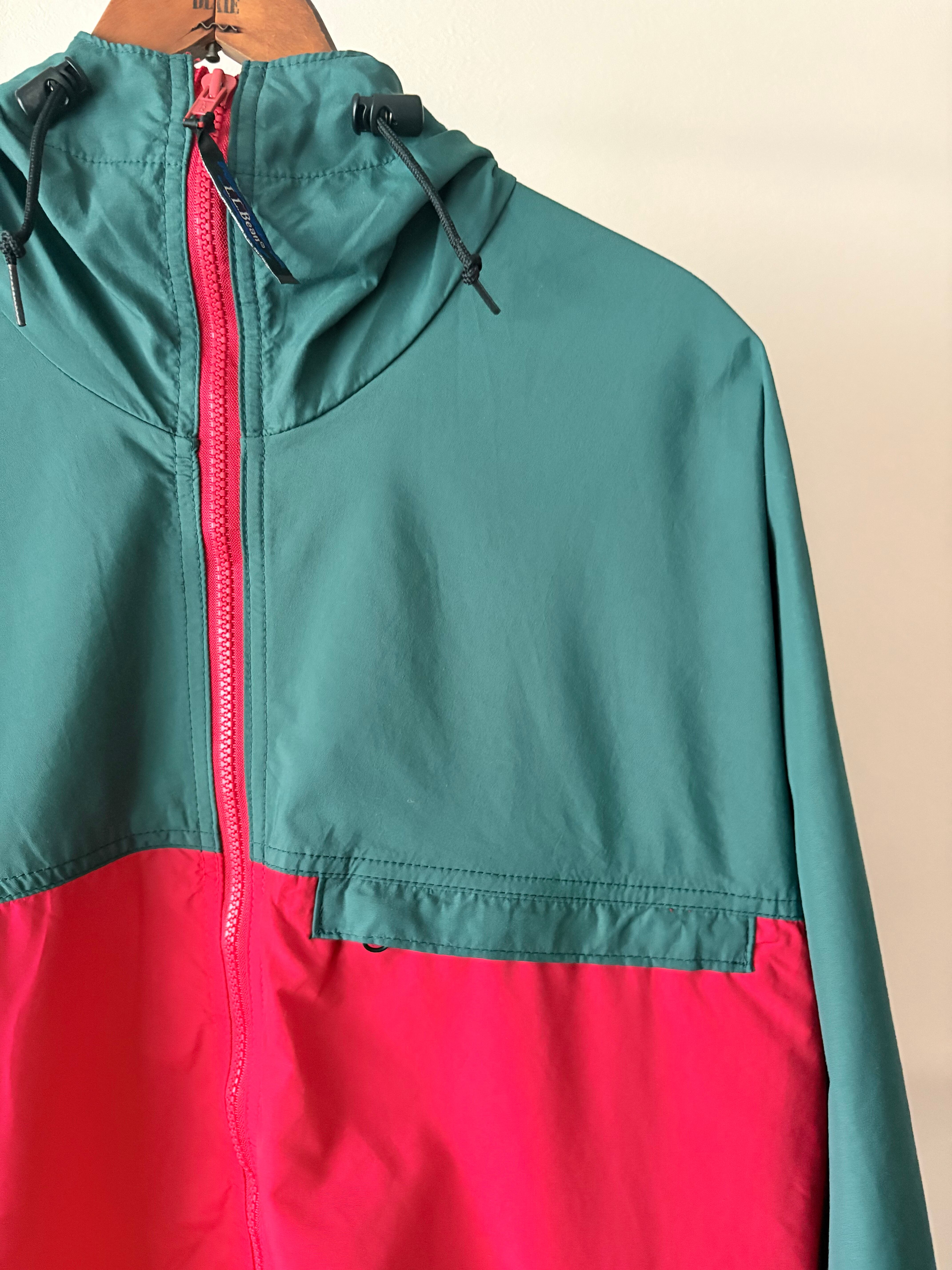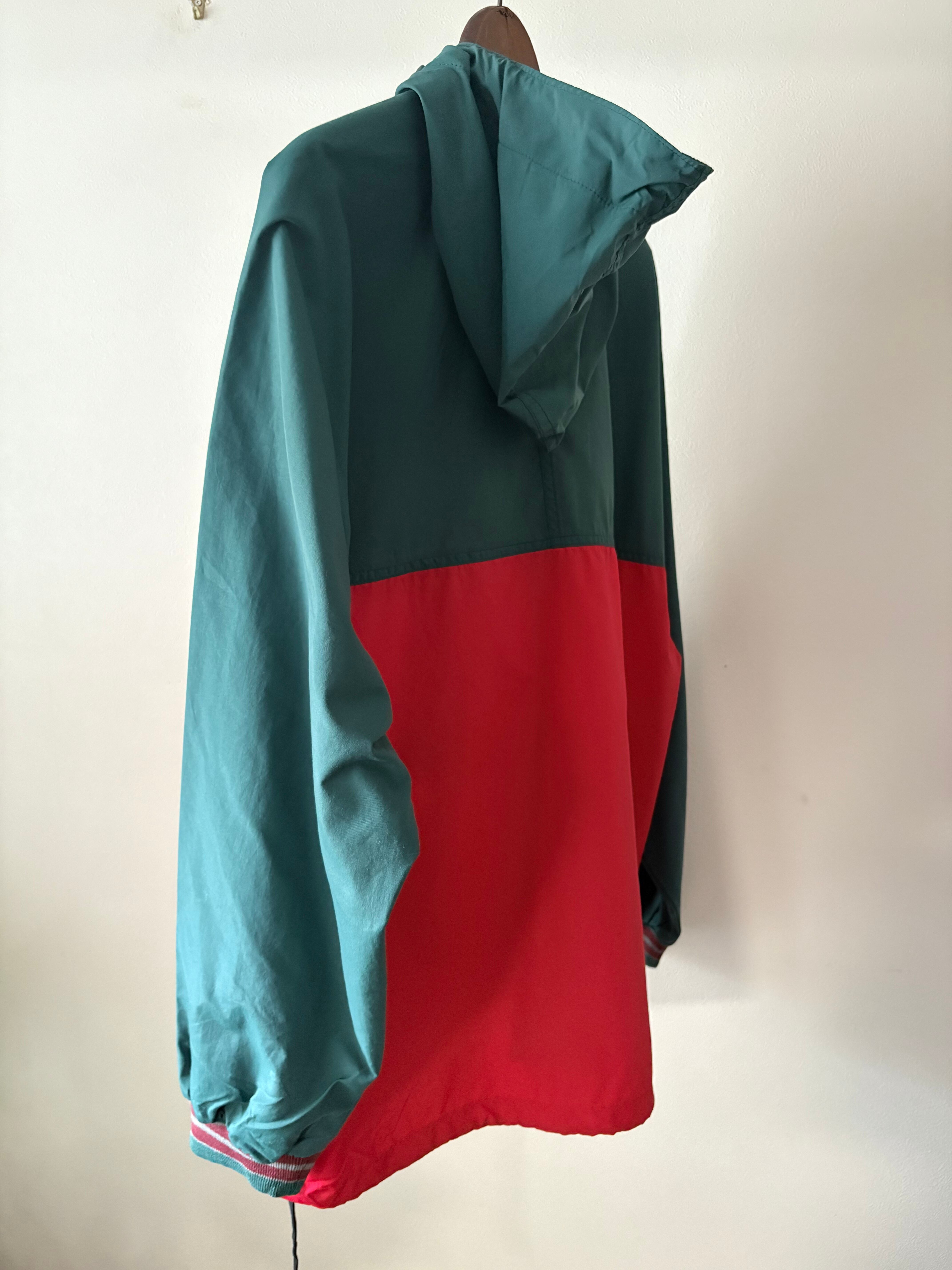 配色の良い薄手のナイロンパーカー。グリーン×レッドのカジュアルな組み合わせでデニムやワークパンツと相性良いかと思います。