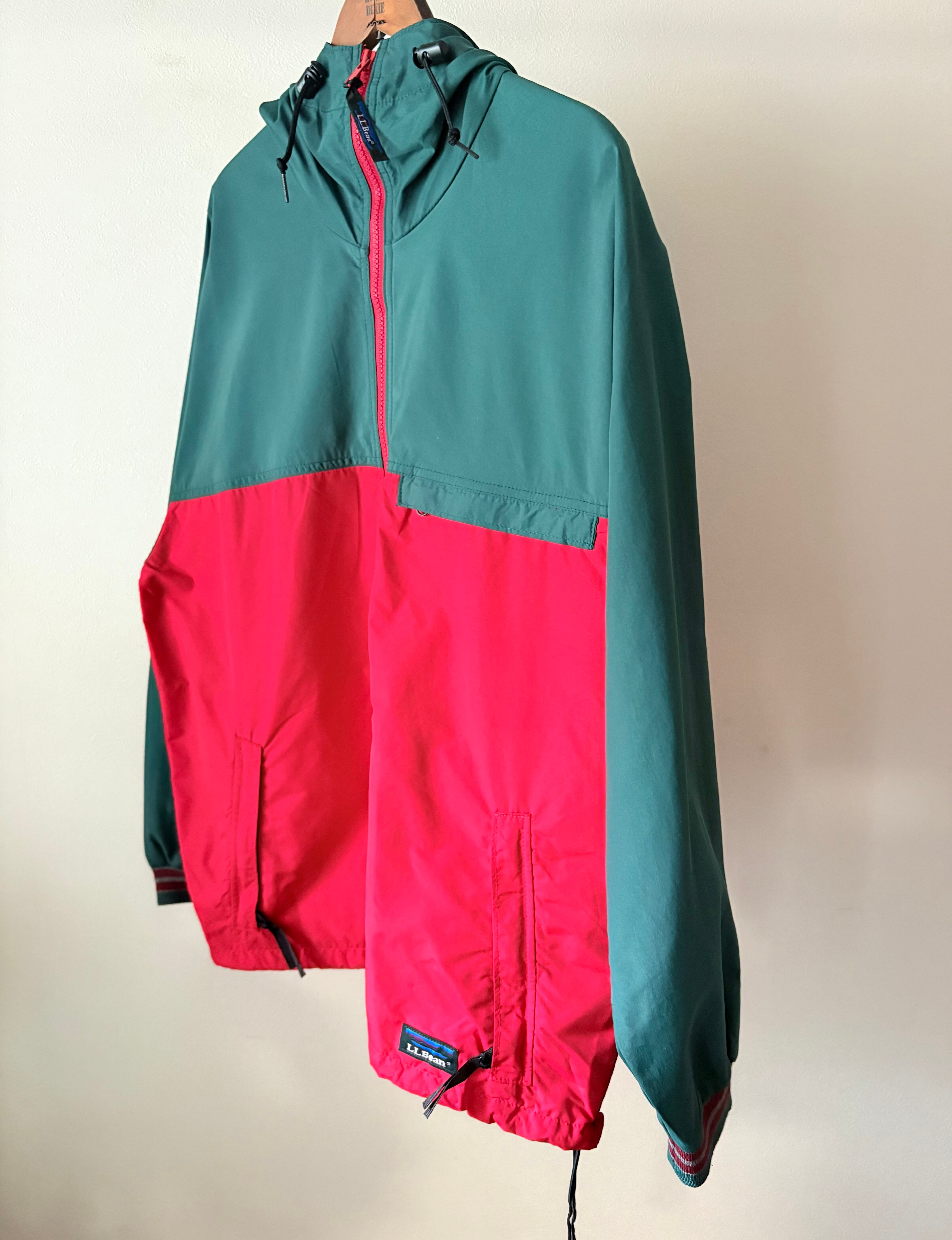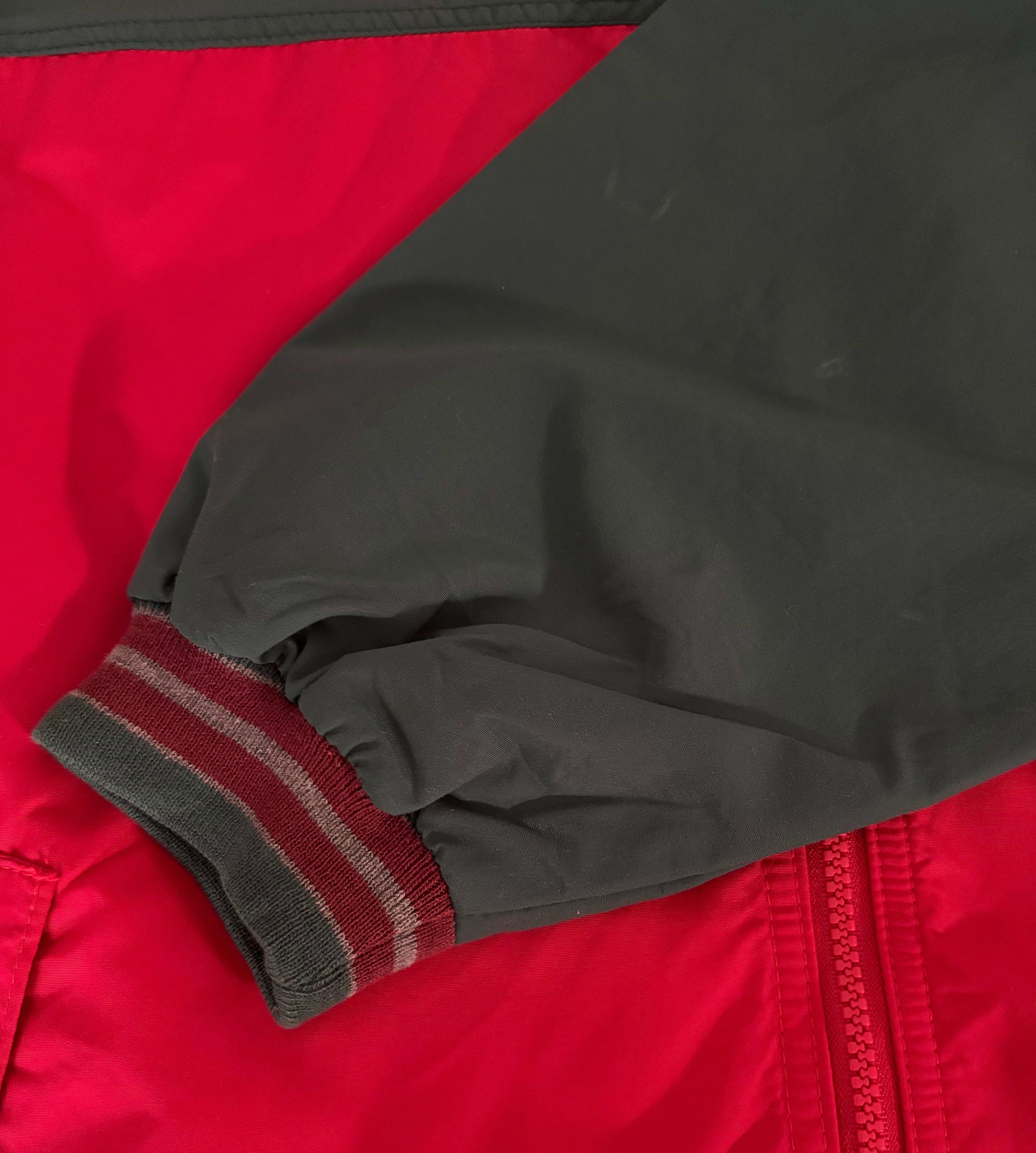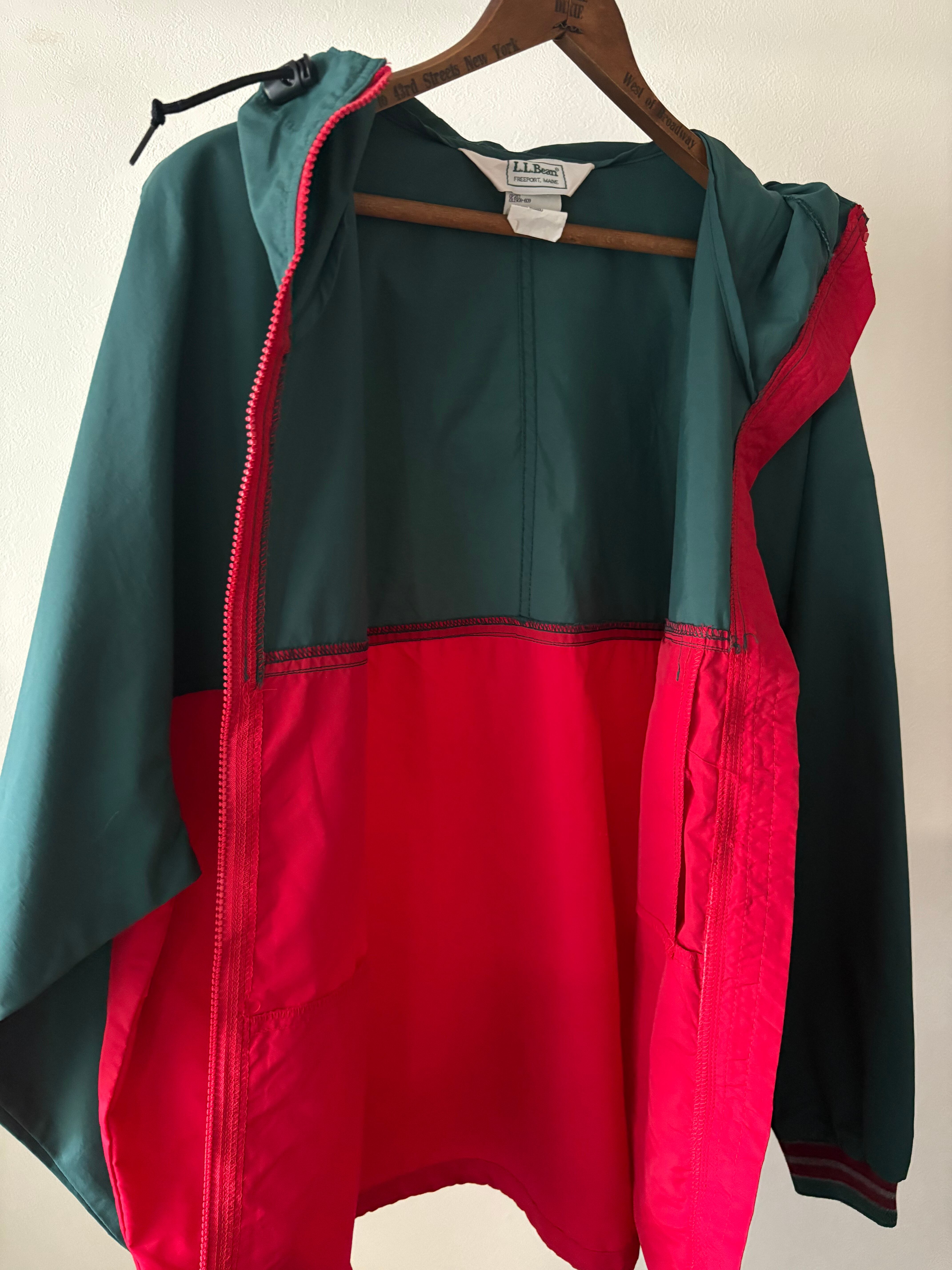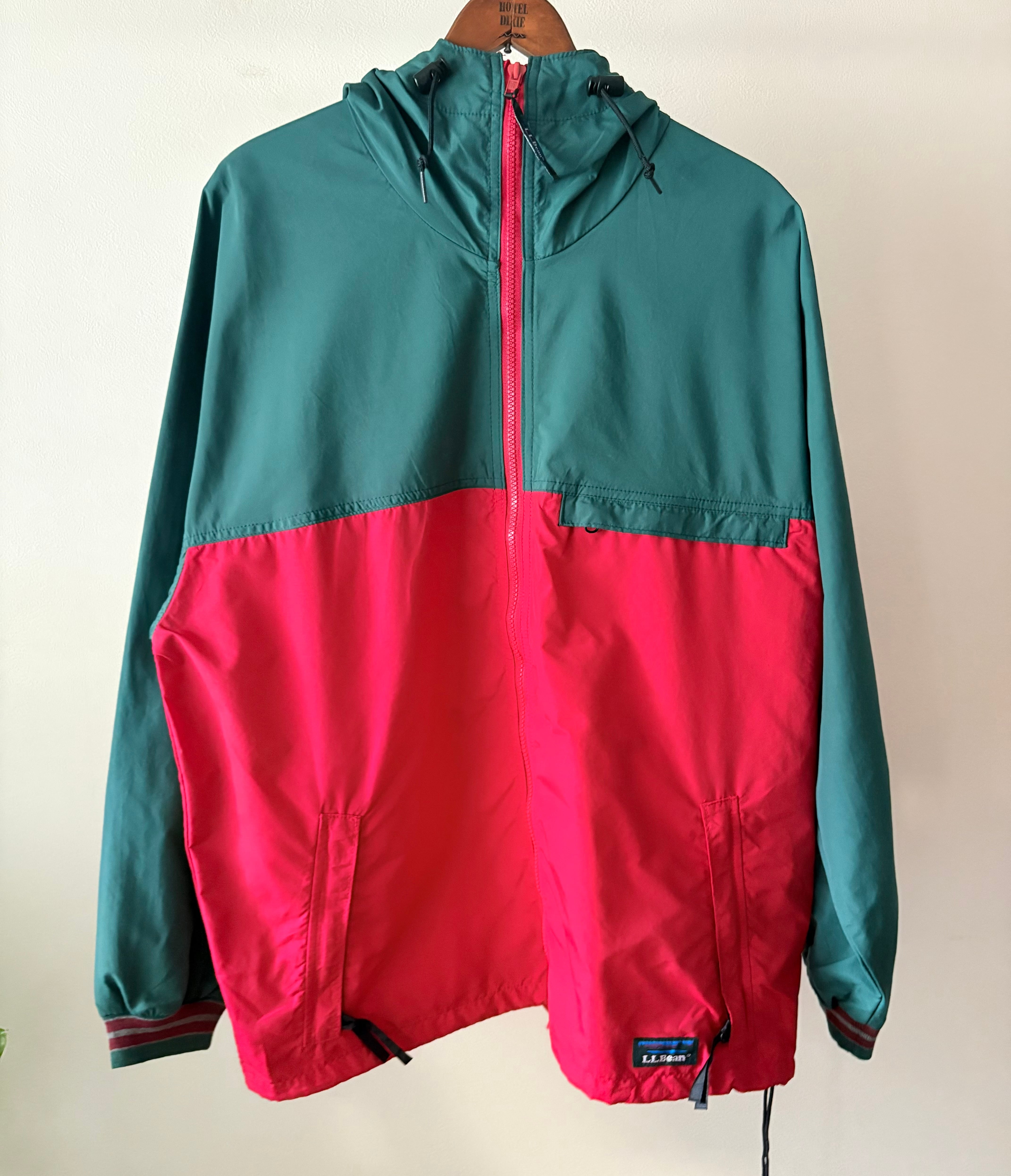 配色の良い薄手のナイロンパーカー。グリーン×レッドのカジュアルな組み合わせでデニムやワークパンツと相性良いかと思います。