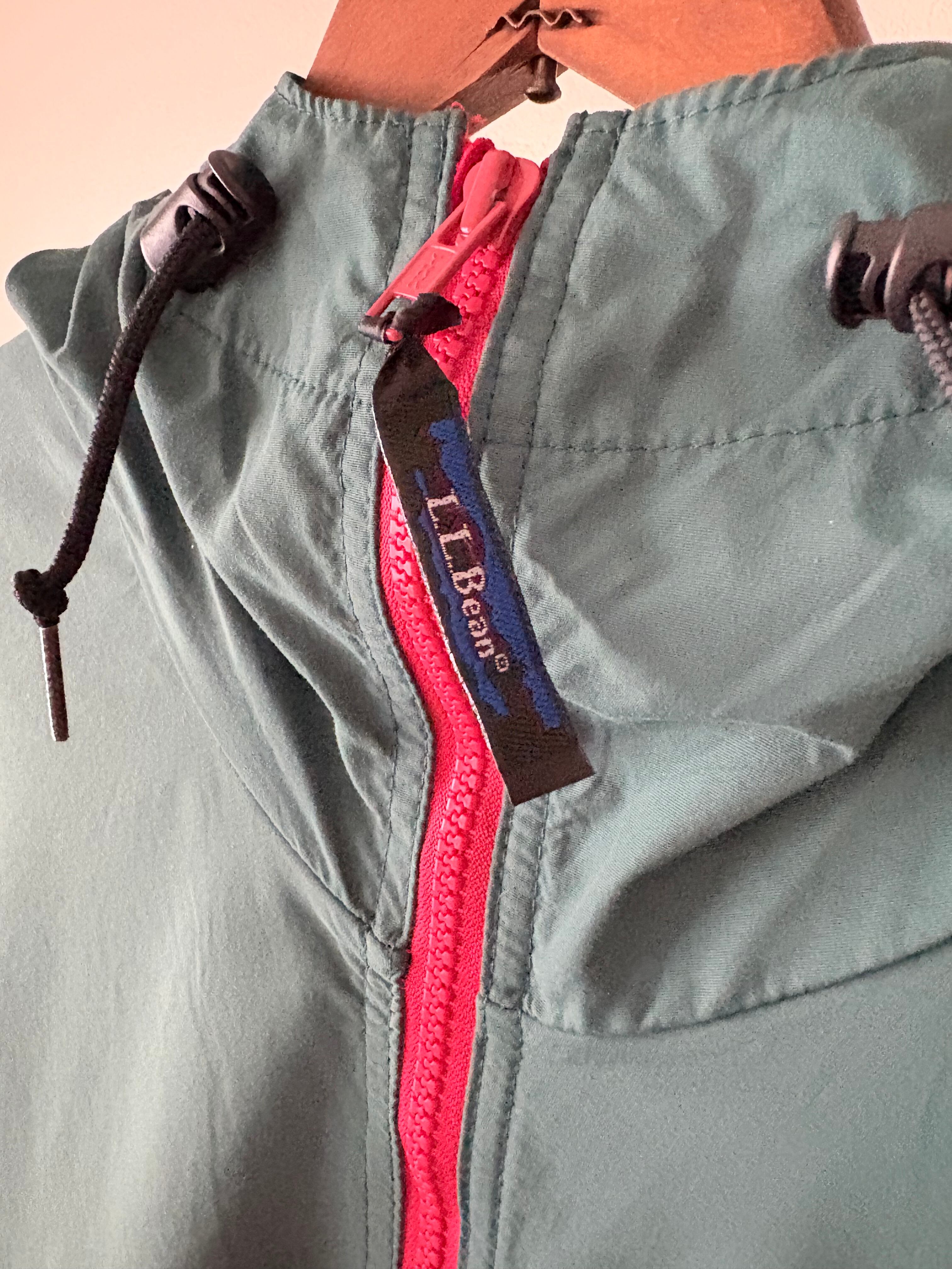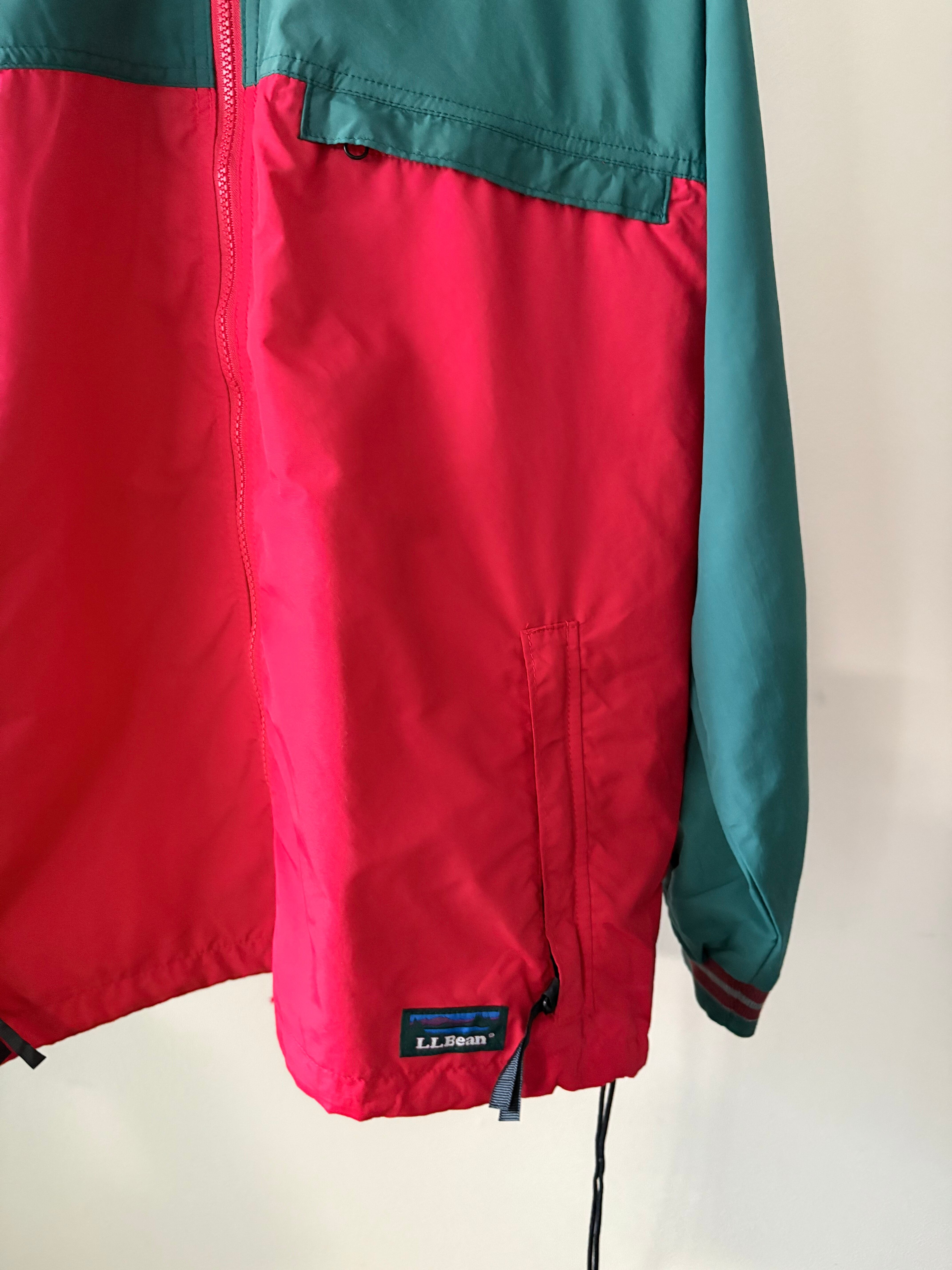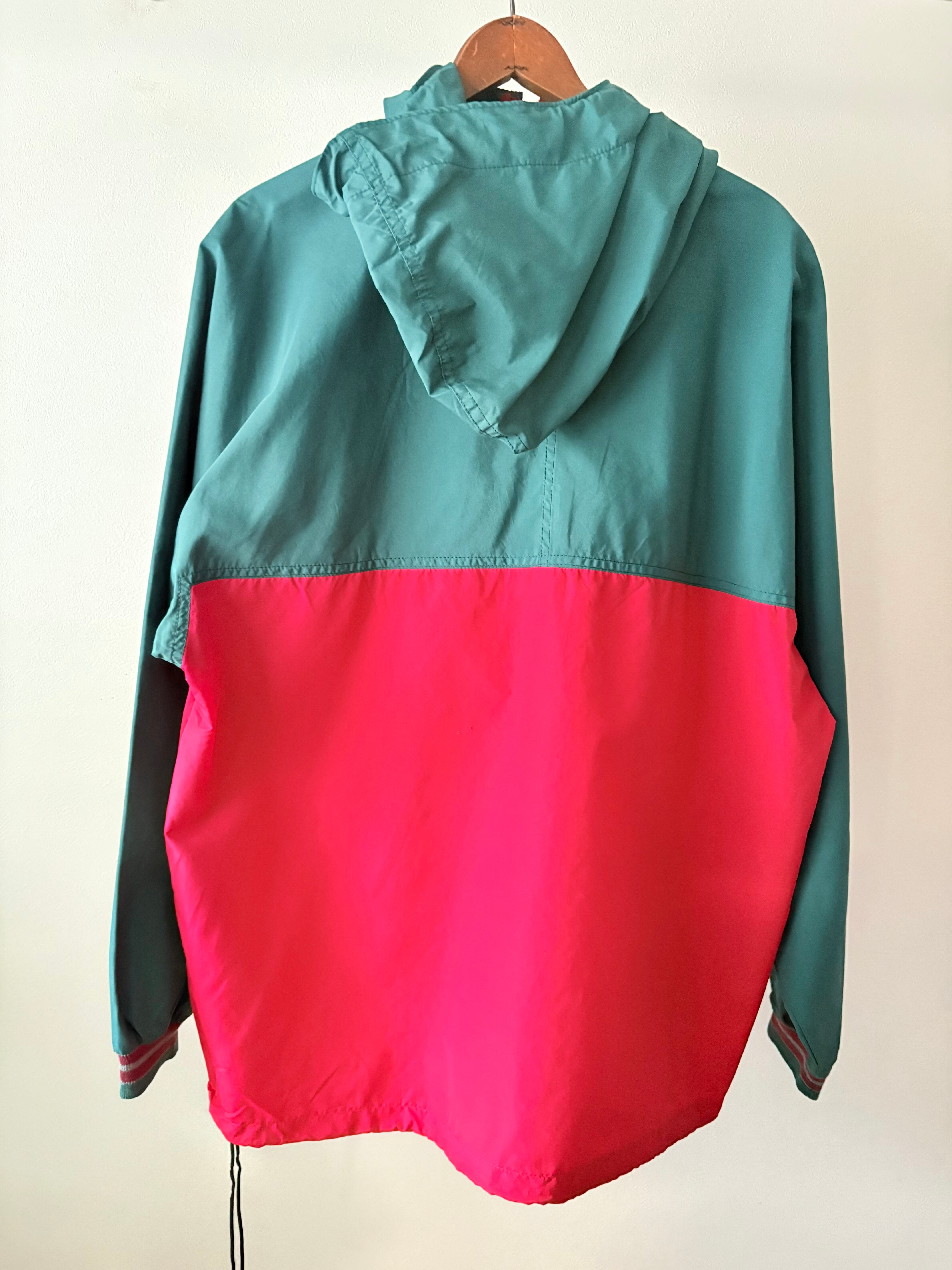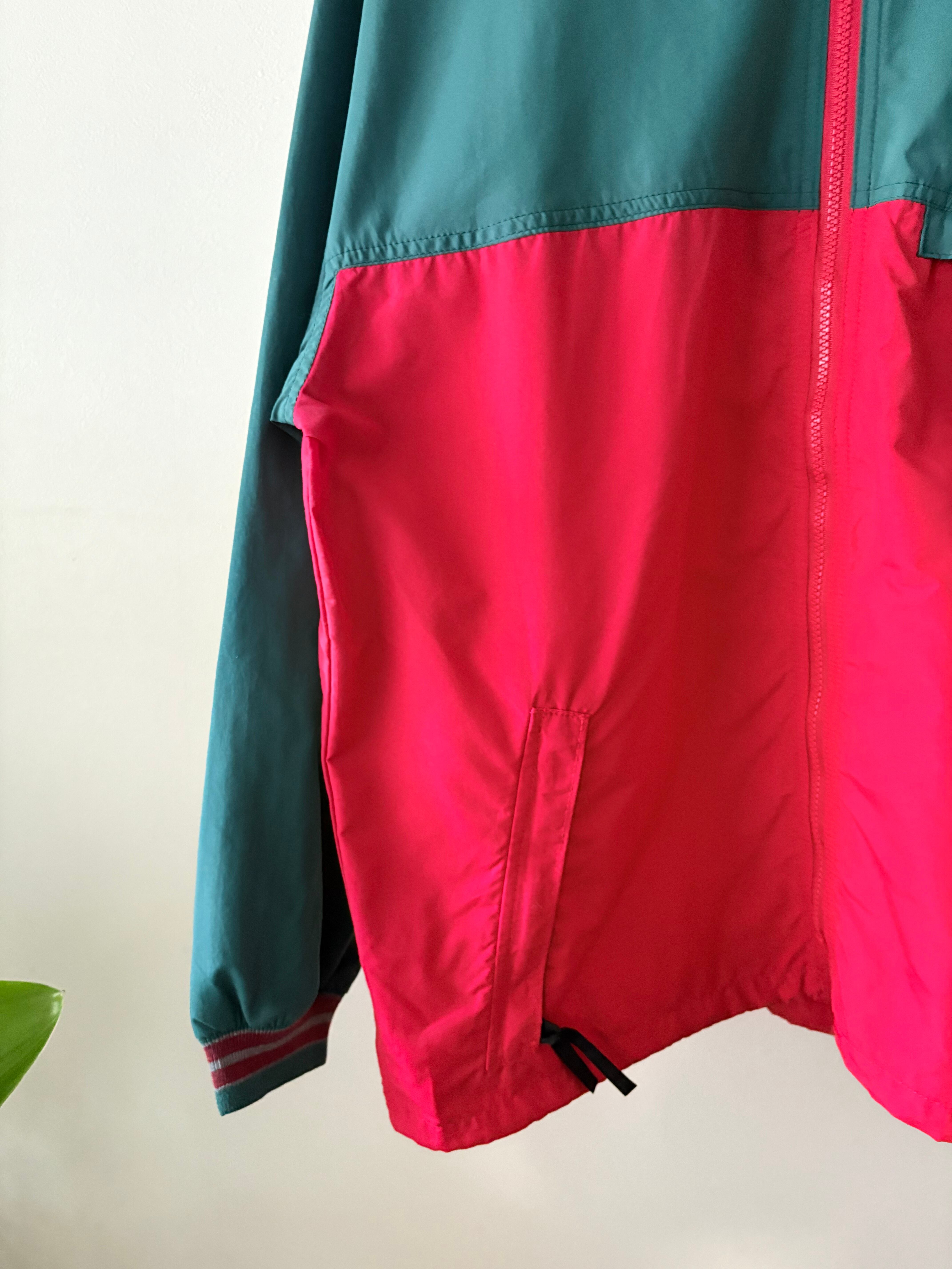 配色の良い薄手のナイロンパーカー。グリーン×レッドのカジュアルな組み合わせでデニムやワークパンツと相性良いかと思います。