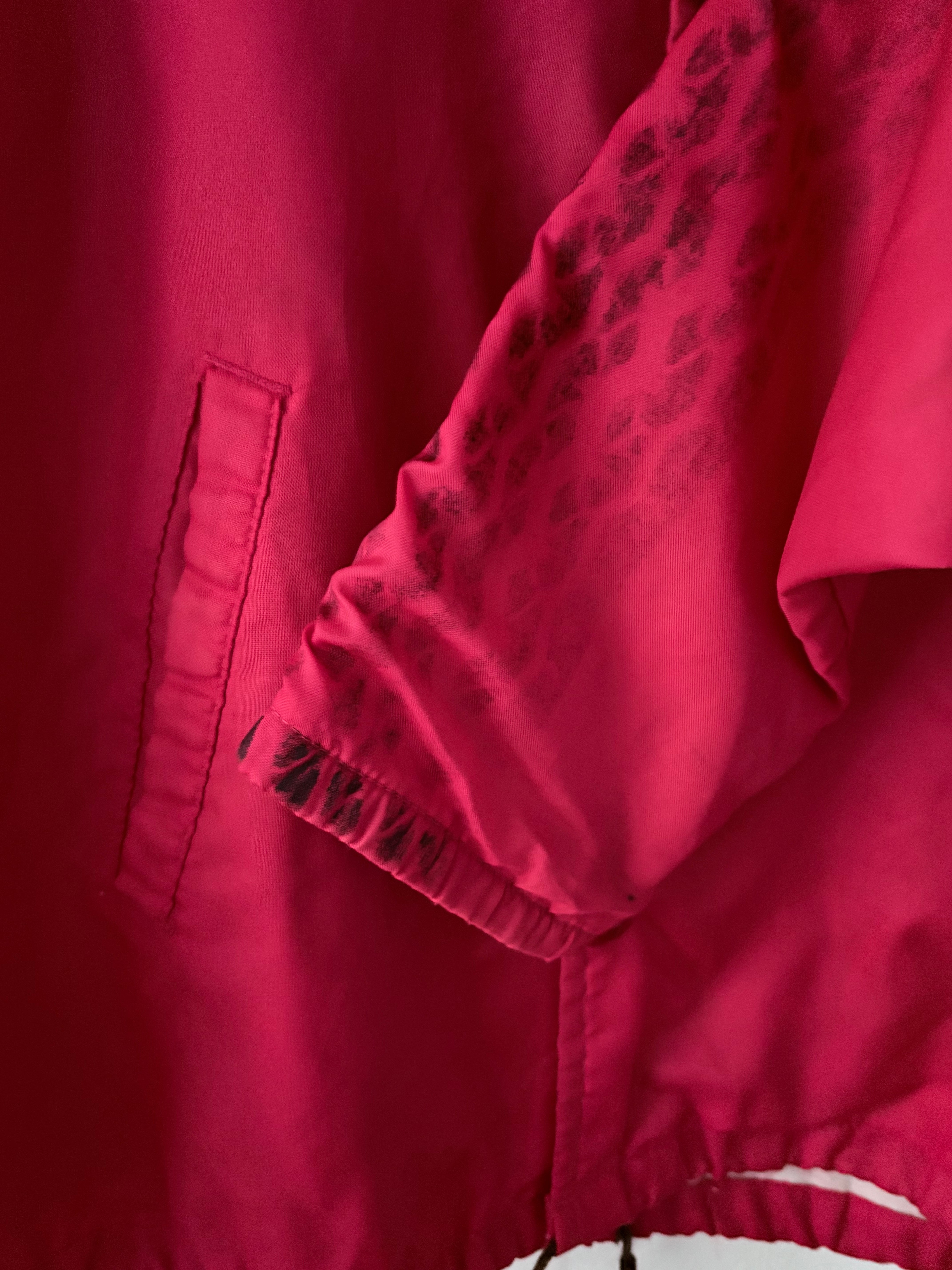 当時のタイヤ店で着られていたコーチジャケット。左袖に入ったタイヤ痕プリントがポイント。他のコーチジャケットと被らないデザインとなってます。裏地ありなので長い季節楽しめます。