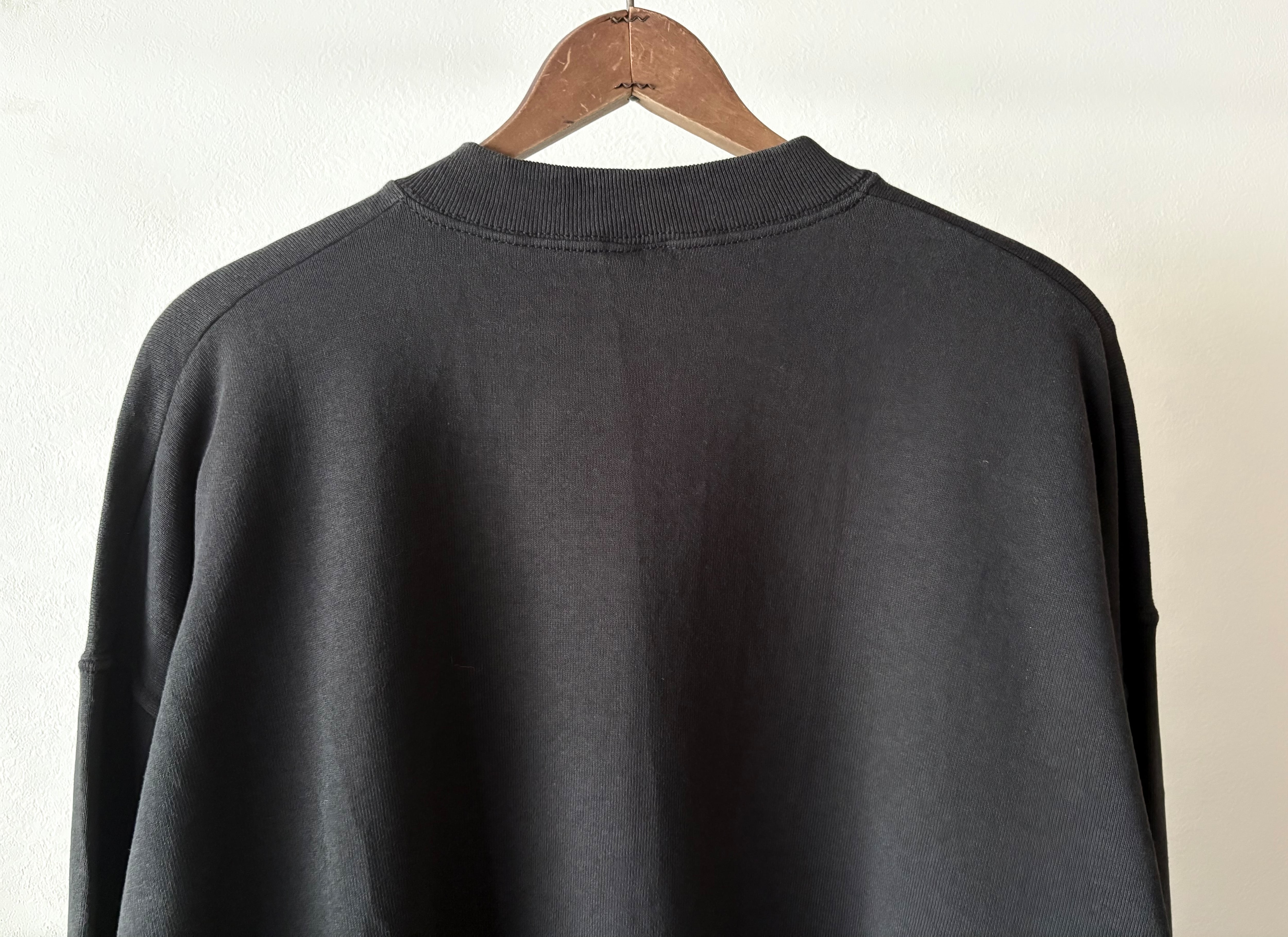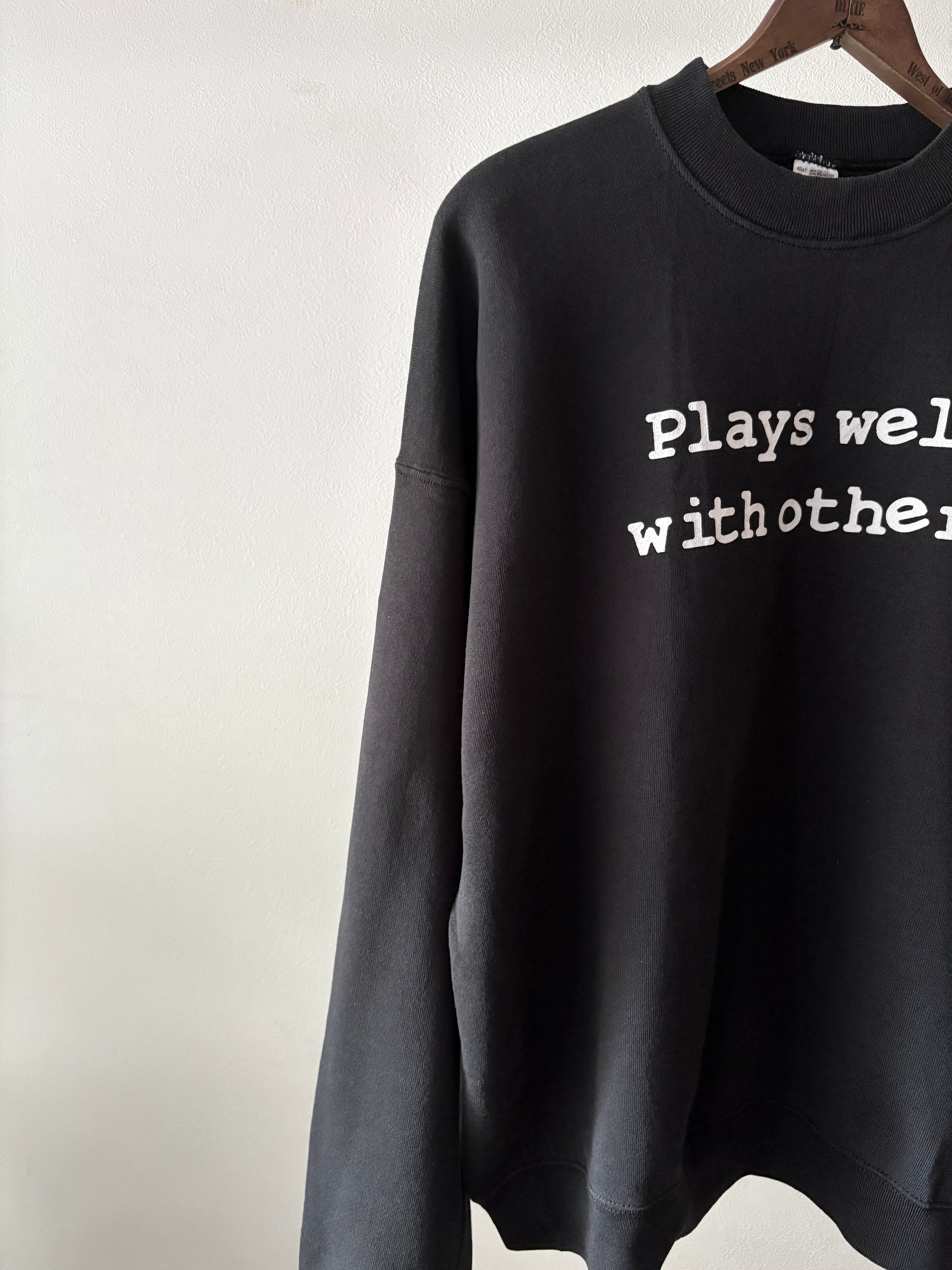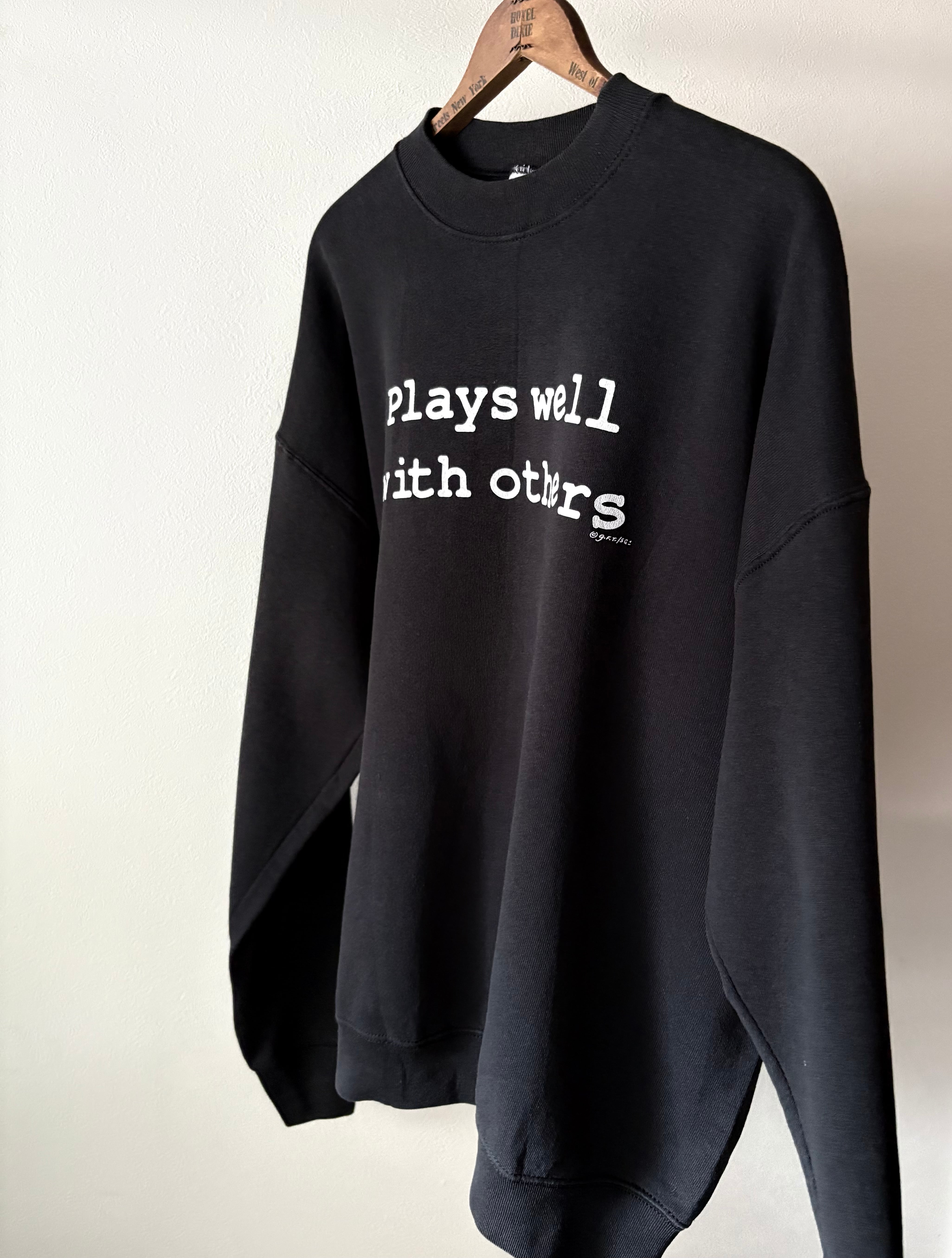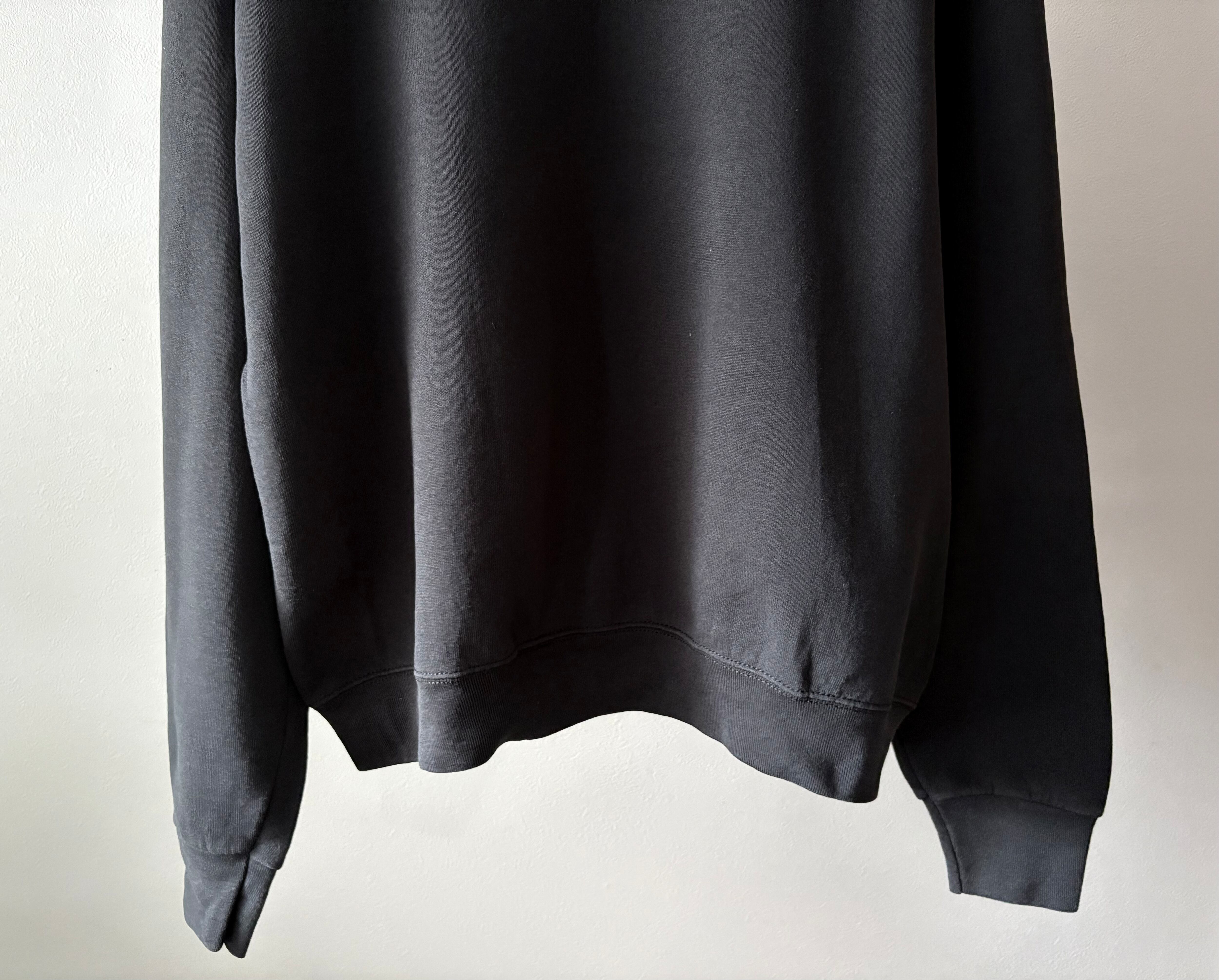 黒ベースに白のメッセージプリントというシンプルなスウェット。フルーツらしいワイドなシルエットで、ゆったり着ていただけます。プリントされている意味は"協調性がある"というニュアンスで使われる言葉です。