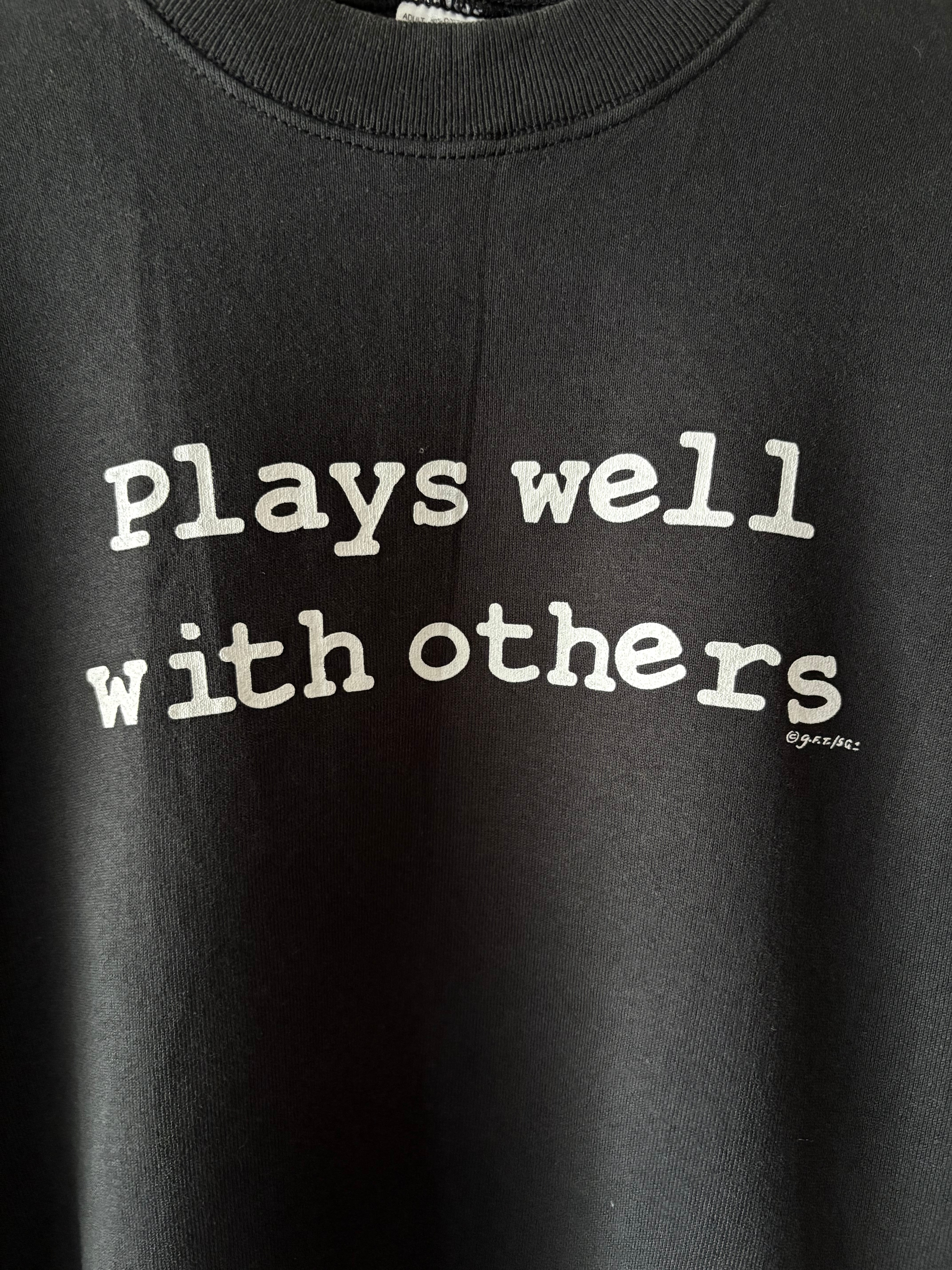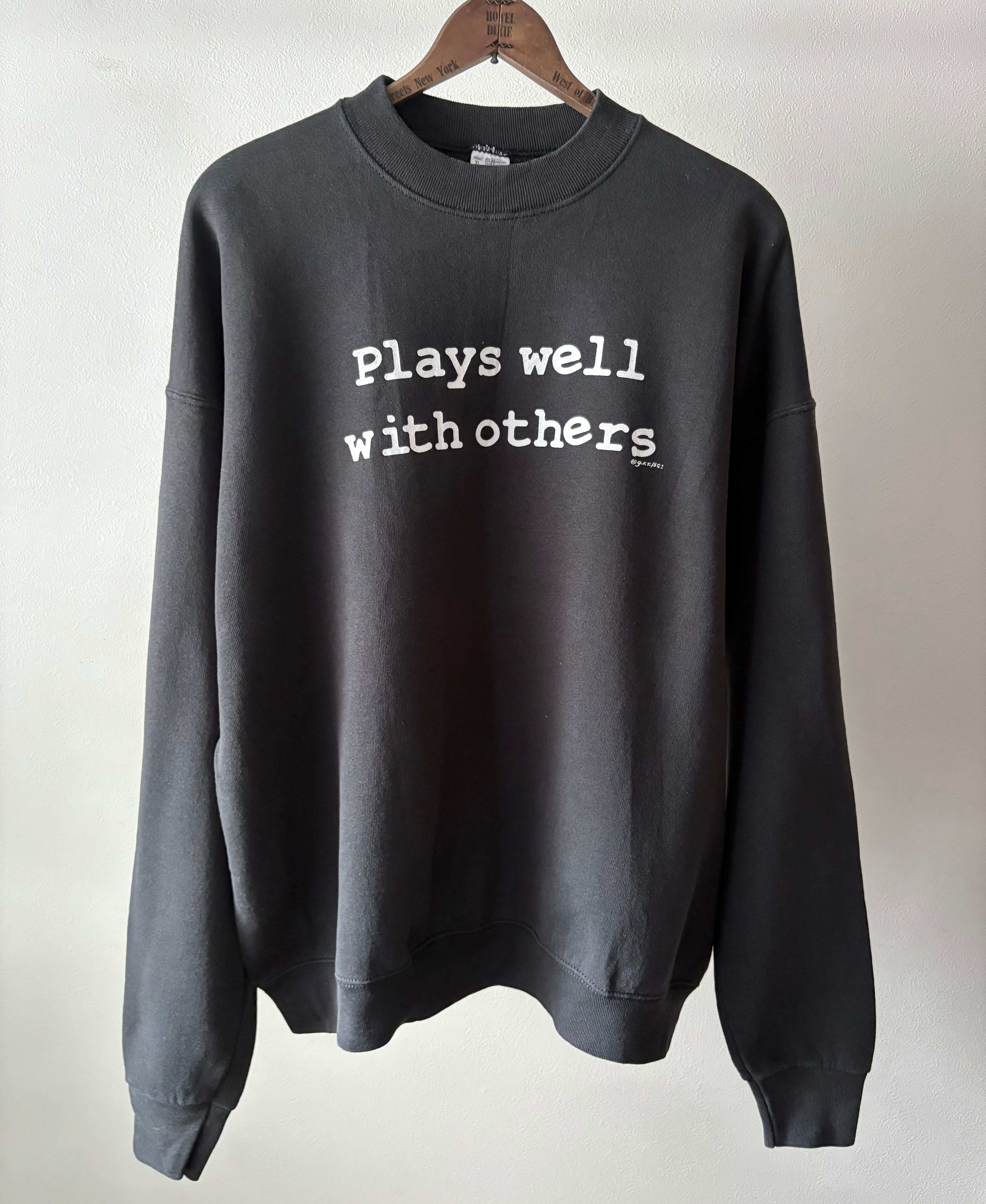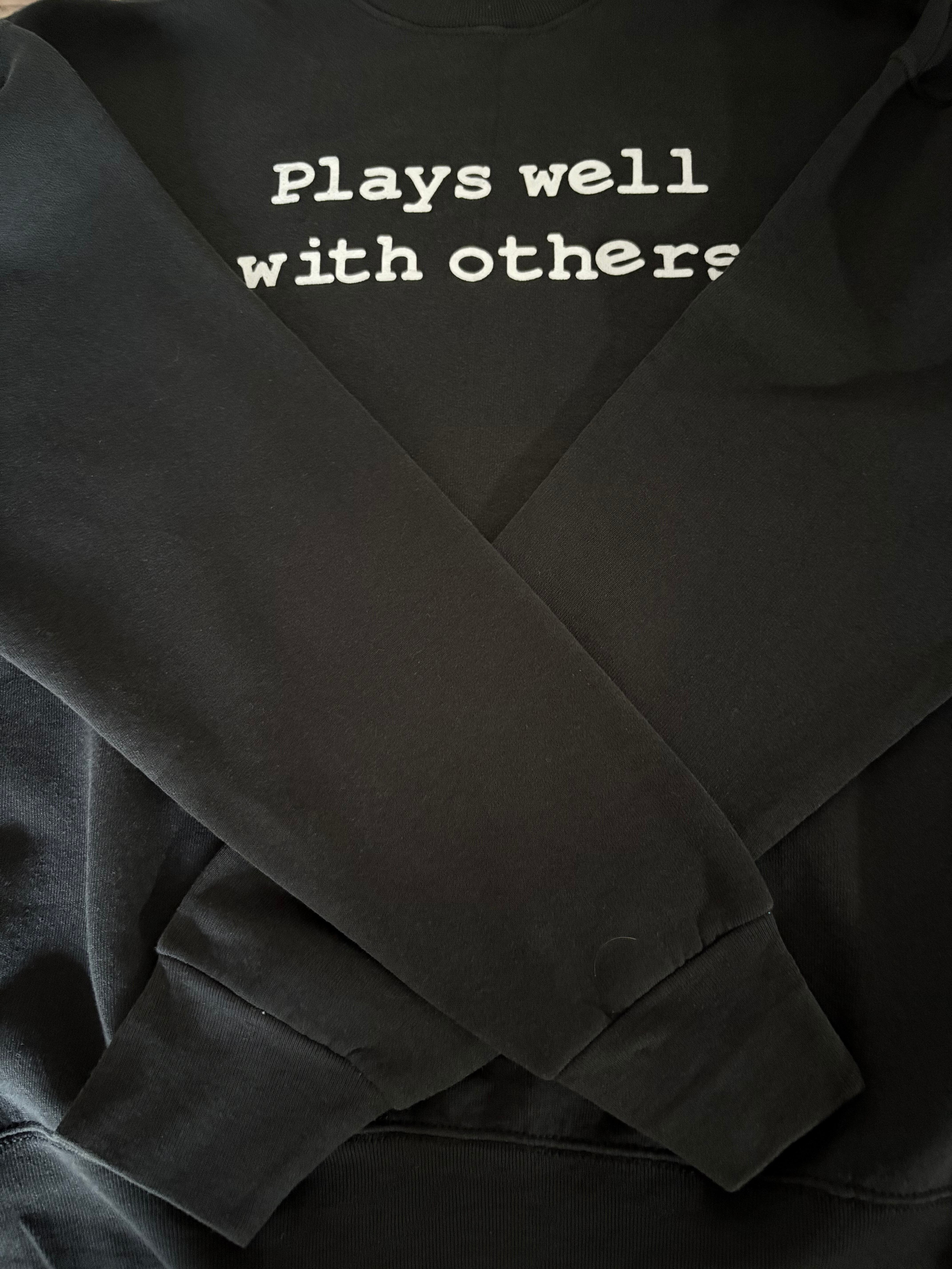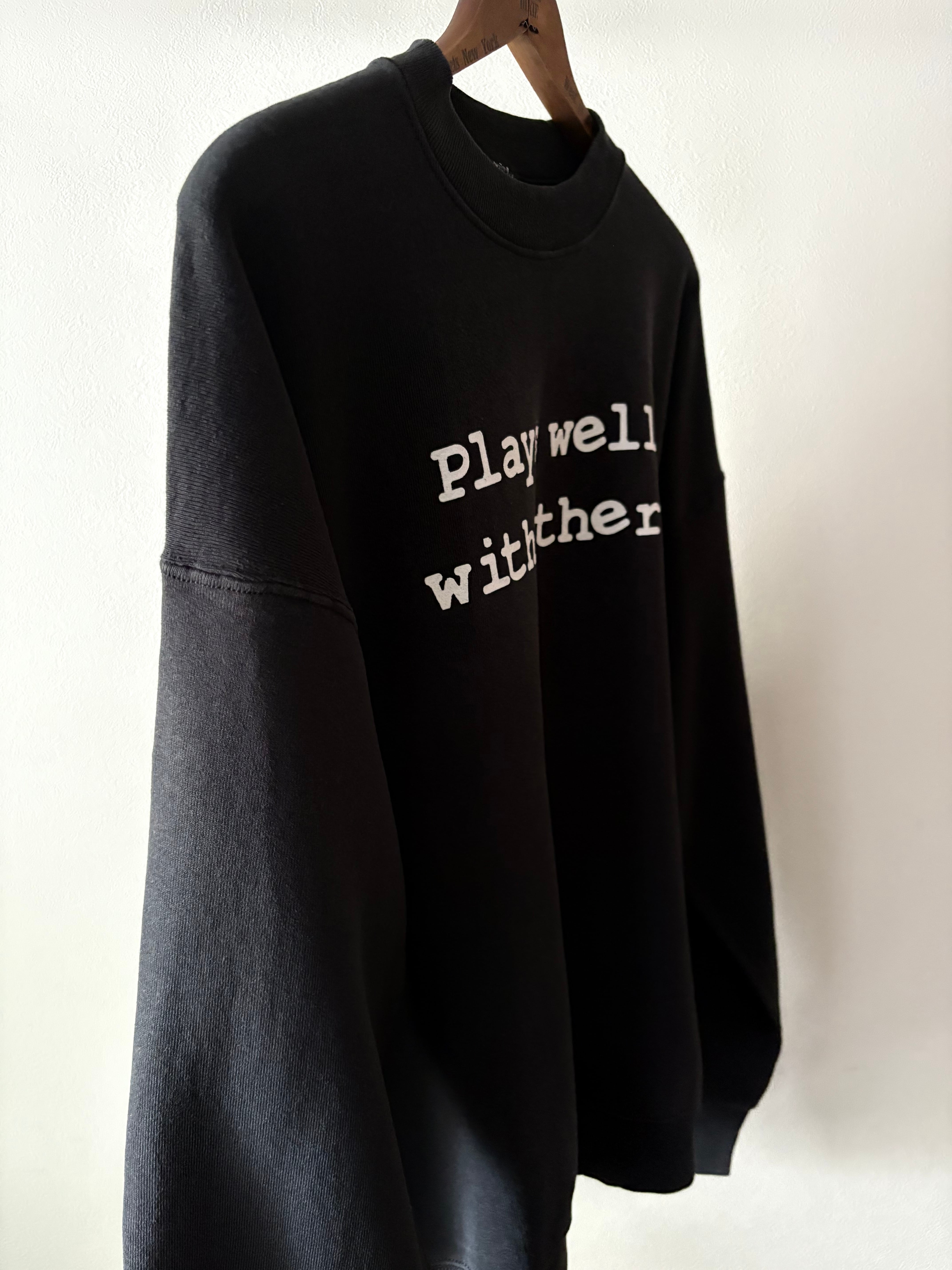 黒ベースに白のメッセージプリントというシンプルなスウェット。フルーツらしいワイドなシルエットで、ゆったり着ていただけます。プリントされている意味は"協調性がある"というニュアンスで使われる言葉です。