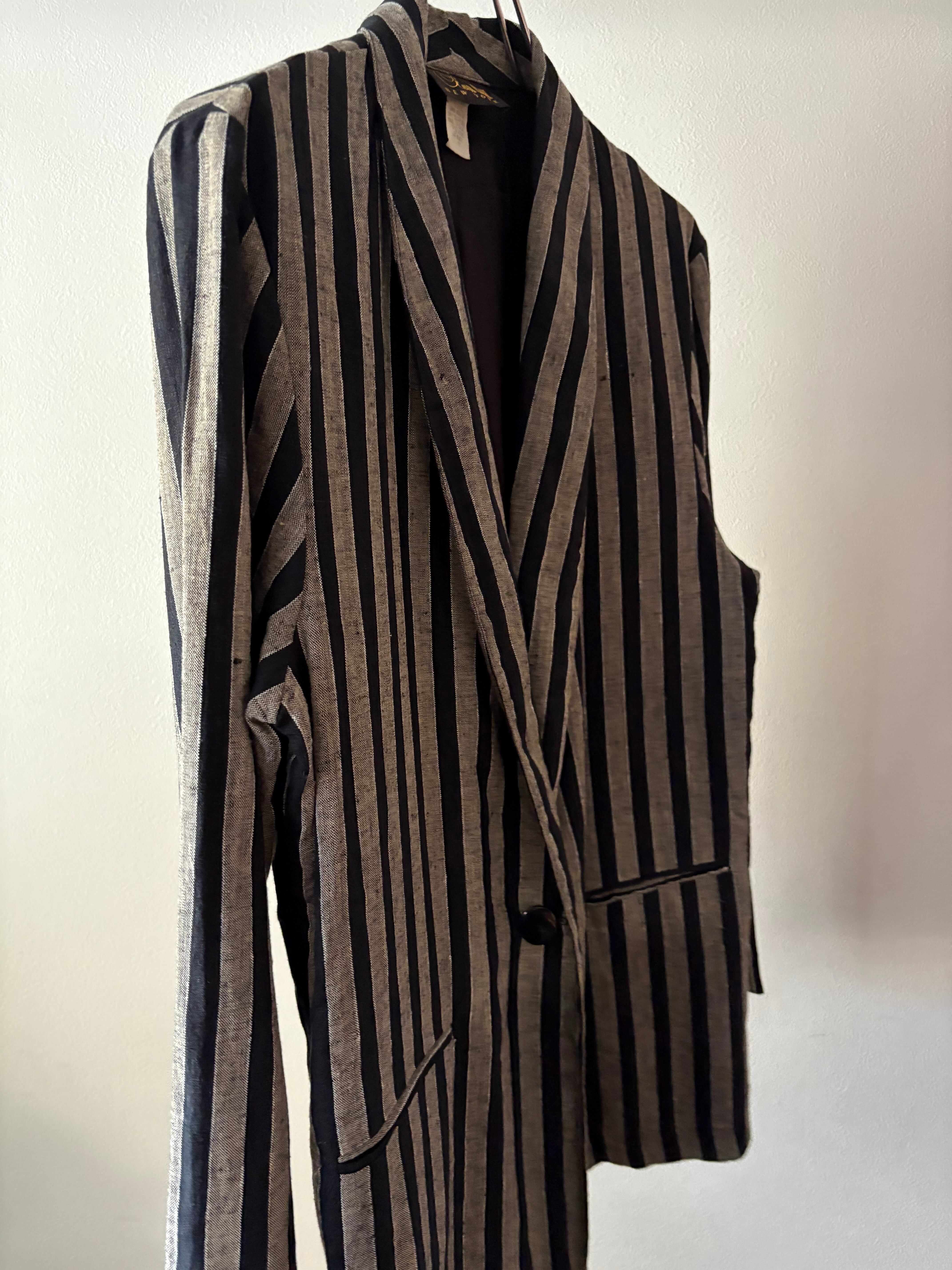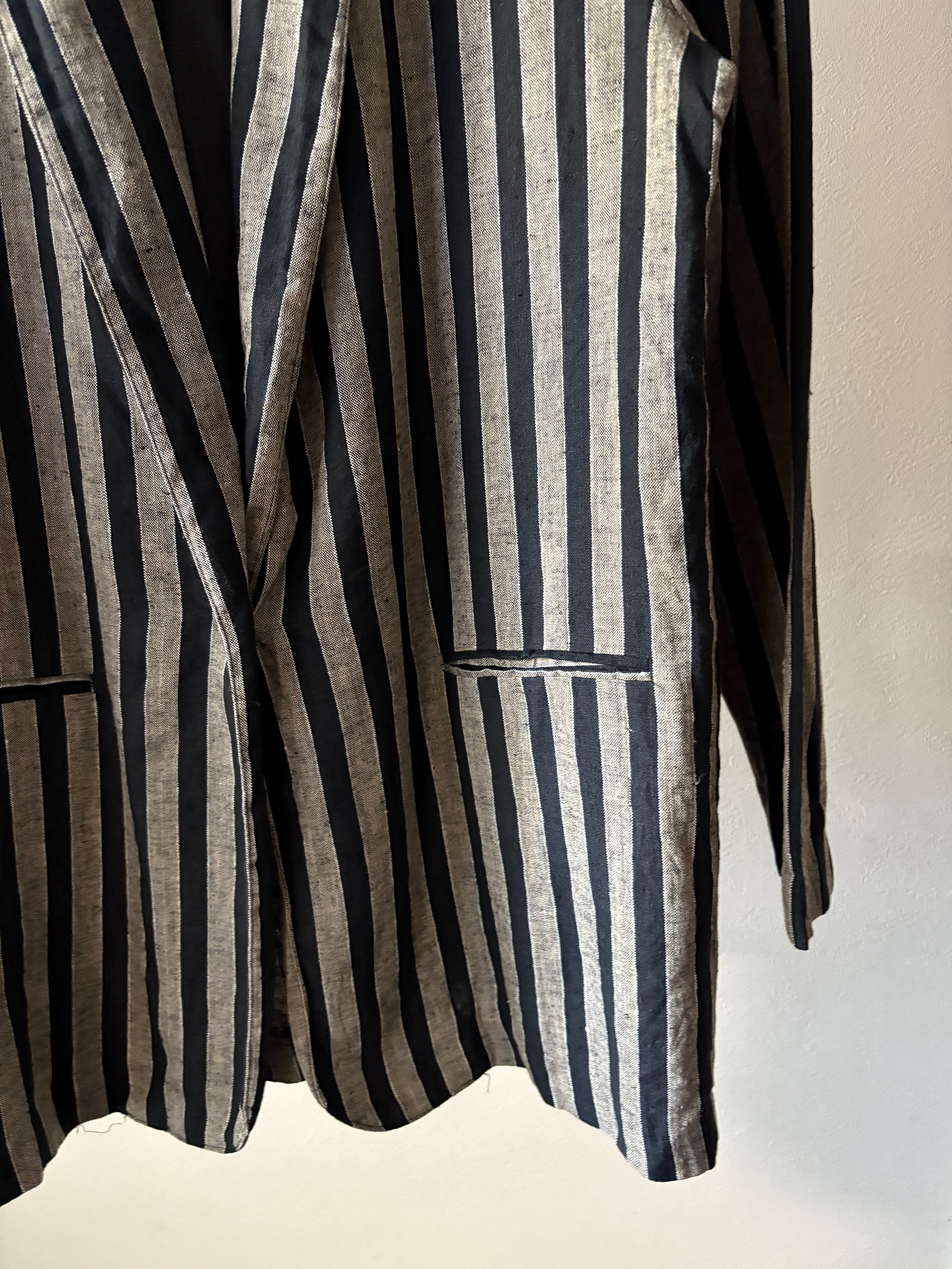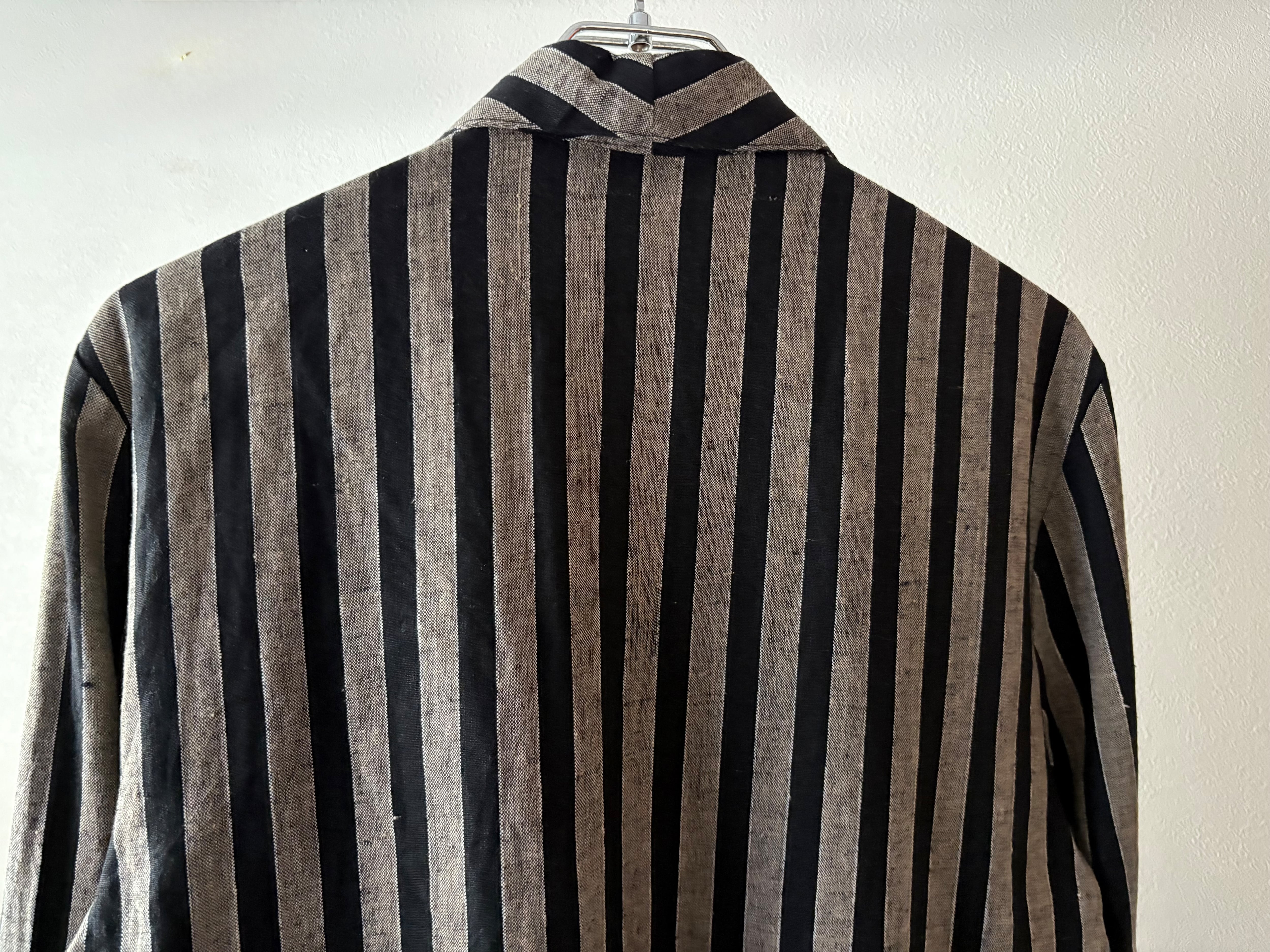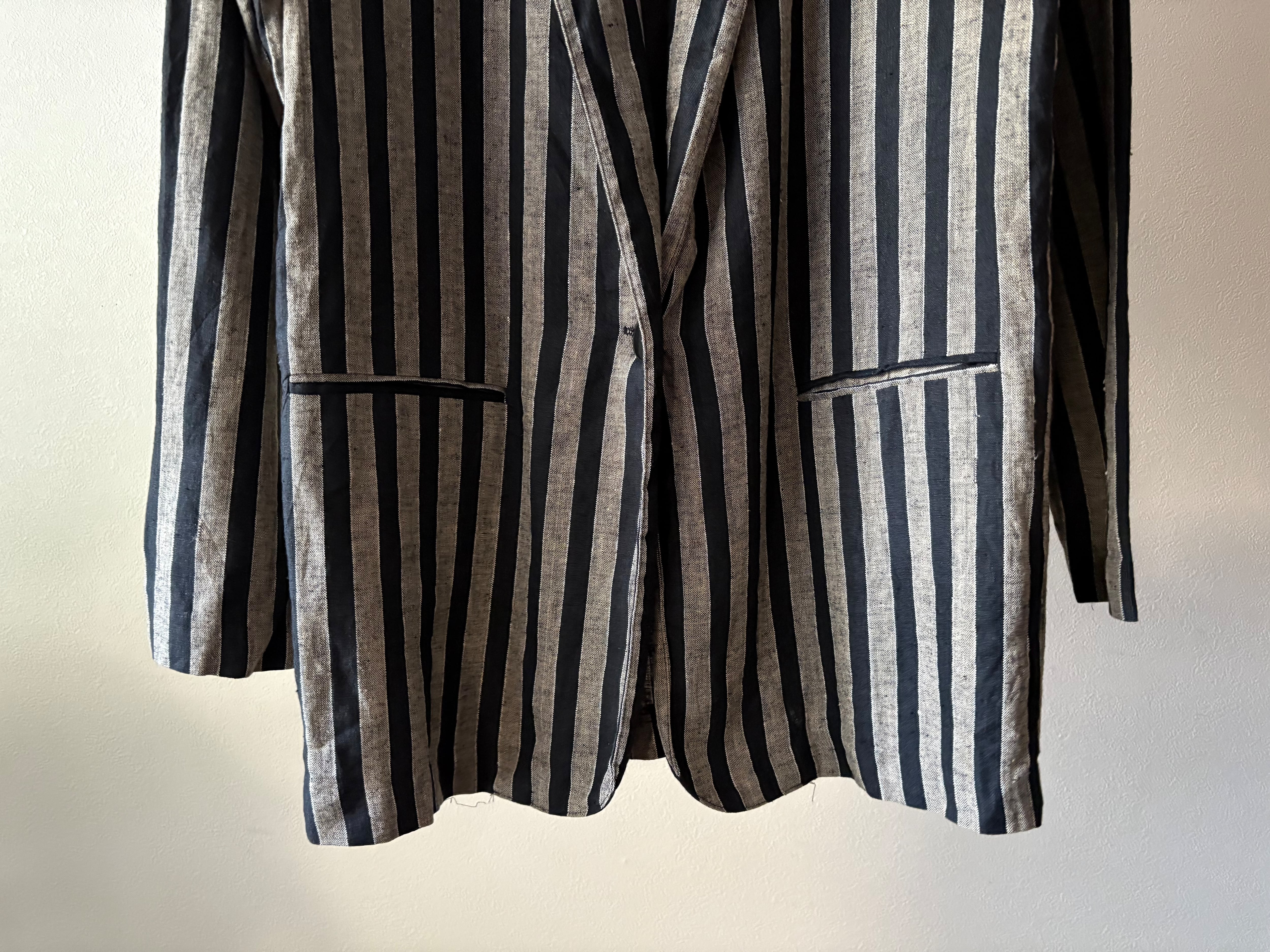 生地がレーヨンとリネンで作られた薄手のジャケット。カラーもグレーと黒に近いネイビーのストライプ。スタイリングの幅が広がりそうなアイテムです。レディース合わせですが、サイズが大きめなので、男性でも着ていただけます。