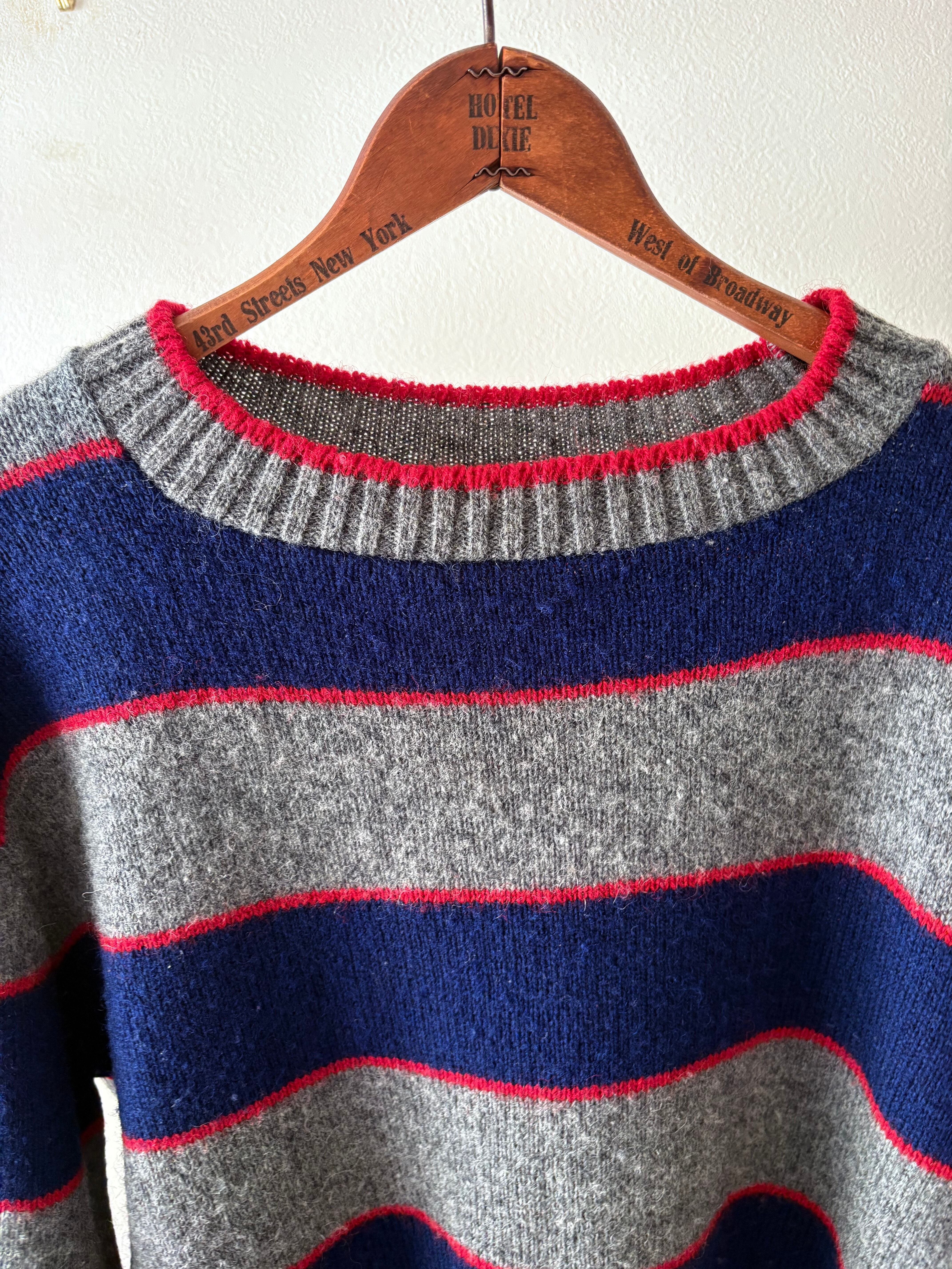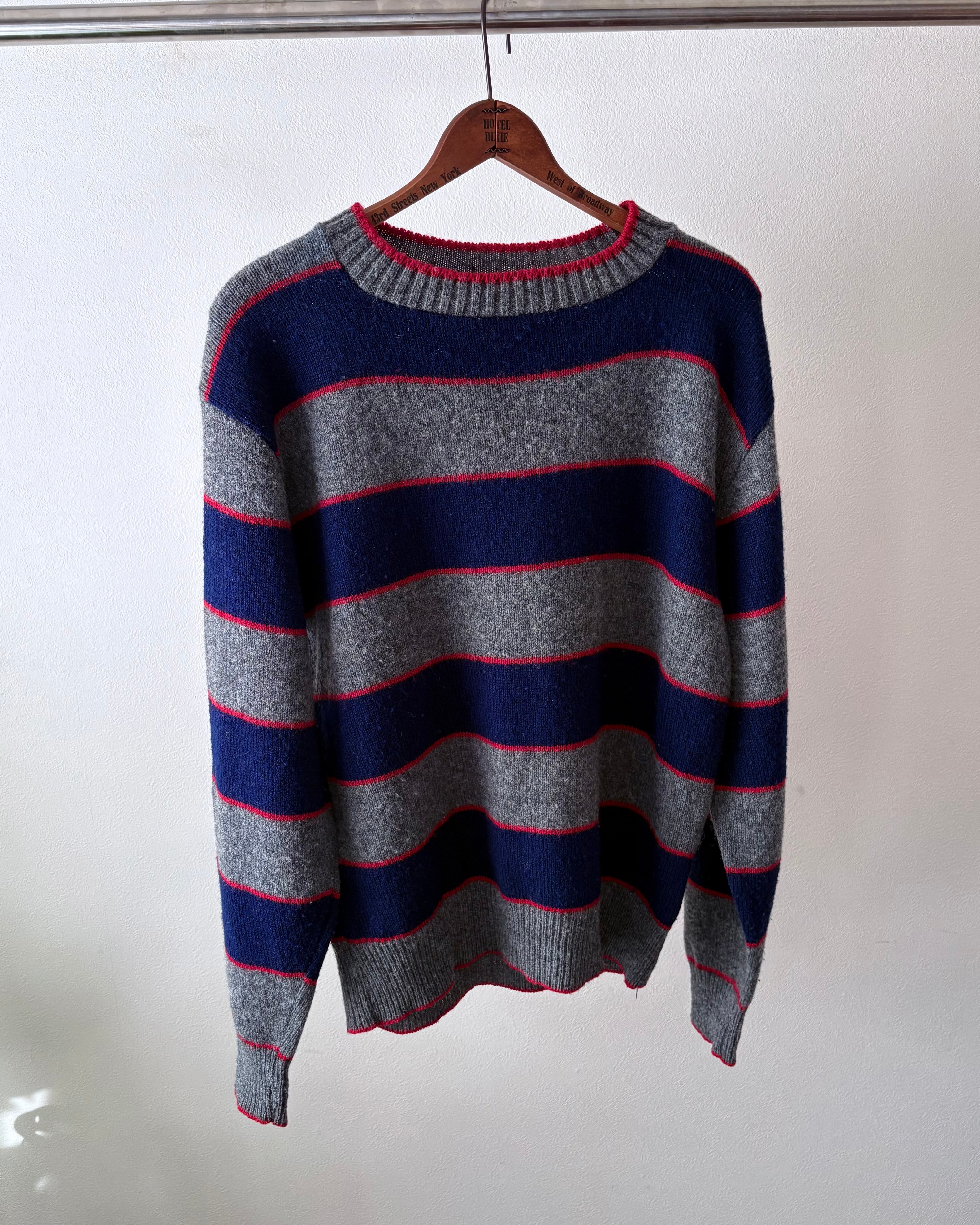 配色が良い太ボーダーニット。ネイビーを挟む赤のラインが全体な雰囲気を締めているため、太いボーダーの割にカジュアルに寄りすぎず、大人っぽいデザインとなっております。