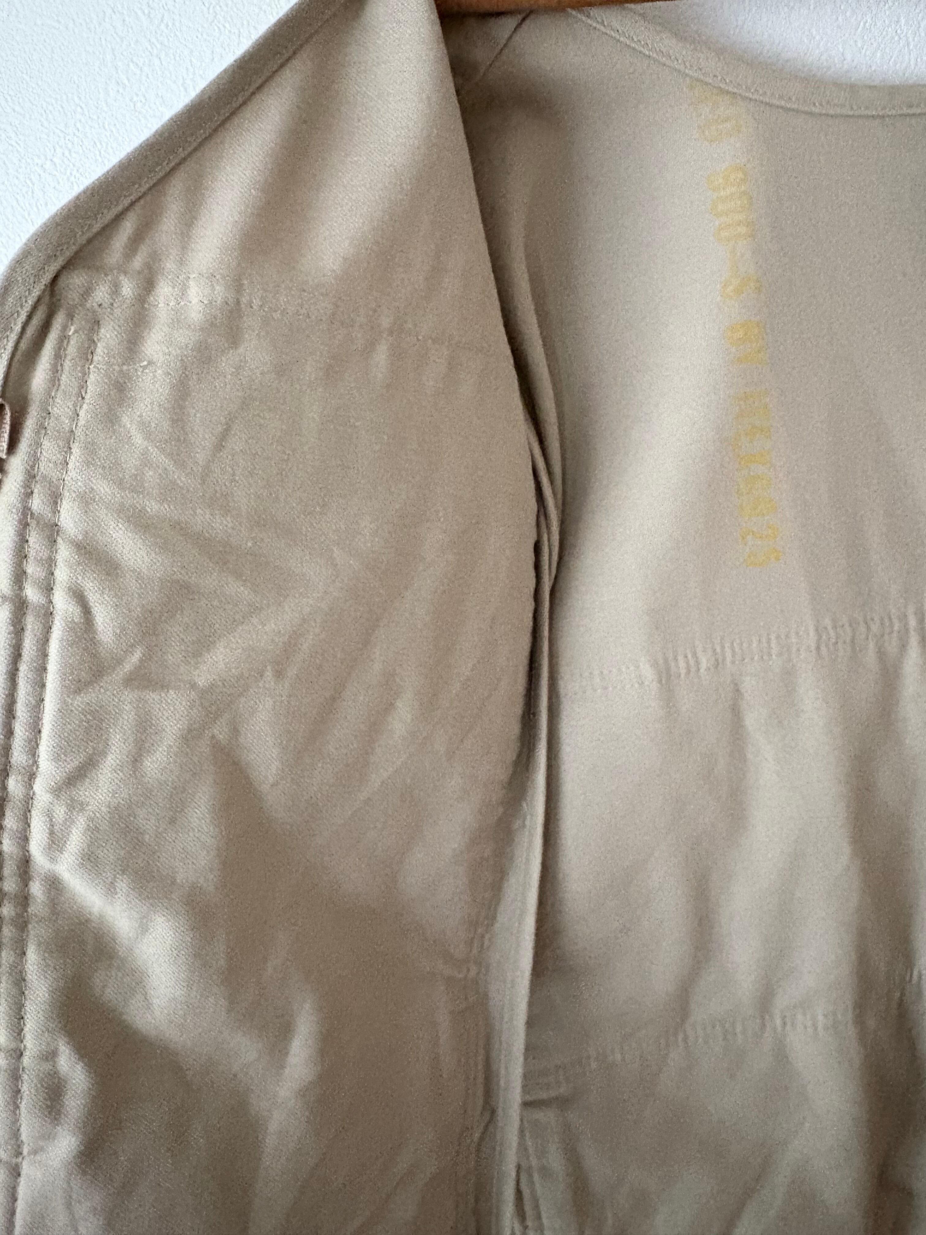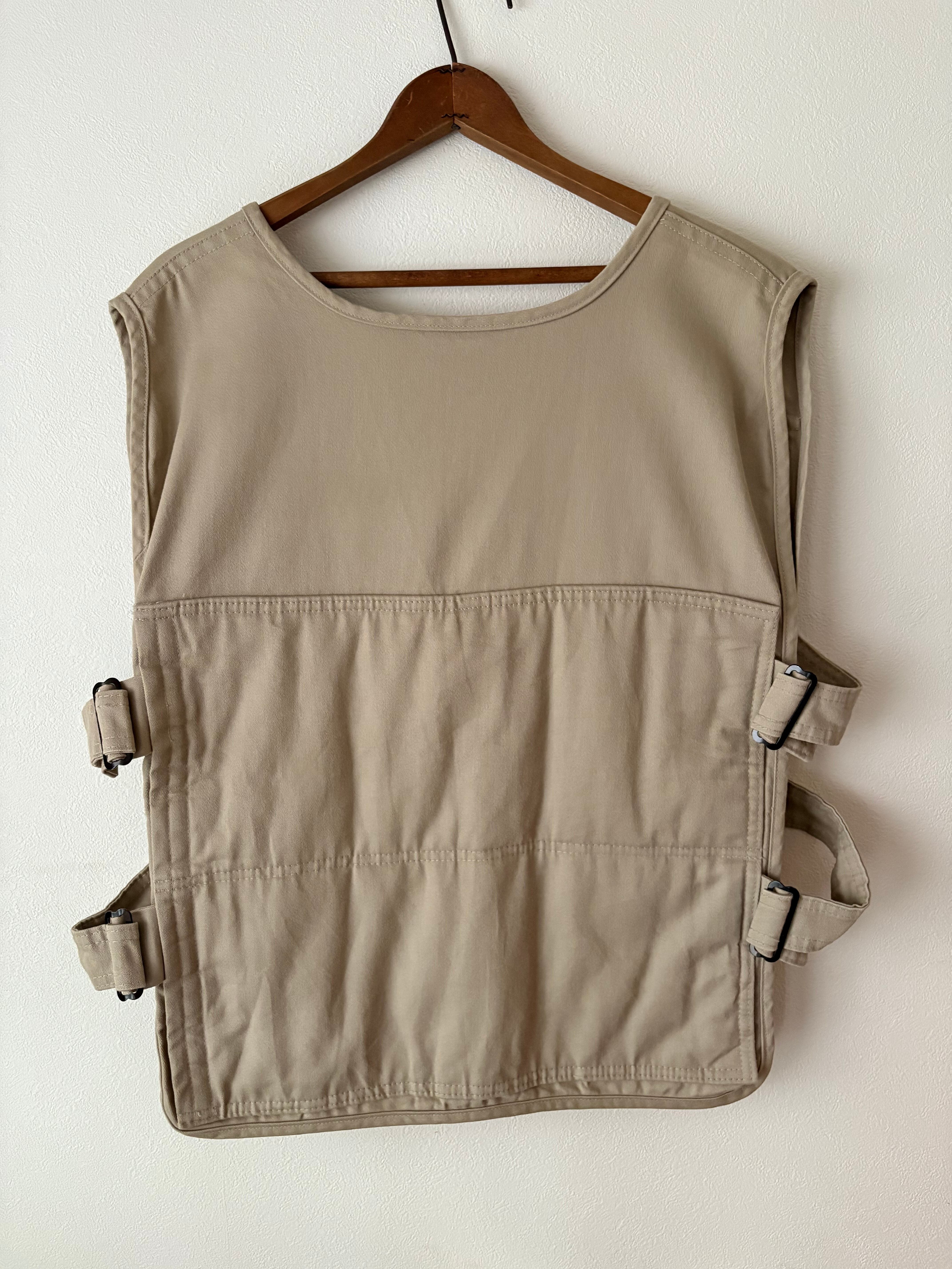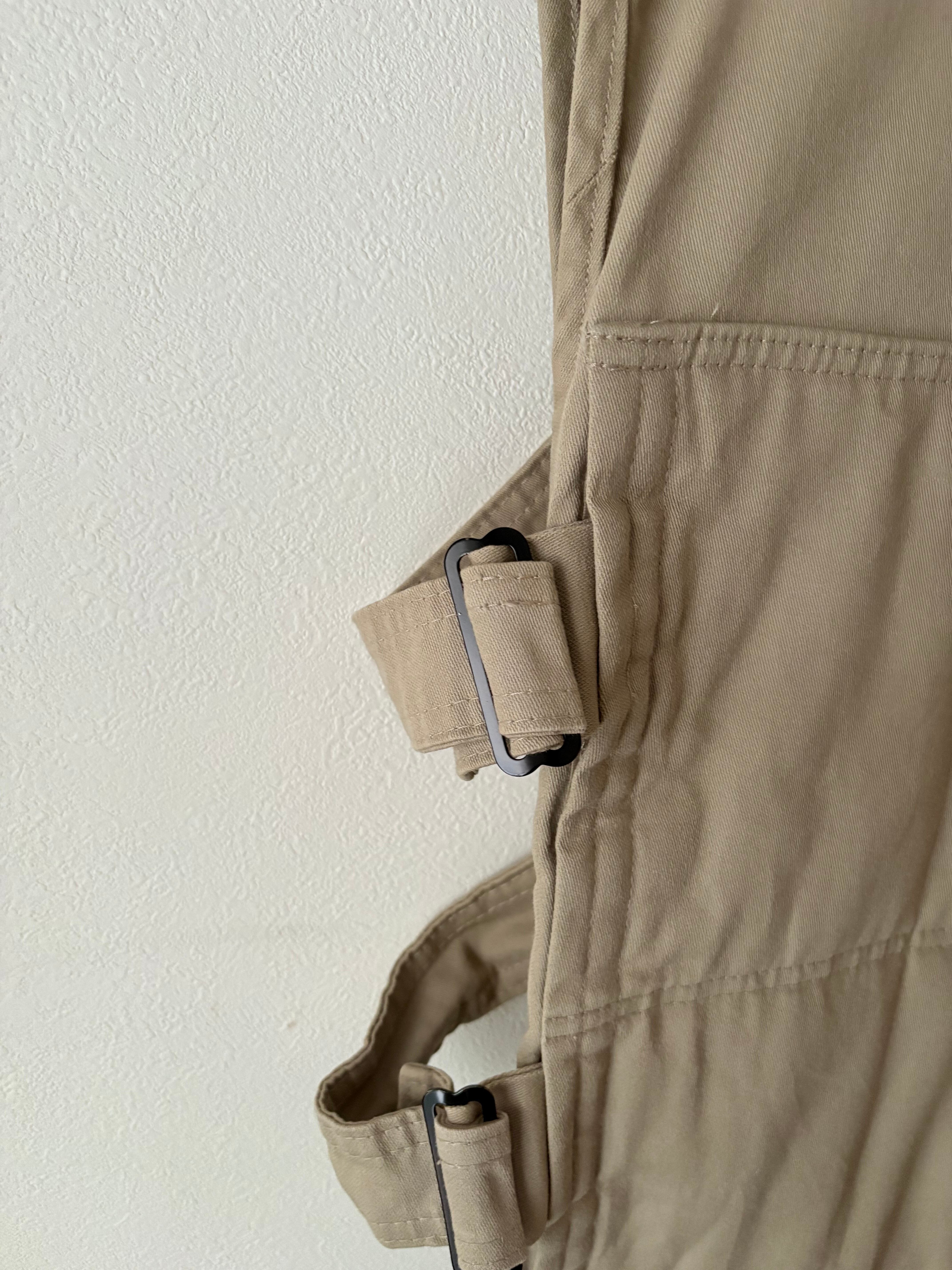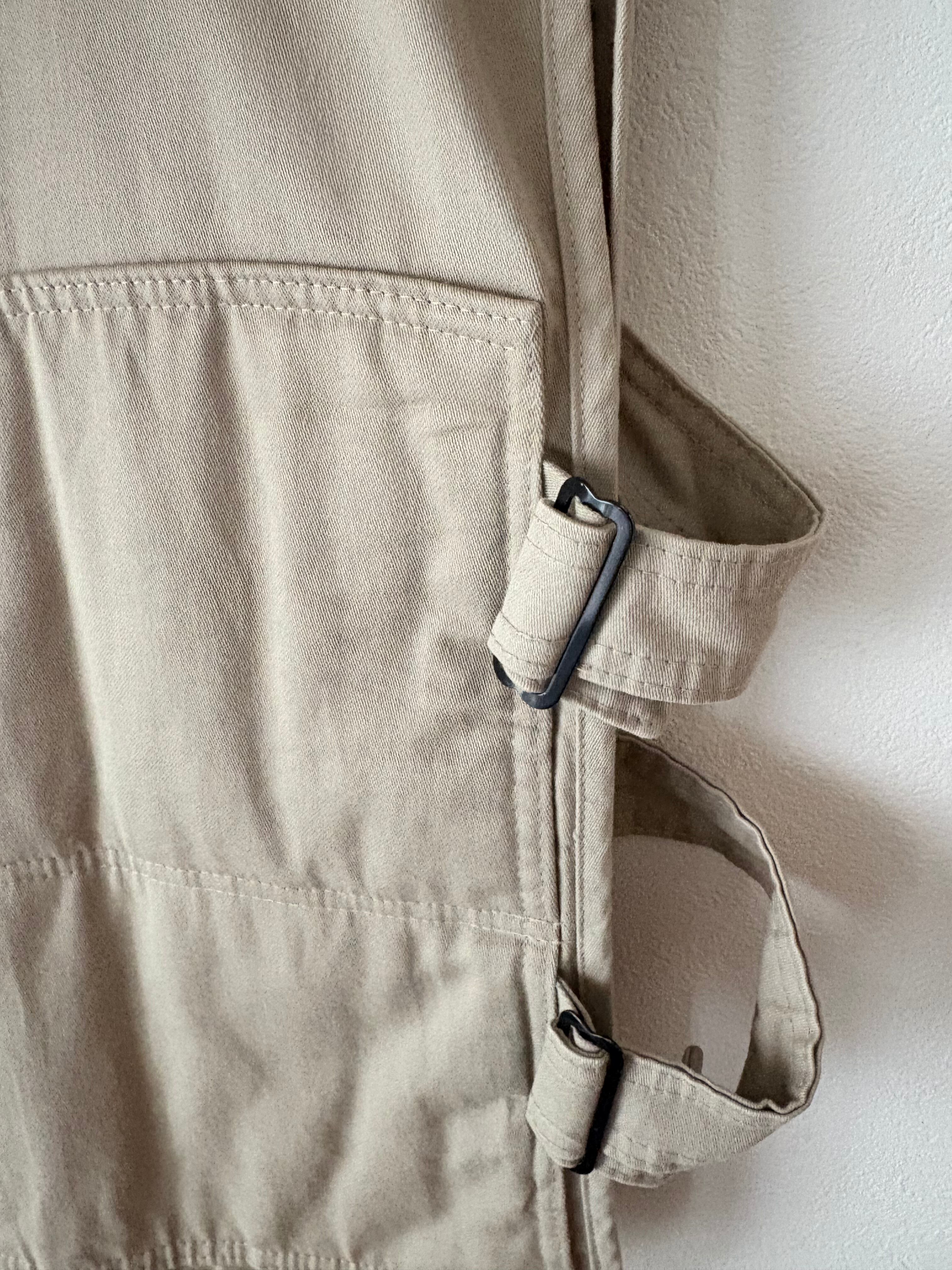 無骨なベージュボディに、多数配置されたフラップポケットと独特なストラップディテールが存在感抜群。ギア感のあるルックスは、今のテック・ミリタリースタイルにもハマる一着です。