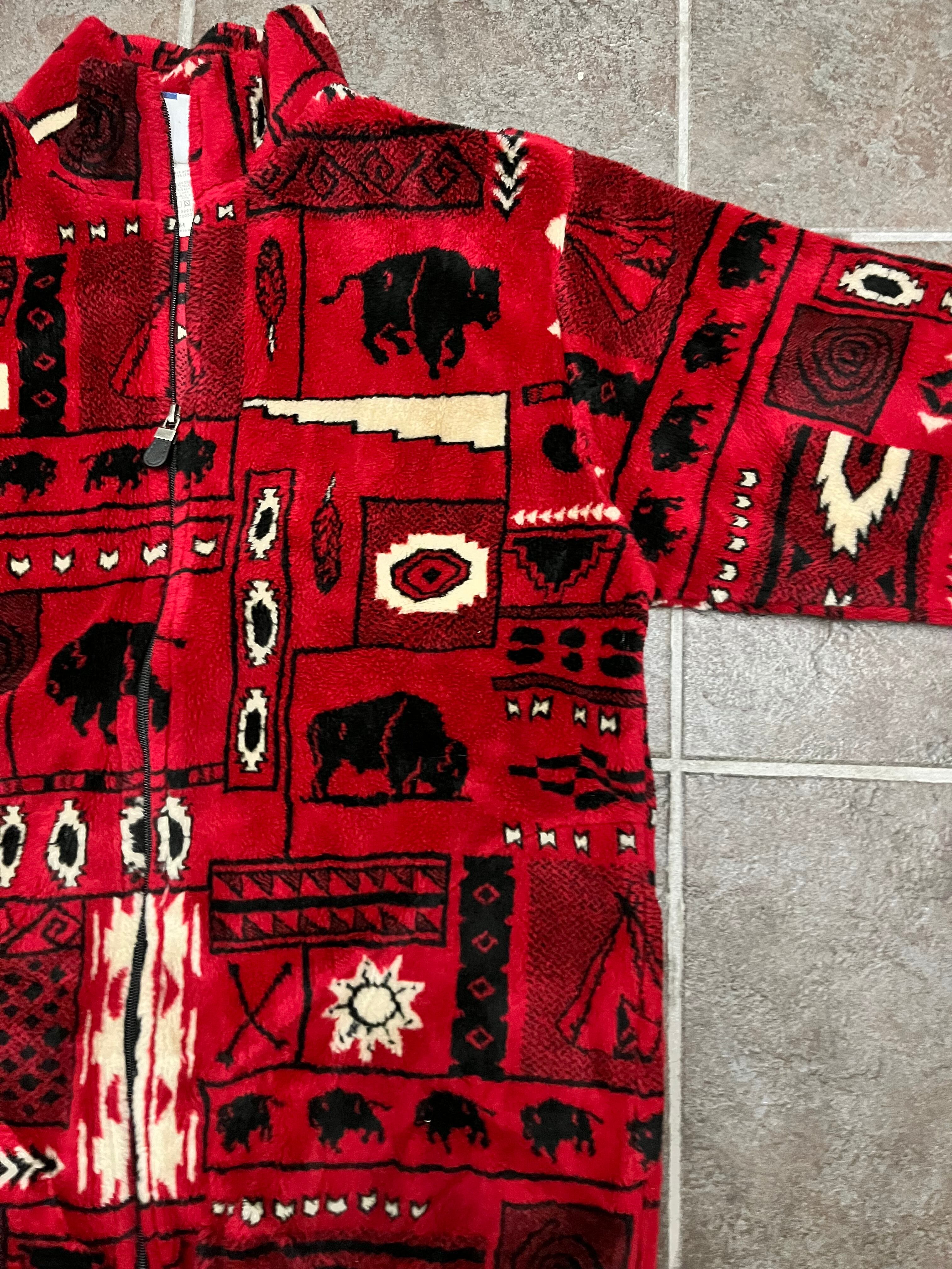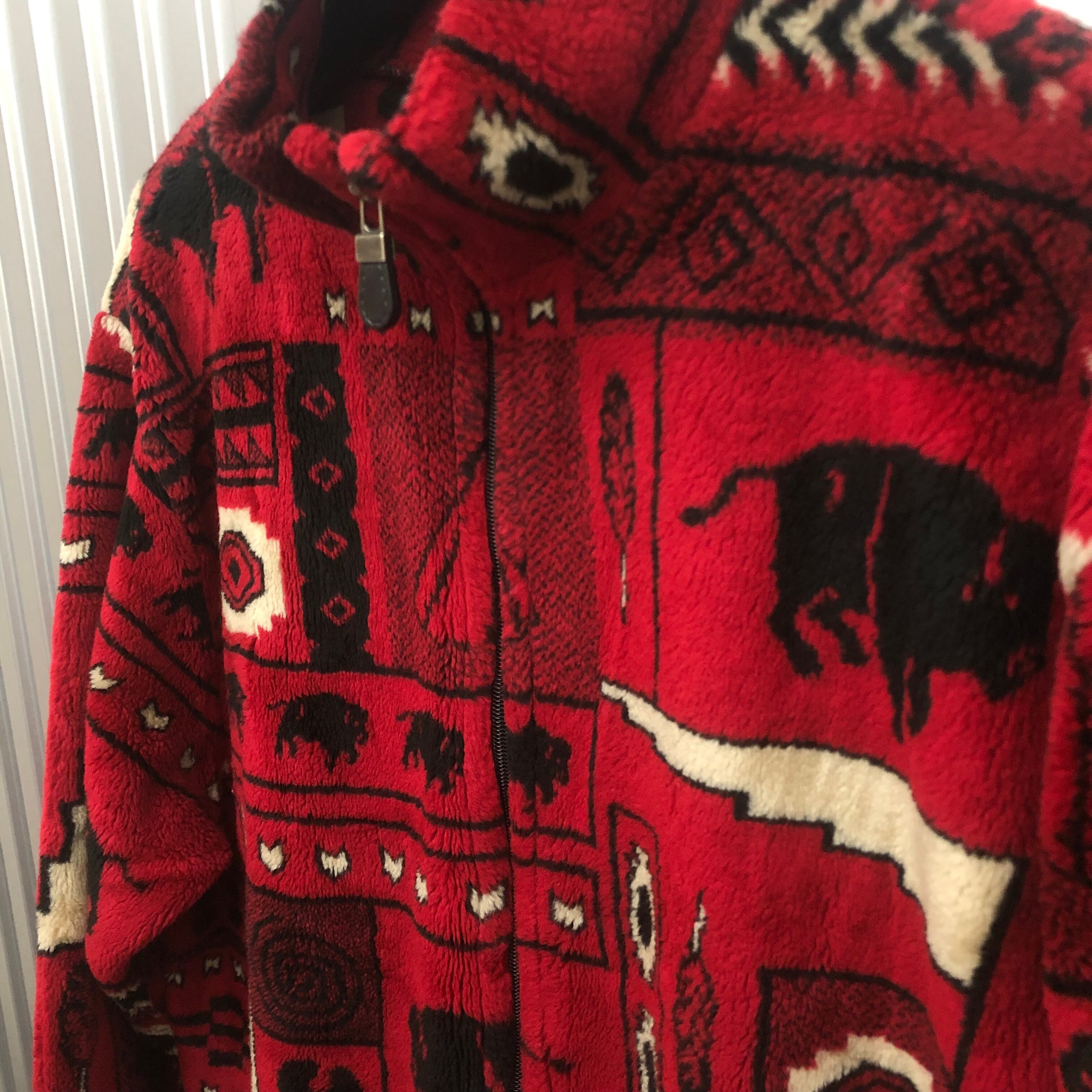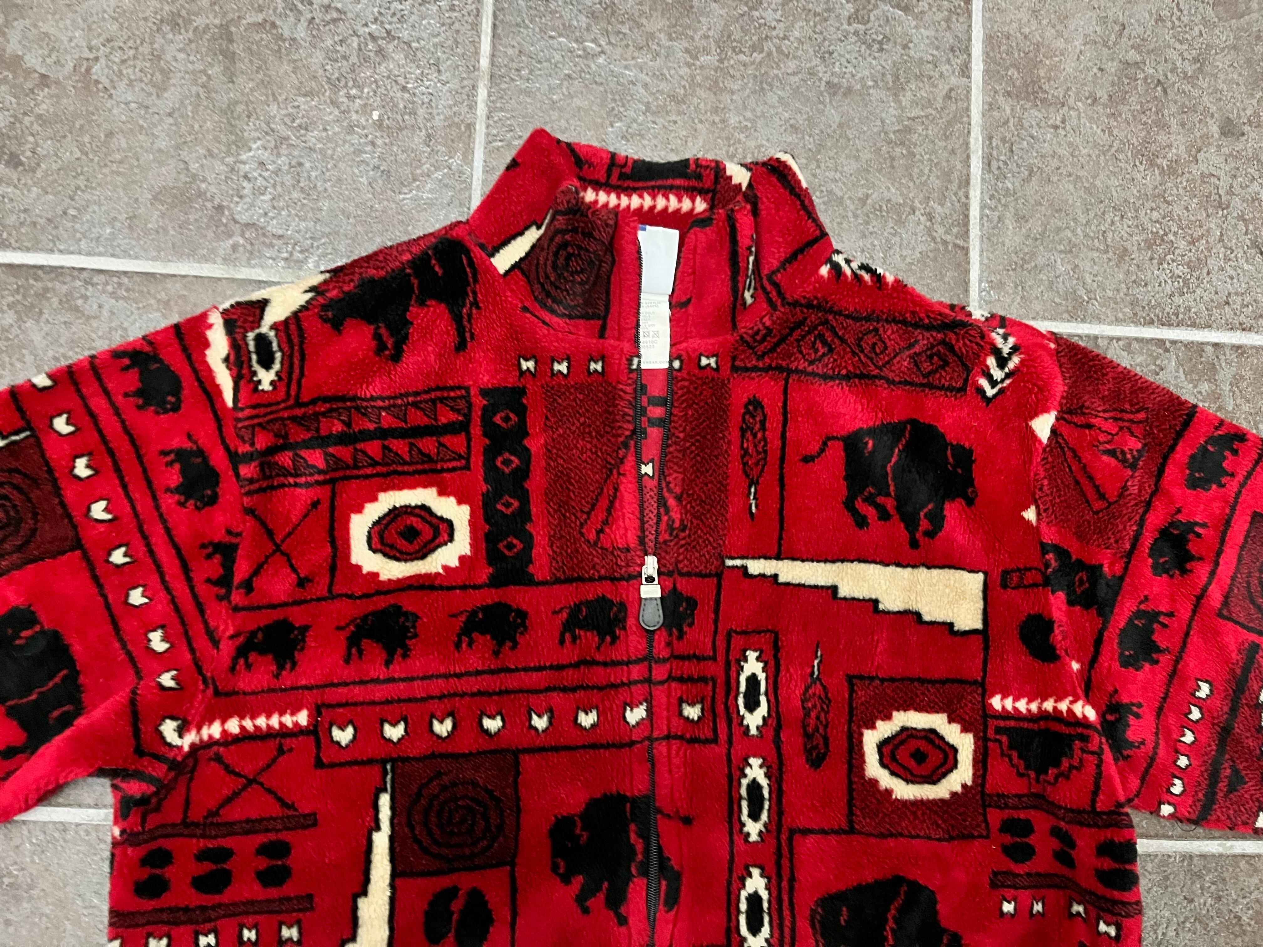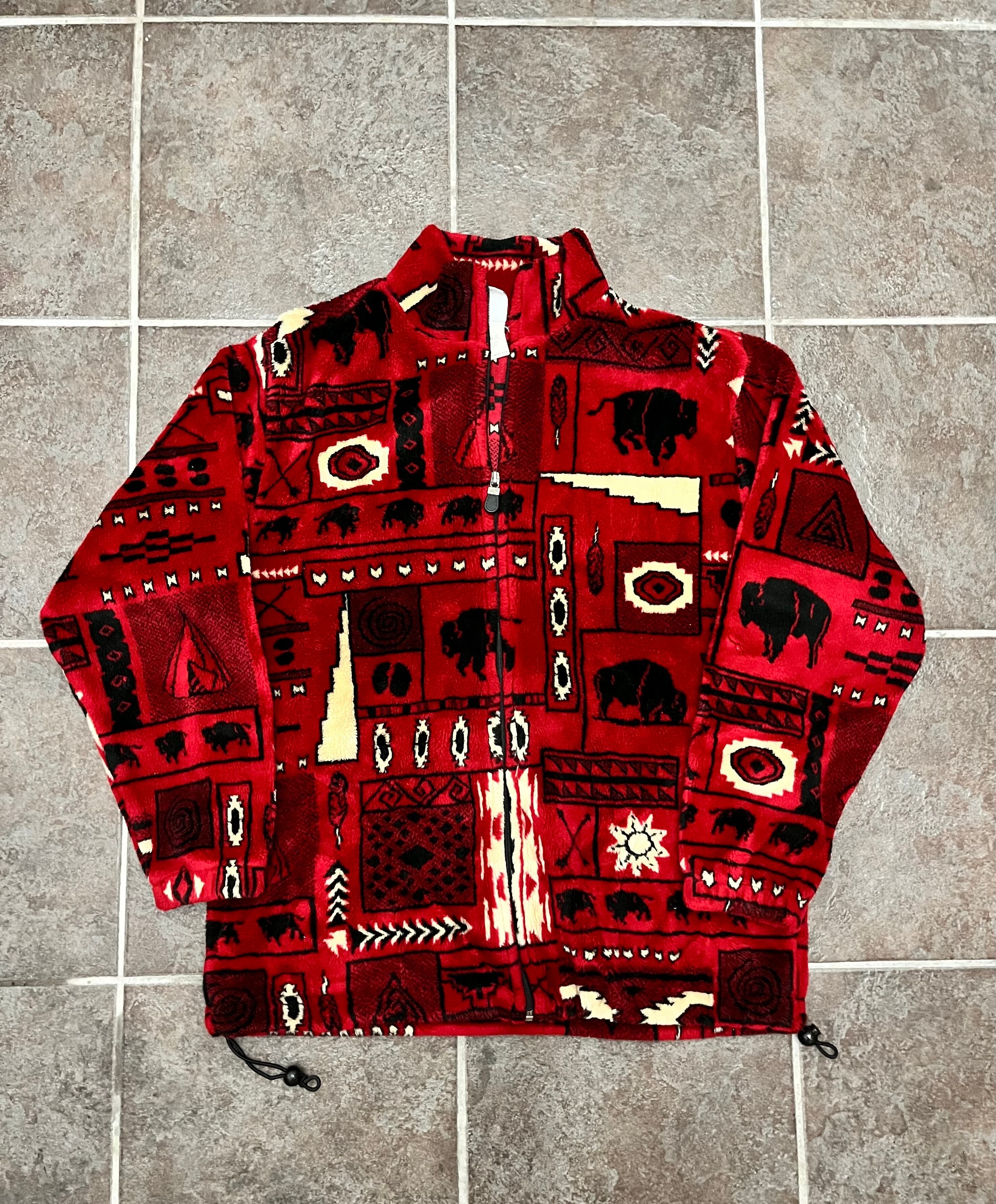Art Unlimitedのフルジップアップジャケットです。フリースなので軽く、オシャレで個性的な柄のため、重ね着をしてもポイントになる一品です。珍しく赤の色味の商品です。