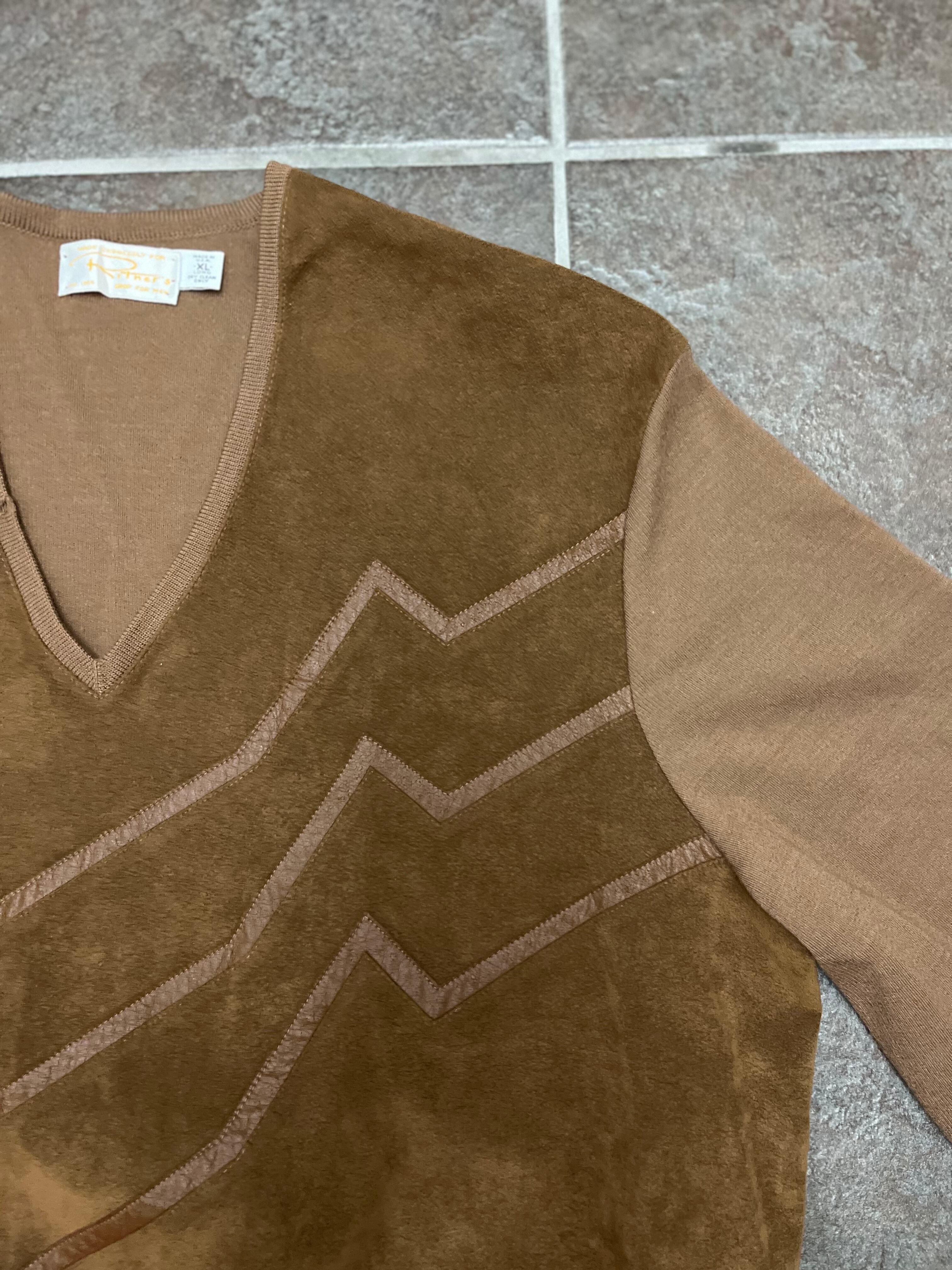 70s,80s RITNERSのスエード切替しウールカットソーです。前面がスエードになっていてレザーでラインの柄が入っており、凝ったデザインになっています。当時のゴルフウェアと思われますが、ディテールなどから品のよさが出ている一着です。