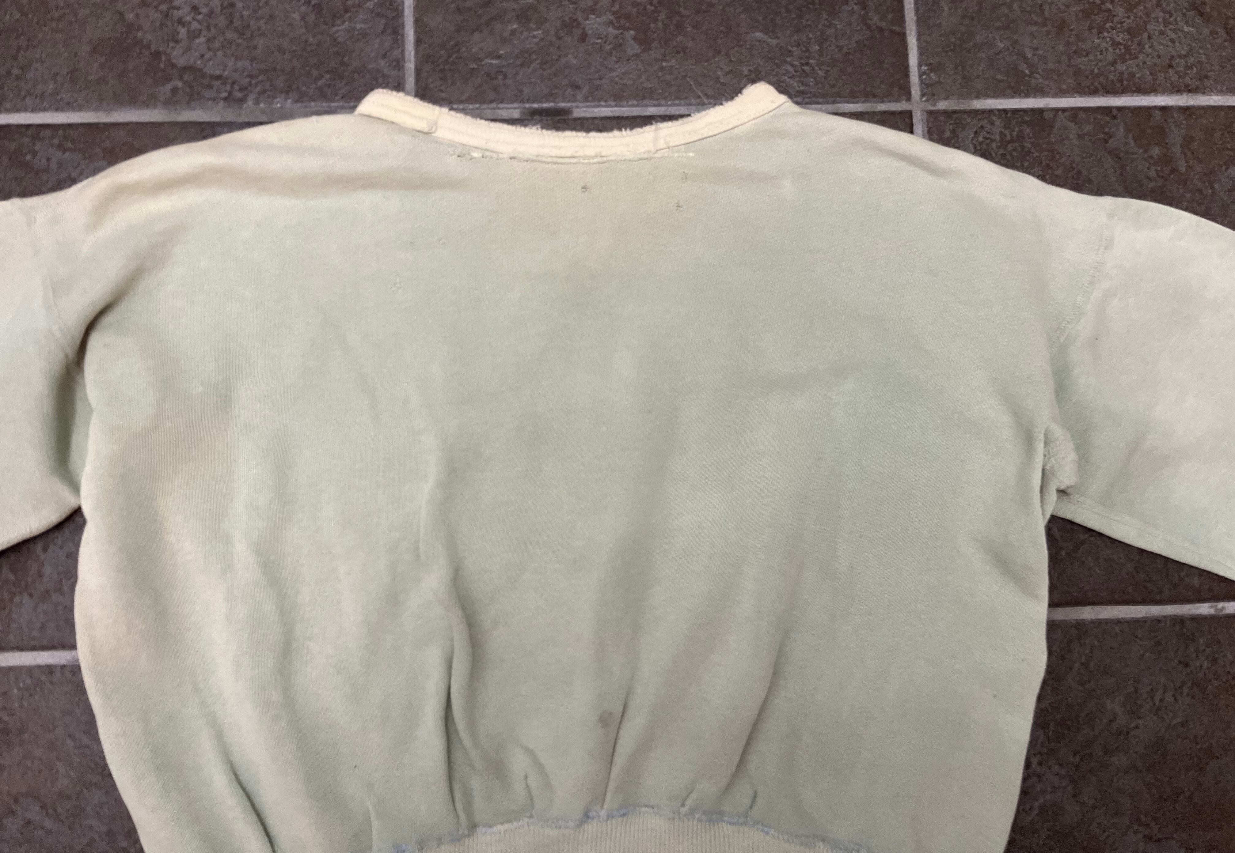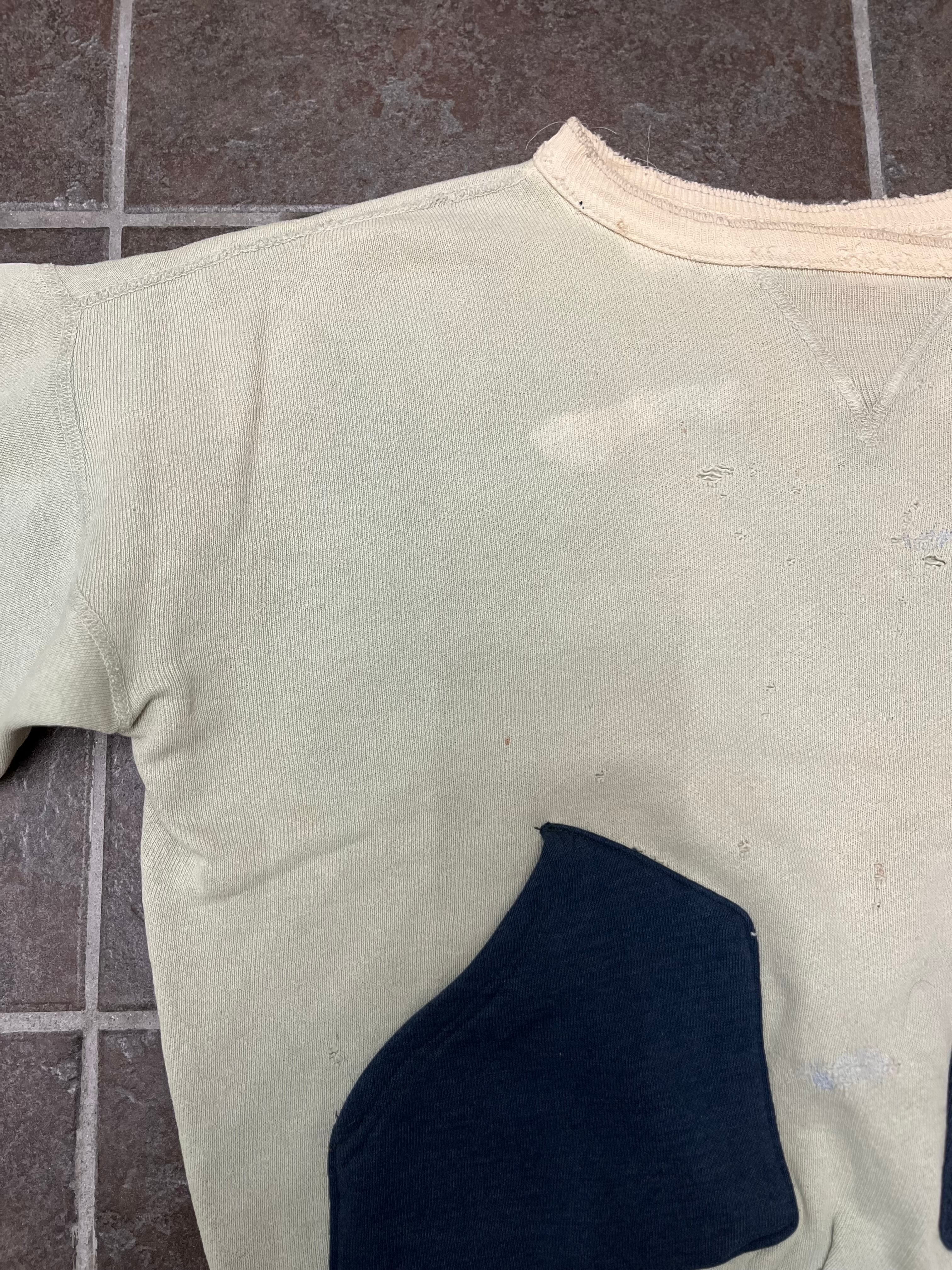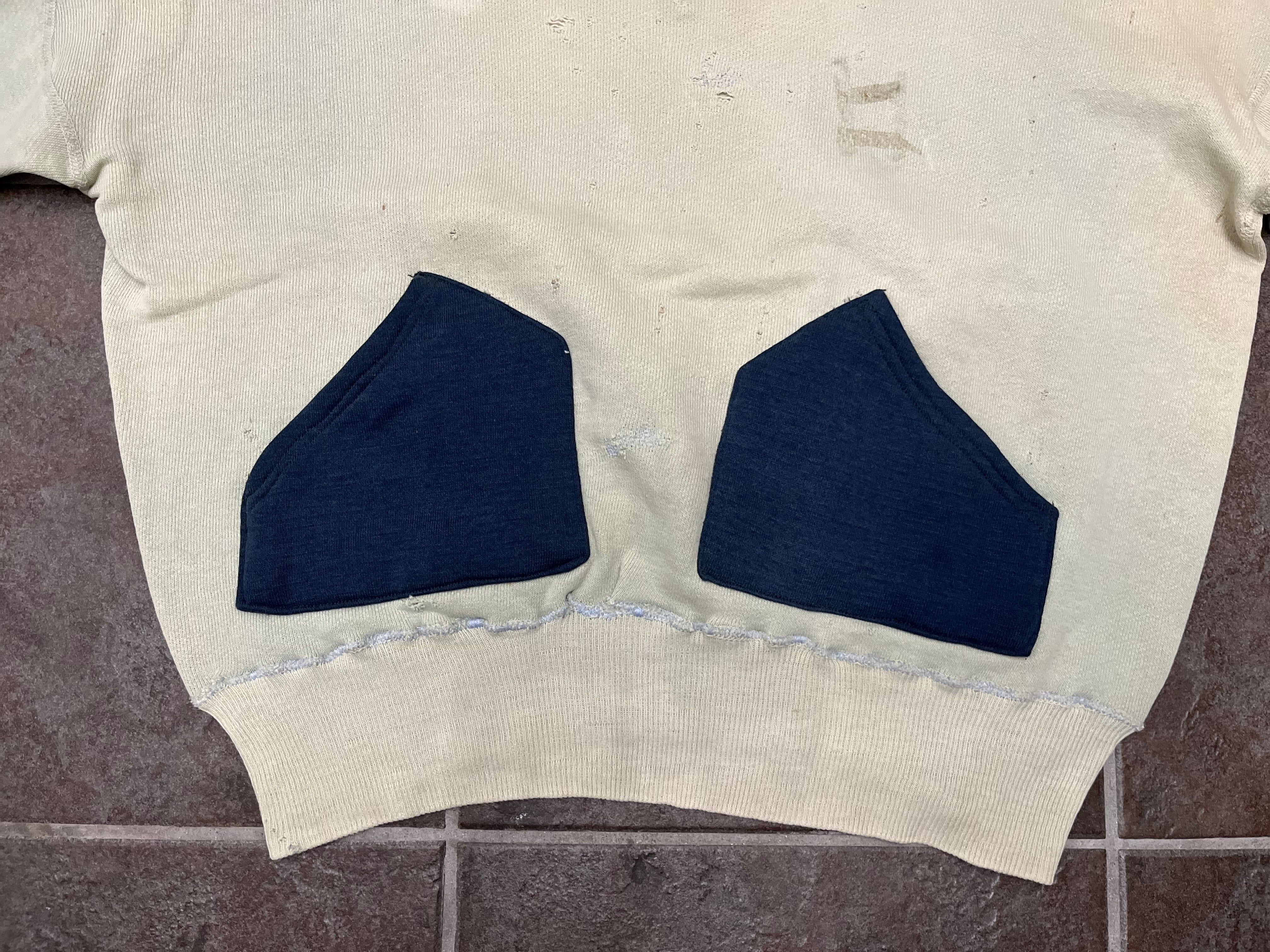 前面に後付けされたポケットはそこまで古くない生地が使われているので、リメイクされた物だと思います。リペアや傷等が多く状態はあまり良くないですが、雰囲気は抜群なスウェットです。