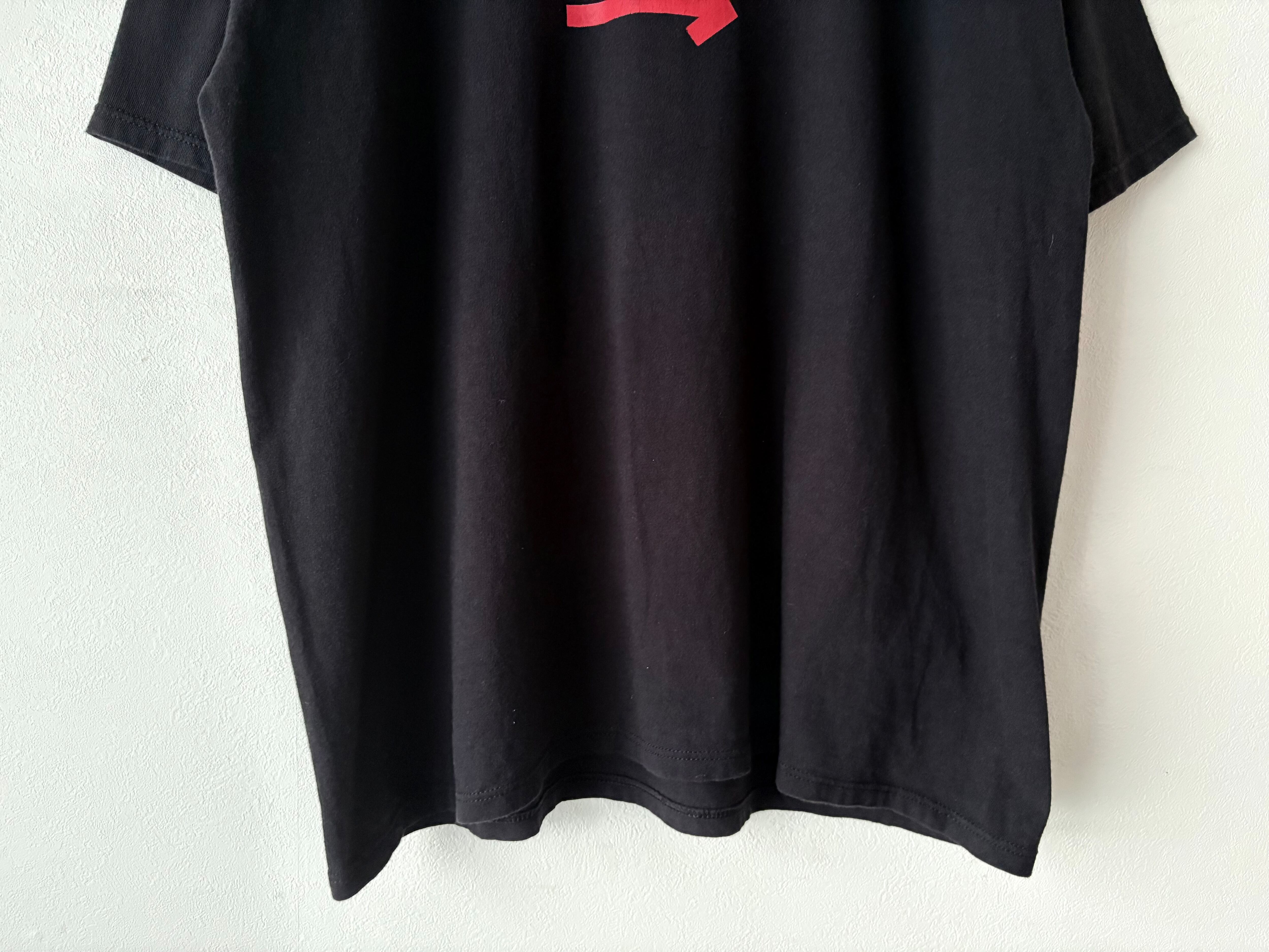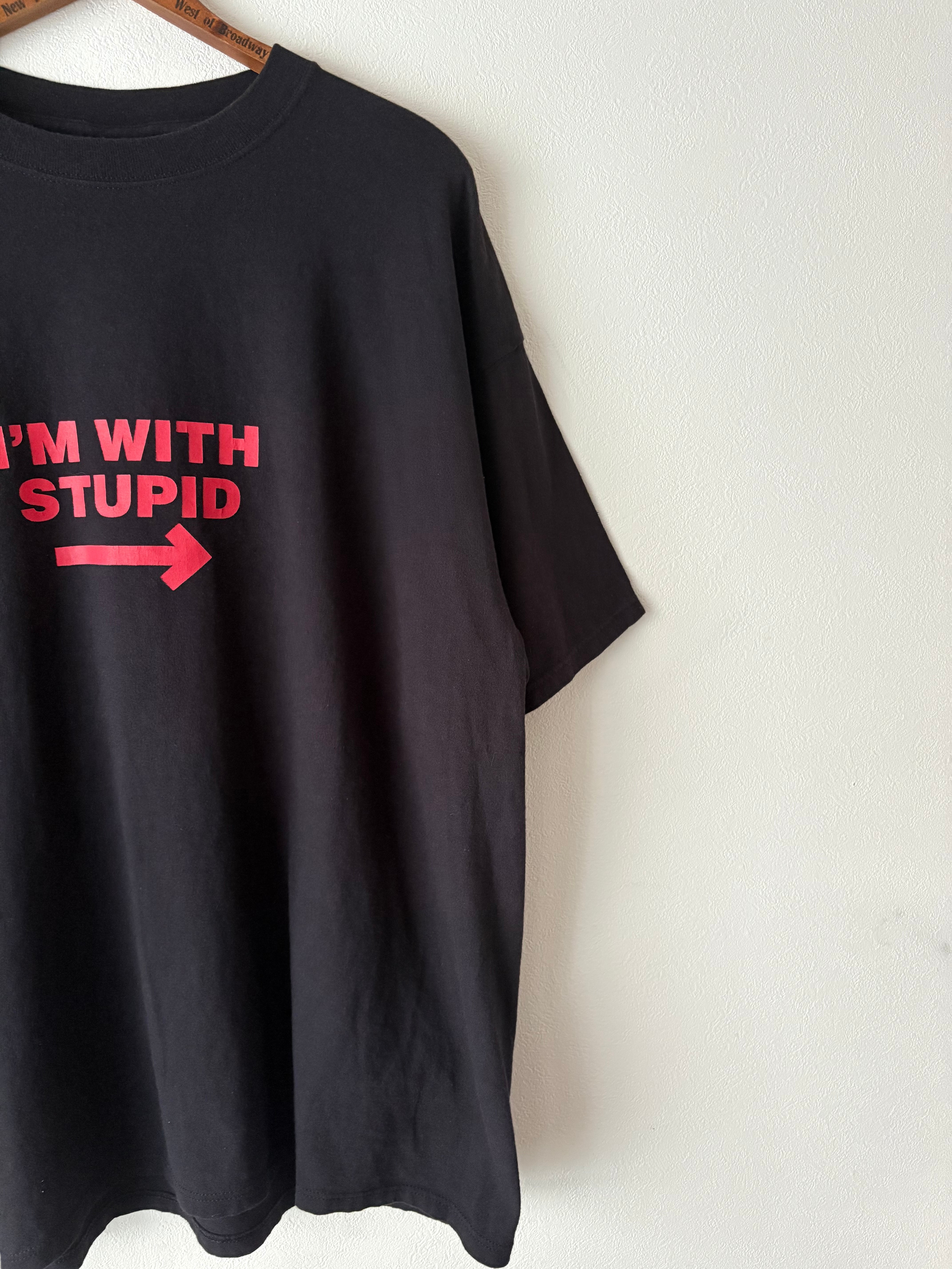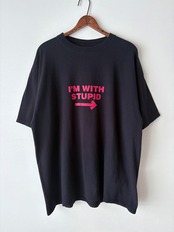 黒いボディに赤字プリントのかっこいい配色のTシャツ。"私はバカだ"とストレートかつシンプルに書かれています。身幅が広めのゆったりシルエットです。