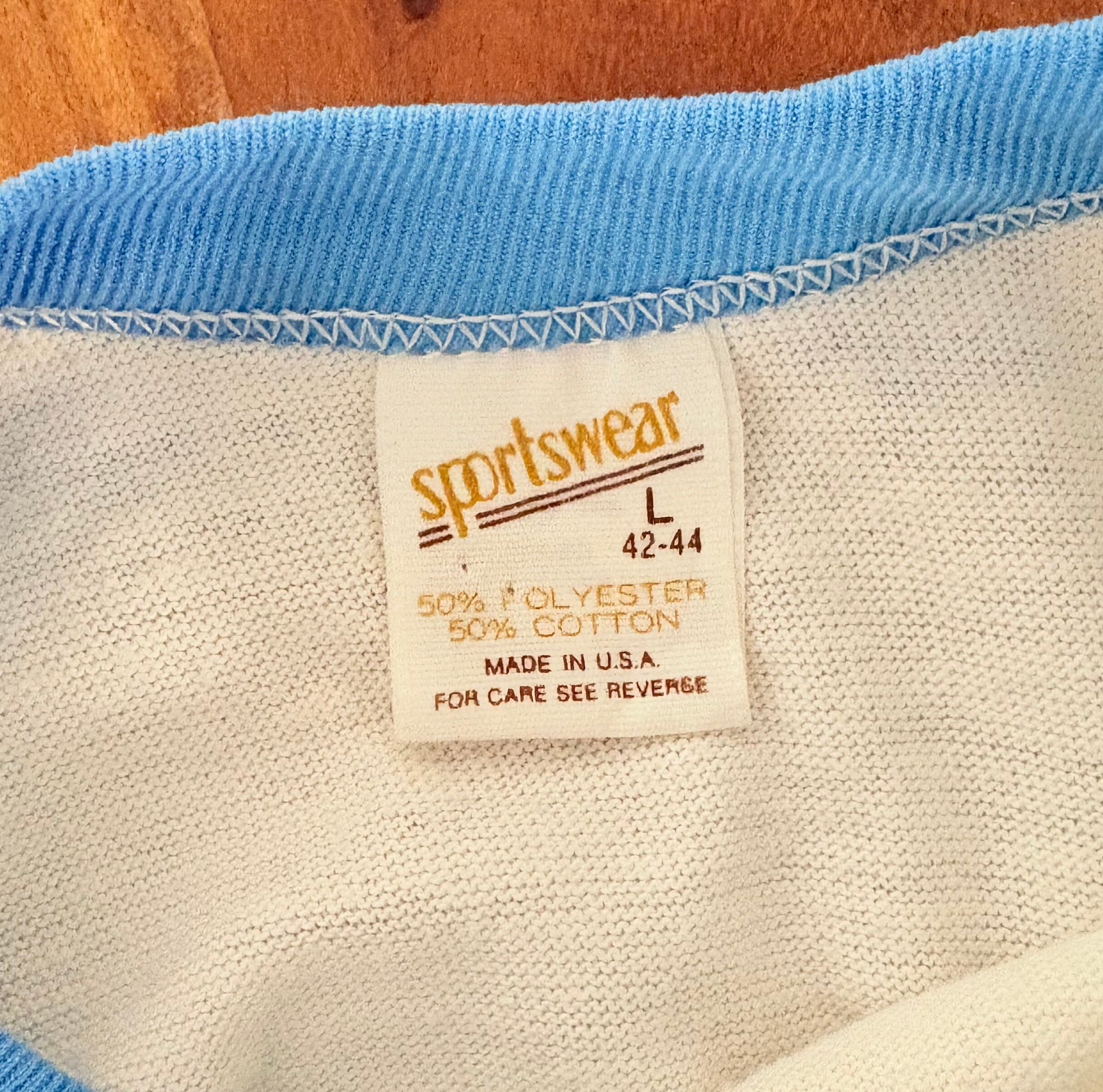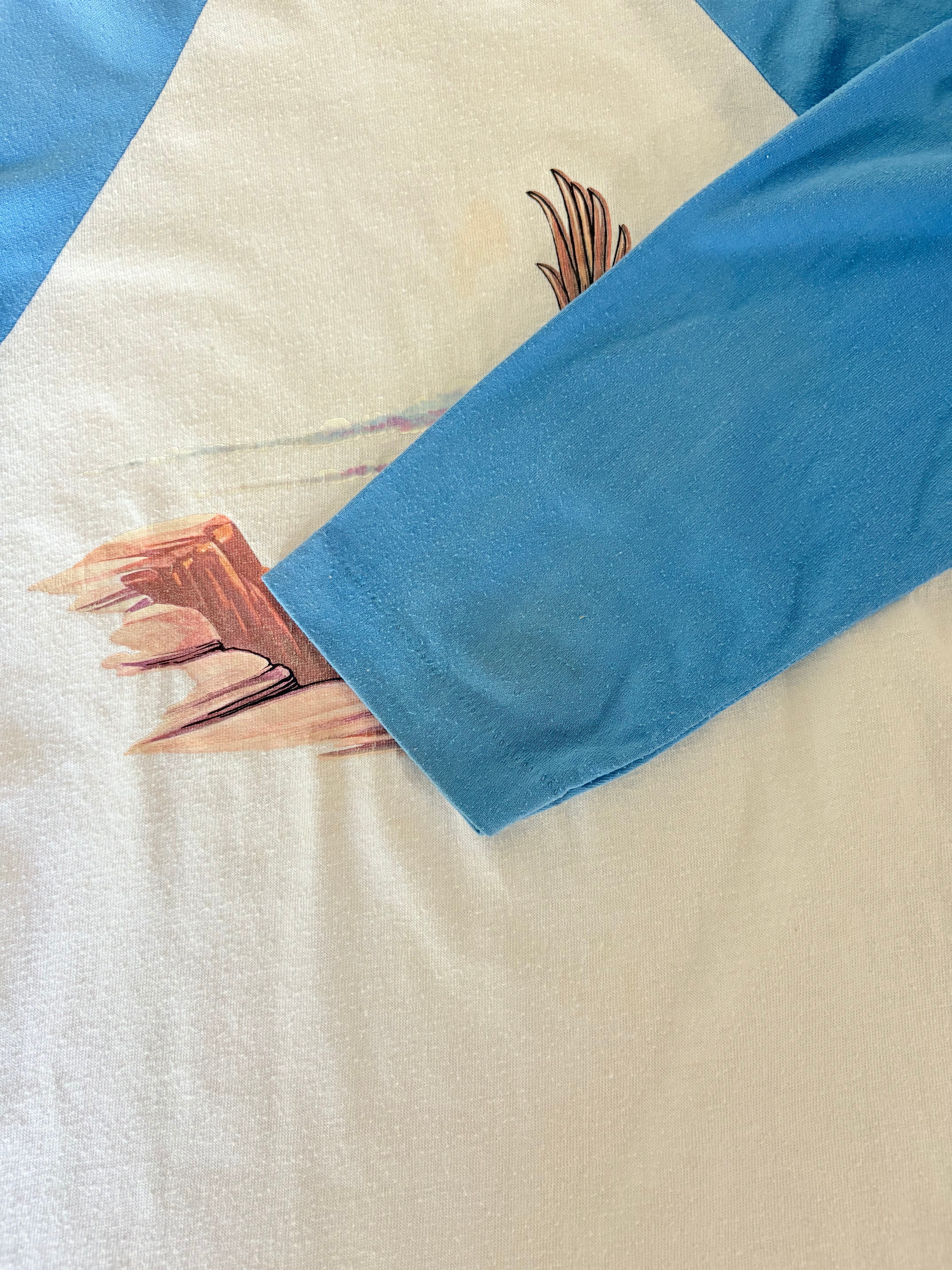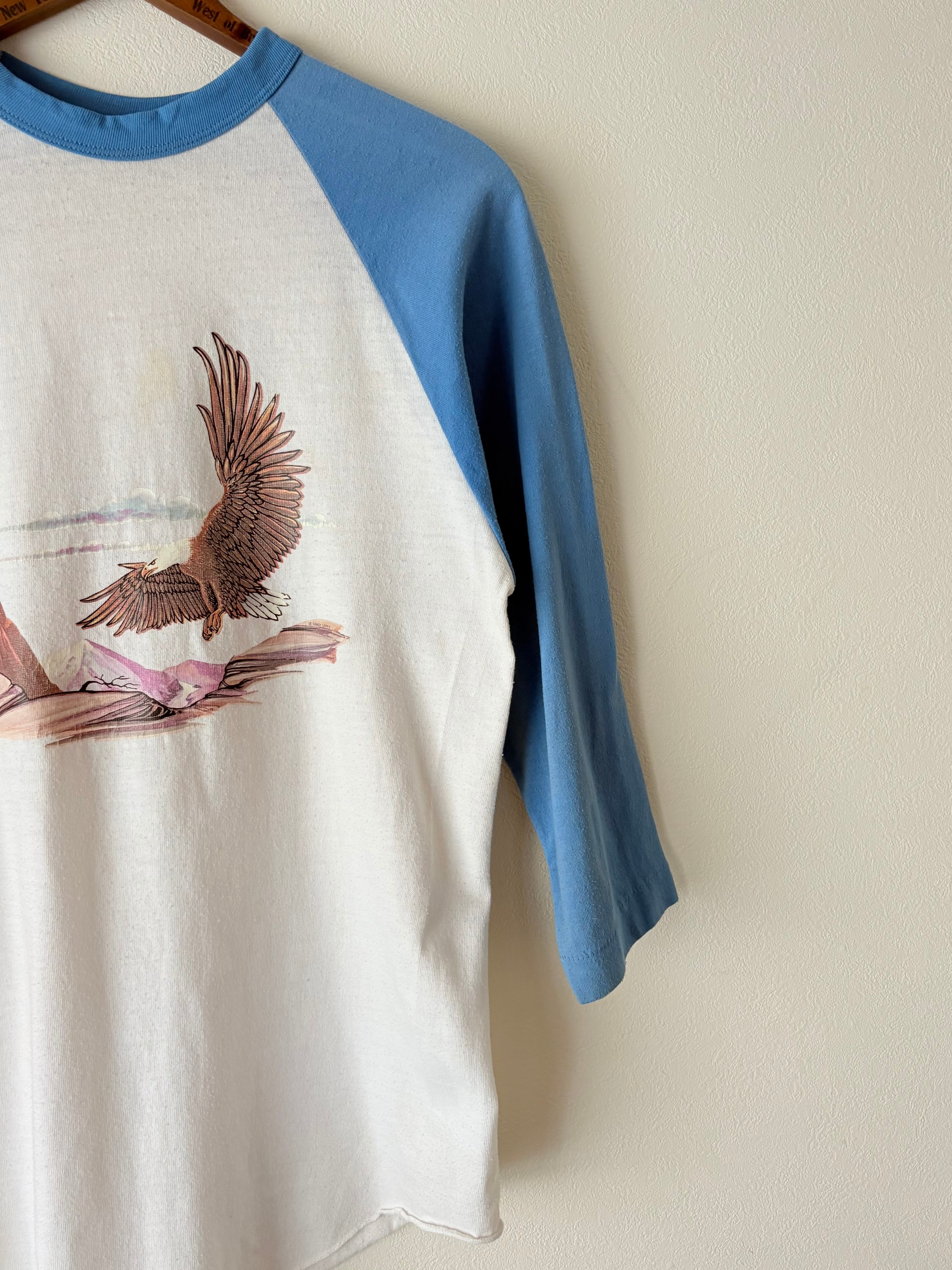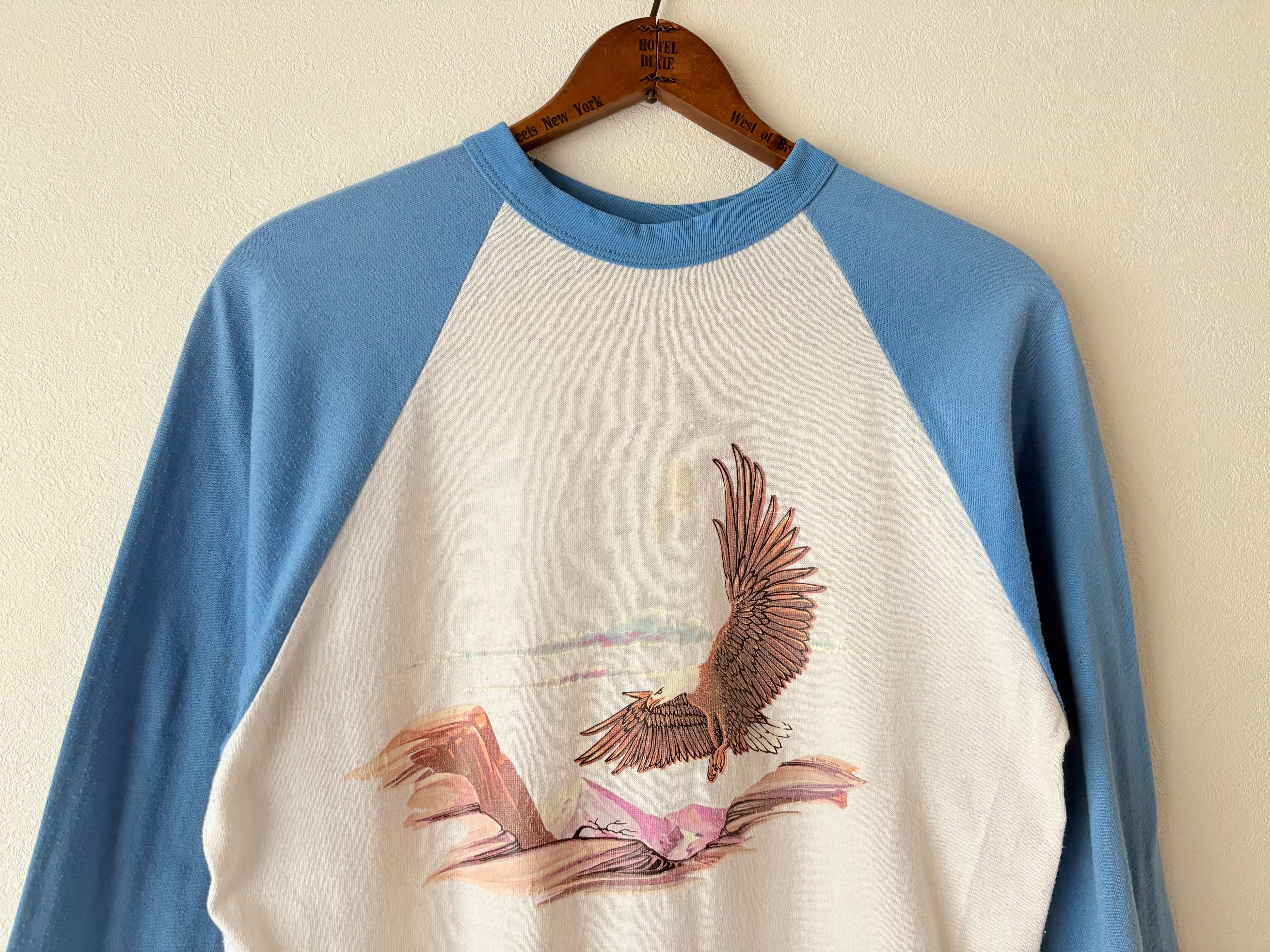 ロッキーマウンテンのようなところに鷲が飛んでいる力強いプリントです。袖のかわいい色味とプリントがミスマッチで魅力的なラグランです。