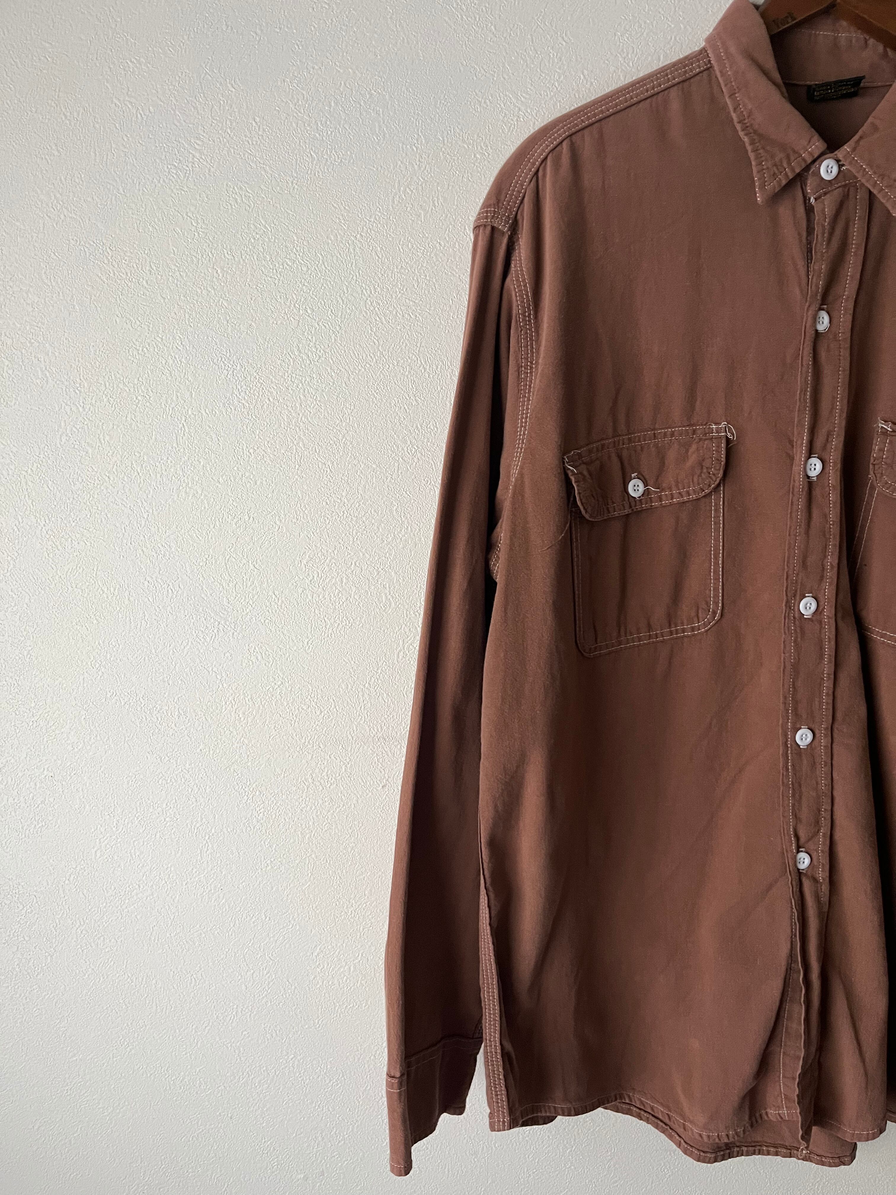 少し褪せたようななんとなく白みがかっている色のシャンブレーシャツです。写真より少し薄めの色味でテラコッタなどの陶器のような風合いです。ブラウン味が強くなく優しい雰囲気が魅力です。