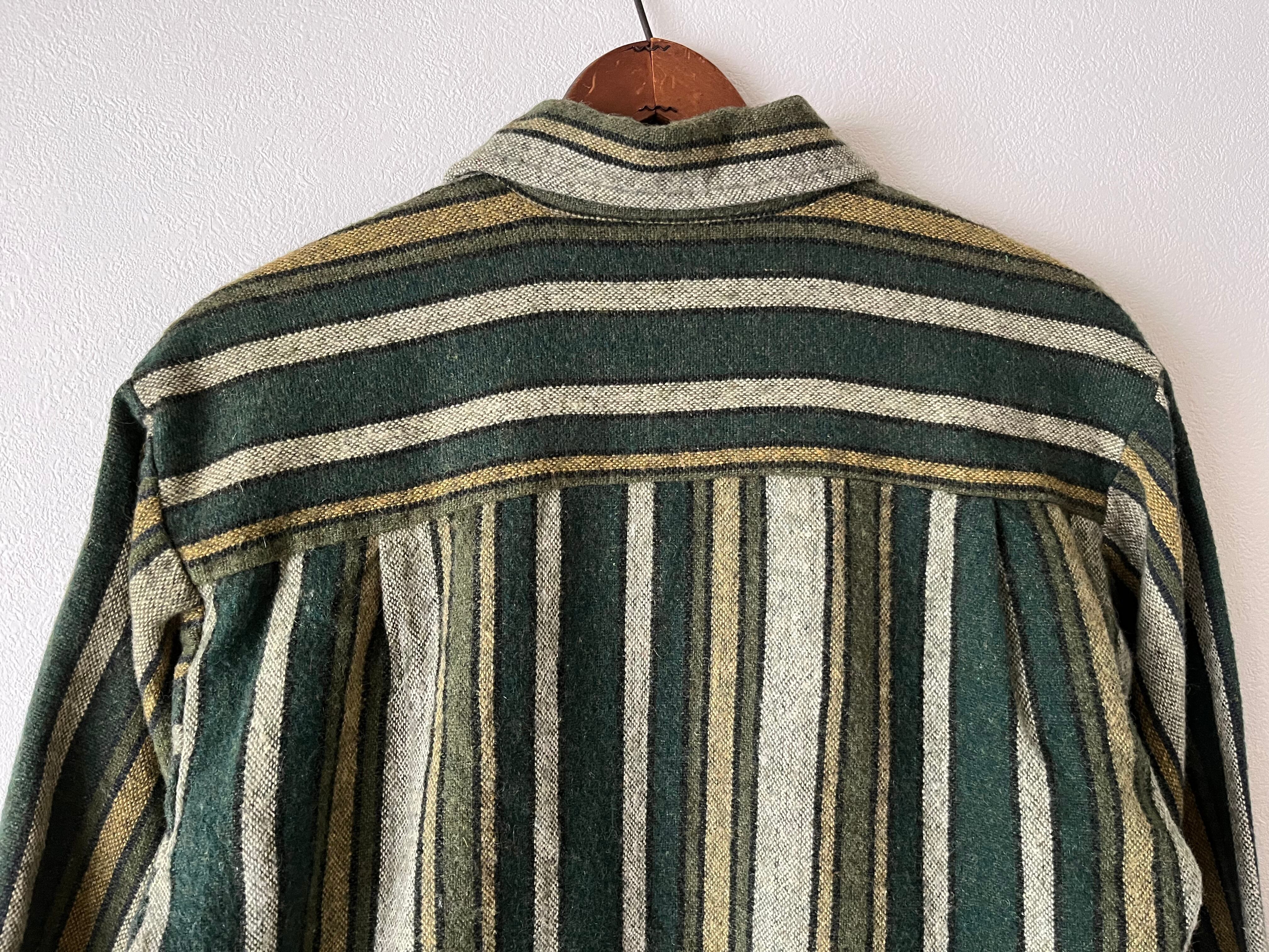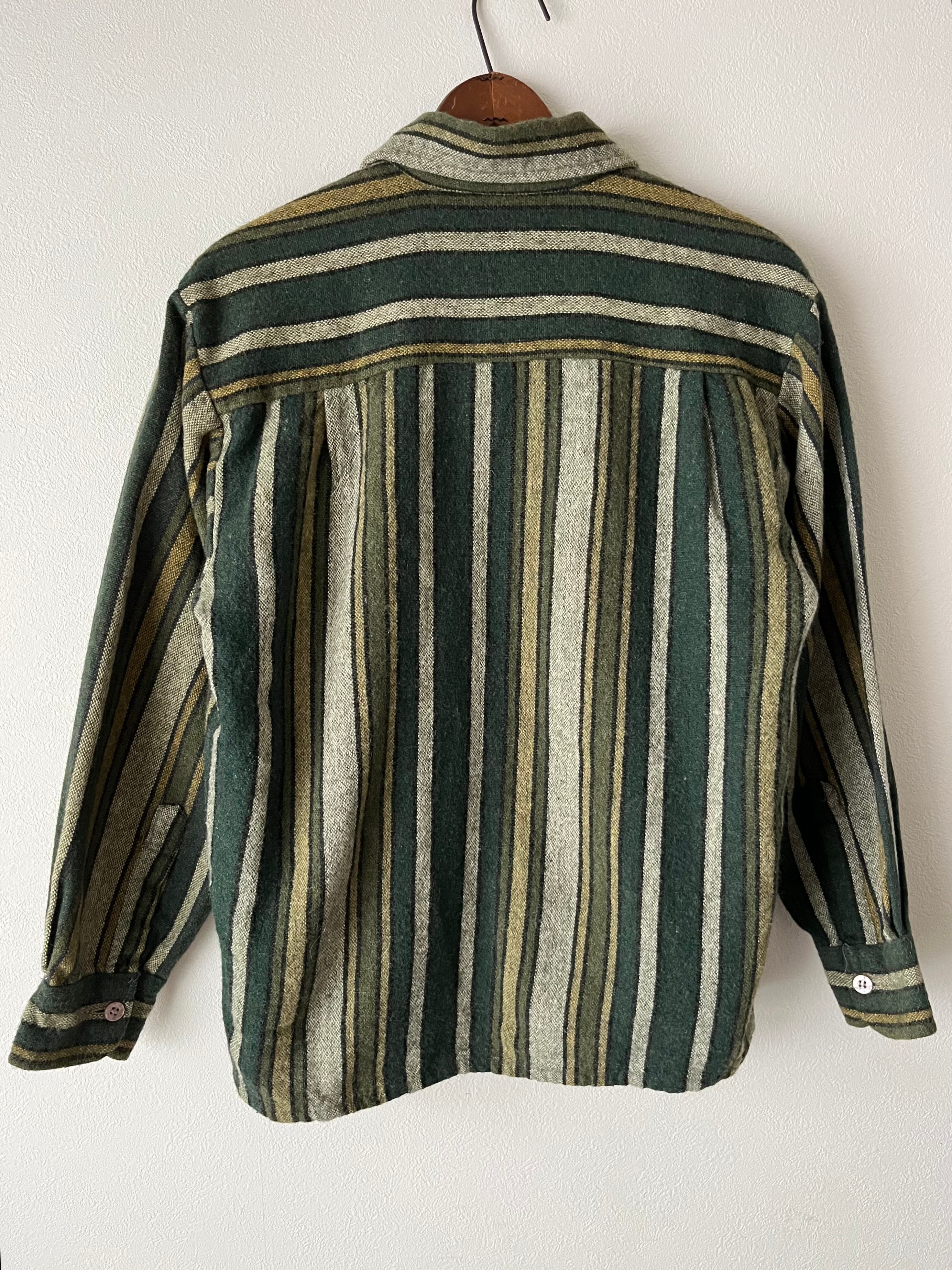 少し厚めのウールシャツです。ワイドなボックスシルエットで、ボトムスとバランスが取りやすいです。ストライプが均一ではなくレトロな風合いが可愛いシャツです。